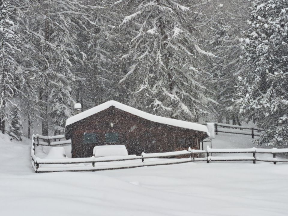 25 cm Neuschnee im Waldbereich. Über der Waldgrenze weggeblasen. Nur in Mulden Neuschnee vorhanden, daneben Altschnee krustig.