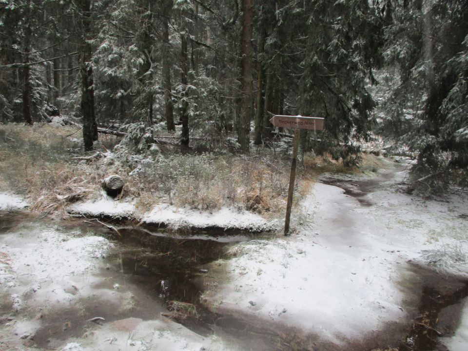 Leichte bis mittlere Schneeschauer, sowie gelegentliche Trockenphasen. Leichte Minusgrade, vom vorhergesagten stürmischen Wind war wenig zu spüren. Alles weiß, bislang jedoch nur wenige Zentimeter. Wasser war sicher noch ein Thema, mit Vorteil also mit Gamaschen. Kein Eis, die mitgebrachten Grödeln verblieben im Rucksack. Insgesamt ließen sich die Pfade noch gut begehen und auch problemlos auffinden.