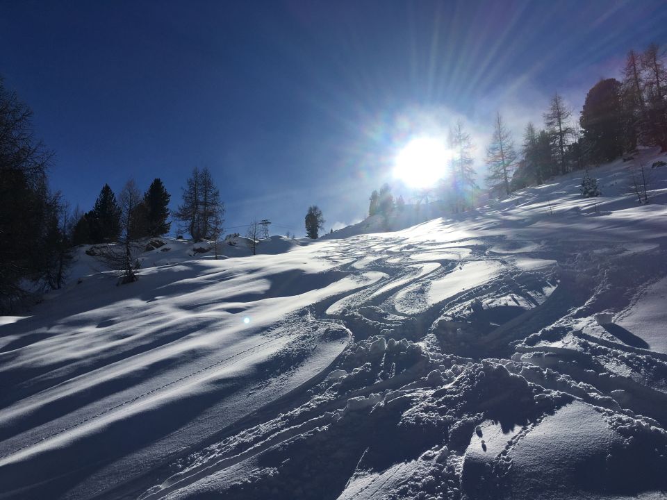 Kalte Tour mit Pulverschnee im unteren Teil und pickelharter Schnee im Gipfelbereich. Start 9.15 Uhr Parkplatz Diavolezza, minus 9 Grad, starker Nordwind und leicht bewölkt. Im unteren Teil schöner Aufstieg im Pulverschnee, ab Punkt 2375 Hartschnee durch den Sturm vom Samstag. Extrem starker böiger Nordwind bis Gipfel, aber ausser in der Nordflanke des Punktes 2487 immer in der Sonne. Abfahrt meist in Pulverschnee, im unteren Teil richtig super! Es hat ca. 20 cm Neuschnee in der Gegend am Berninapass. Kuppen alle abgeblasen. Die Bergbahn Diavolezza ist ausser Betrieb und öffnet am 24. Dezember.