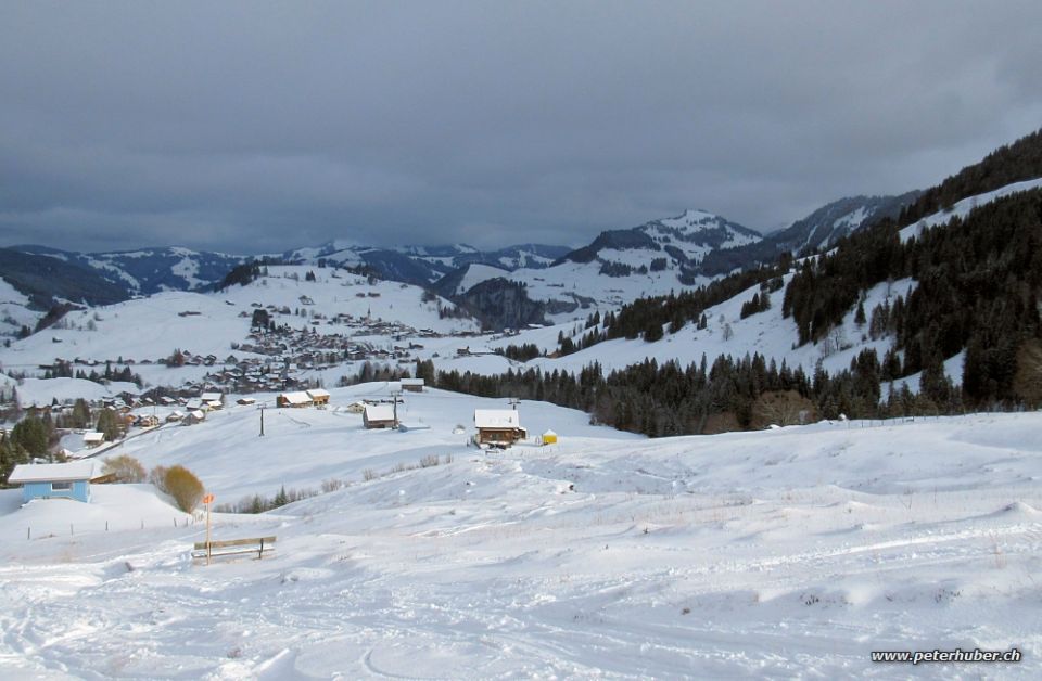 Zuerst bedeckt, später einige Aufhellungen. Ab Tschalun hat es durchgehend Schnee. Unten ca. 15 cm, auf der Wiese reicht das gut. Wir sind durch die Mördergruobi aufgestiegen (ab 1.12. bitte meiden - empfohlenes Wildschutzgebiet). Herrlich verschneit. Im oberen Teil fast 50 cm Schnee insgesamt.