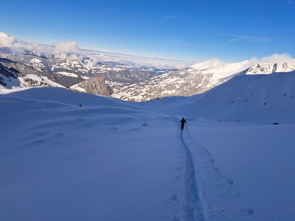 Oberhalb Bütschi 1937m bis Gipfel 30-40cm teils mit eisiger Unterlage im Gipfelbereich, aber in rinnen und Mulden mit Pulverschnee pur schön zu fahren