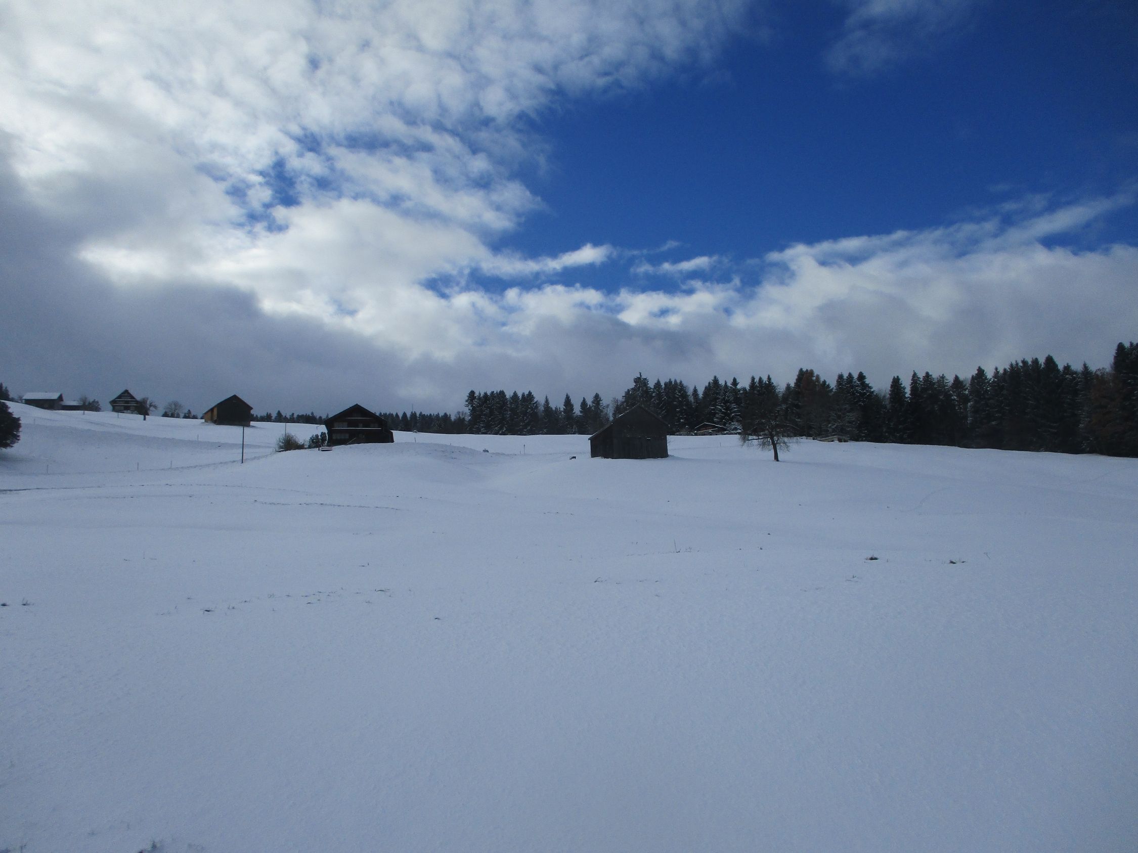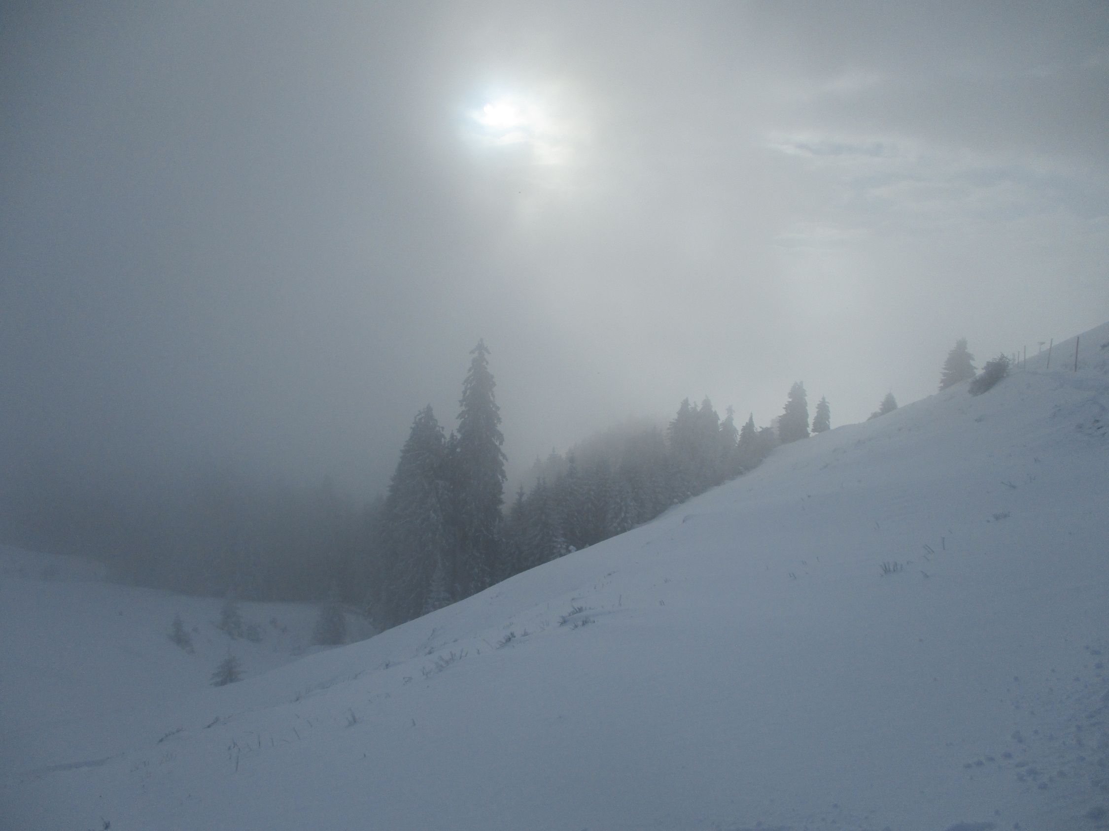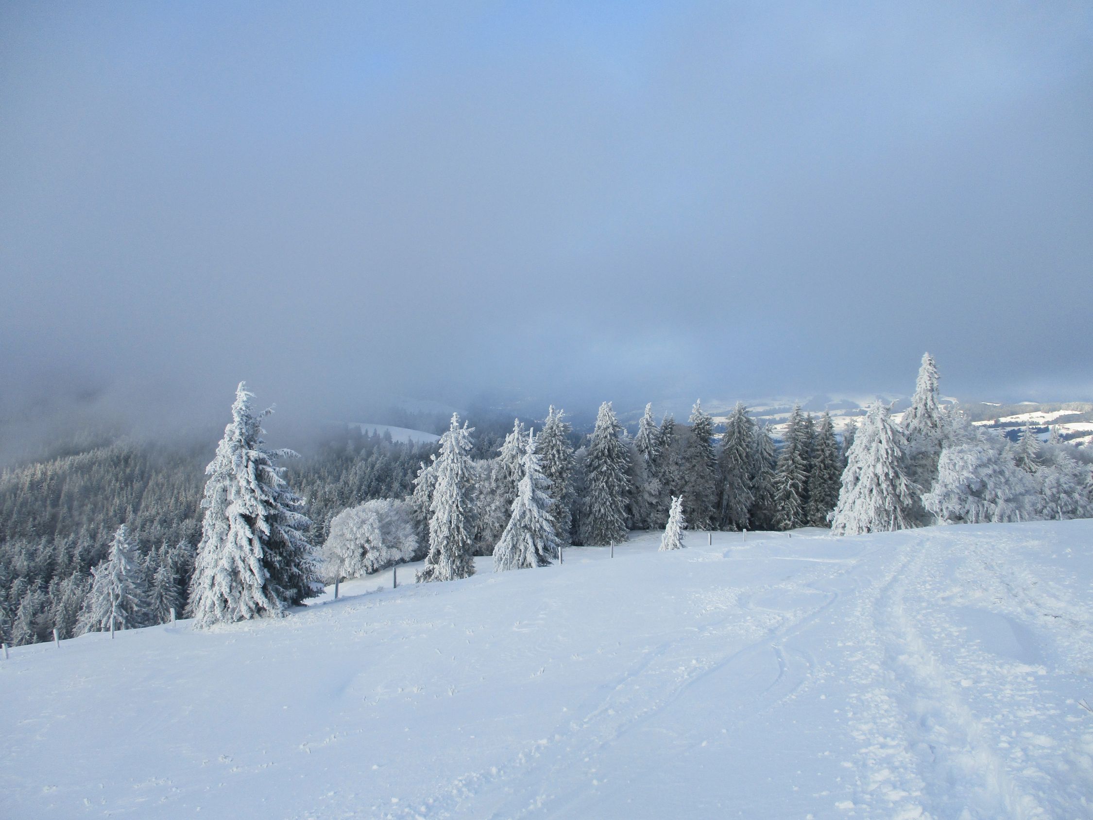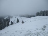 Weiß schon ab Ebnat-Kappel, die ersten 100 hm allerdings nur ein dünner Pflodder überm Gras. Danach Wechsel von eingewehten Pulverpads und fast aufs Gras freigewehten Passagen. Ab 1200 m dann nennenswerte Schneemengen, weiter oben sogar ordentlich, wohl mehr als ein halber Meter.