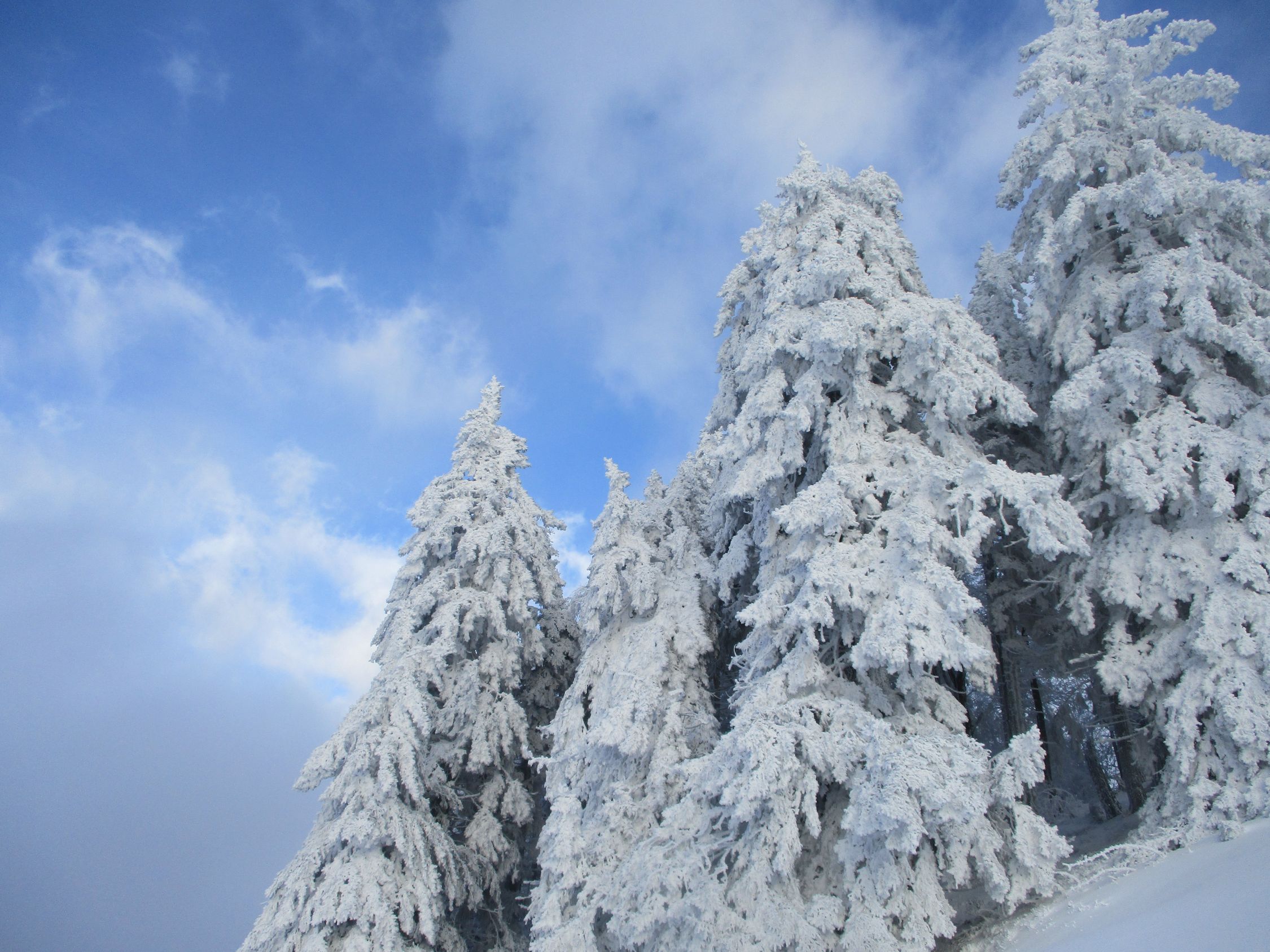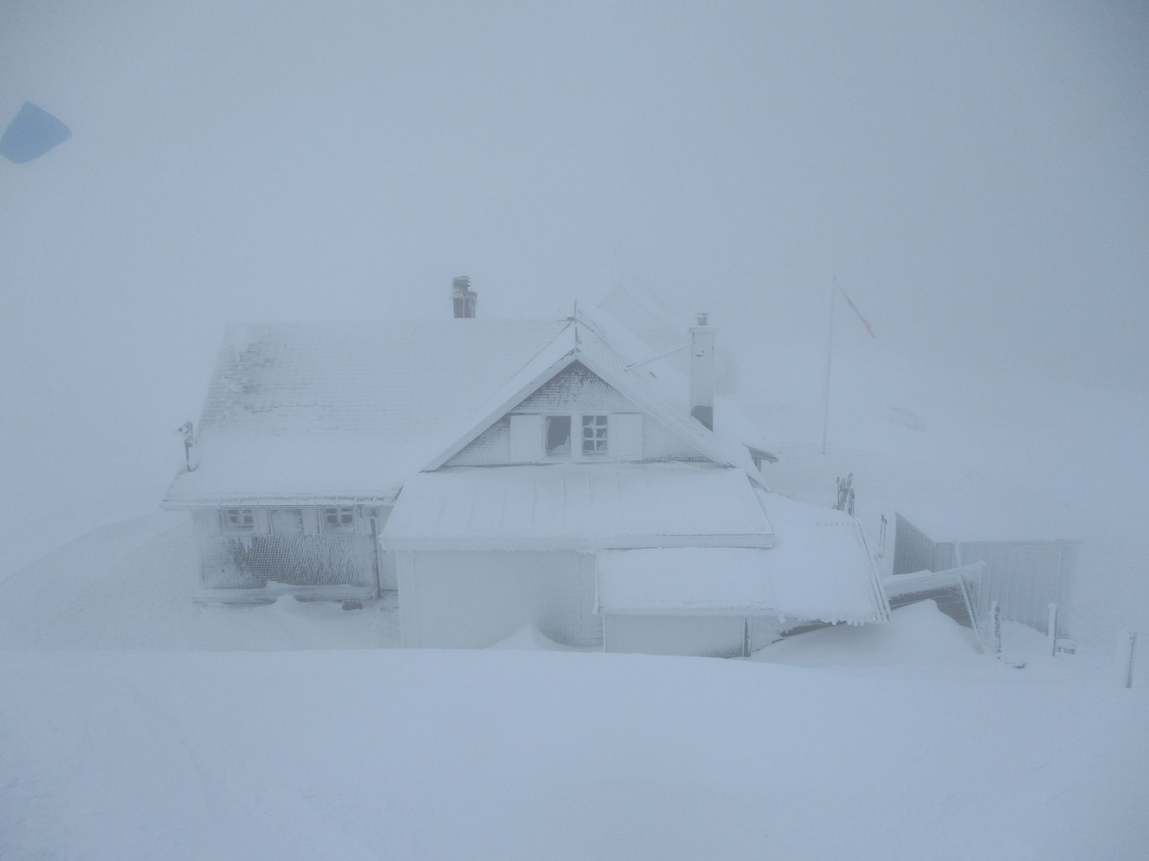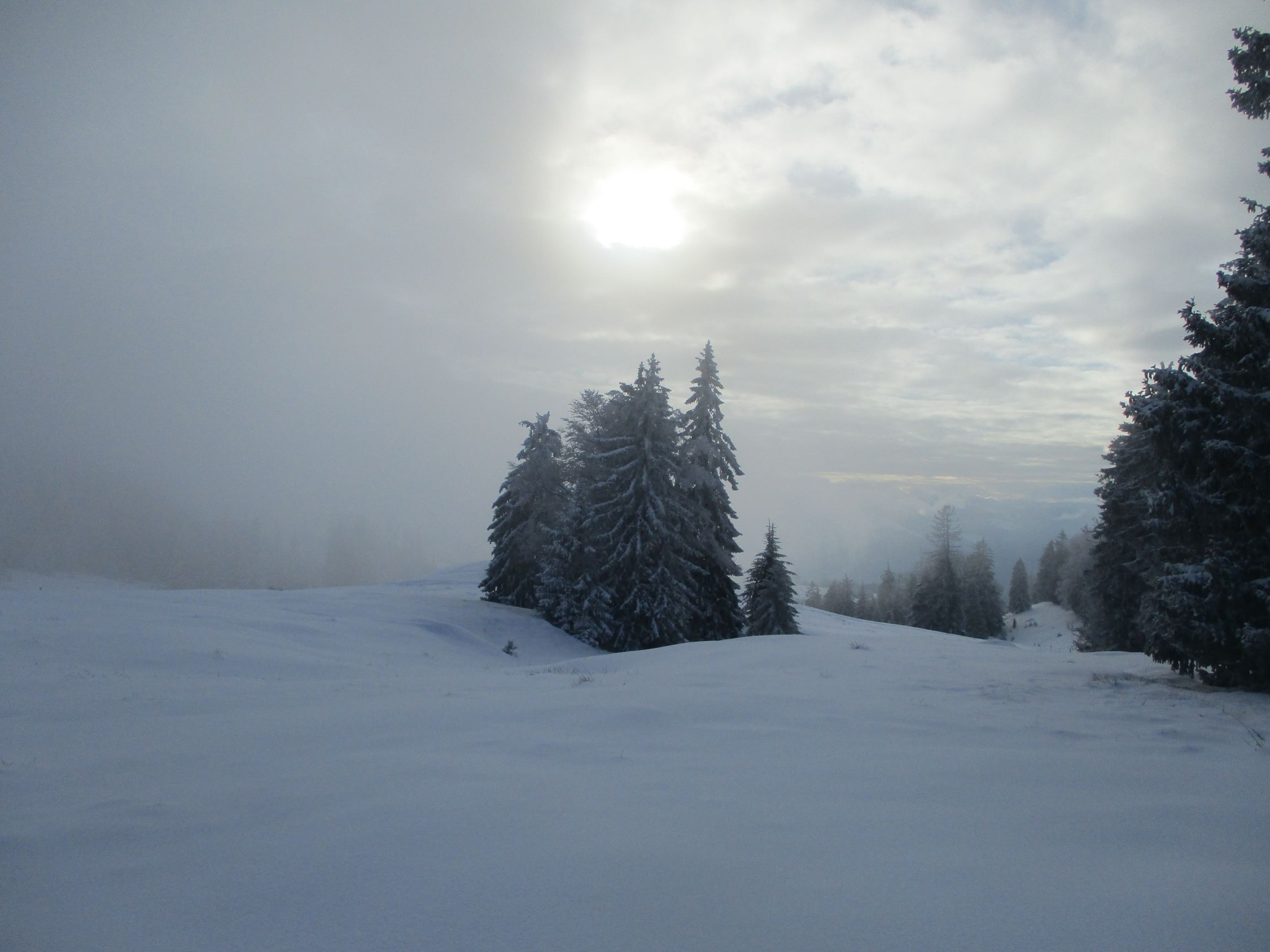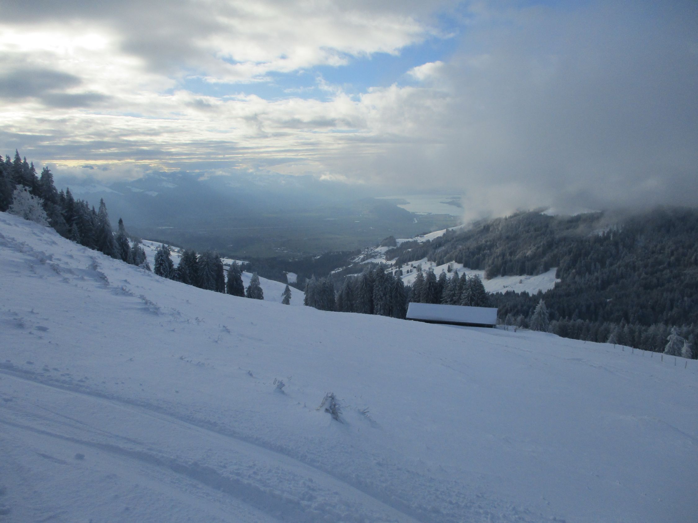 Weiß schon ab Ebnat-Kappel, die ersten 100 hm allerdings nur ein dünner Pflodder überm Gras. Danach Wechsel von eingewehten Pulverpads und fast aufs Gras freigewehten Passagen. Ab 1200 m dann nennenswerte Schneemengen, weiter oben sogar ordentlich, wohl mehr als ein halber Meter.