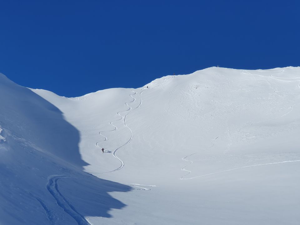 Pulver, unten 30cm mit wenig Unterlage, Schneehöhe schnell zunehmend. Bei Abfahrt unten Schnee nass an der Sonne.