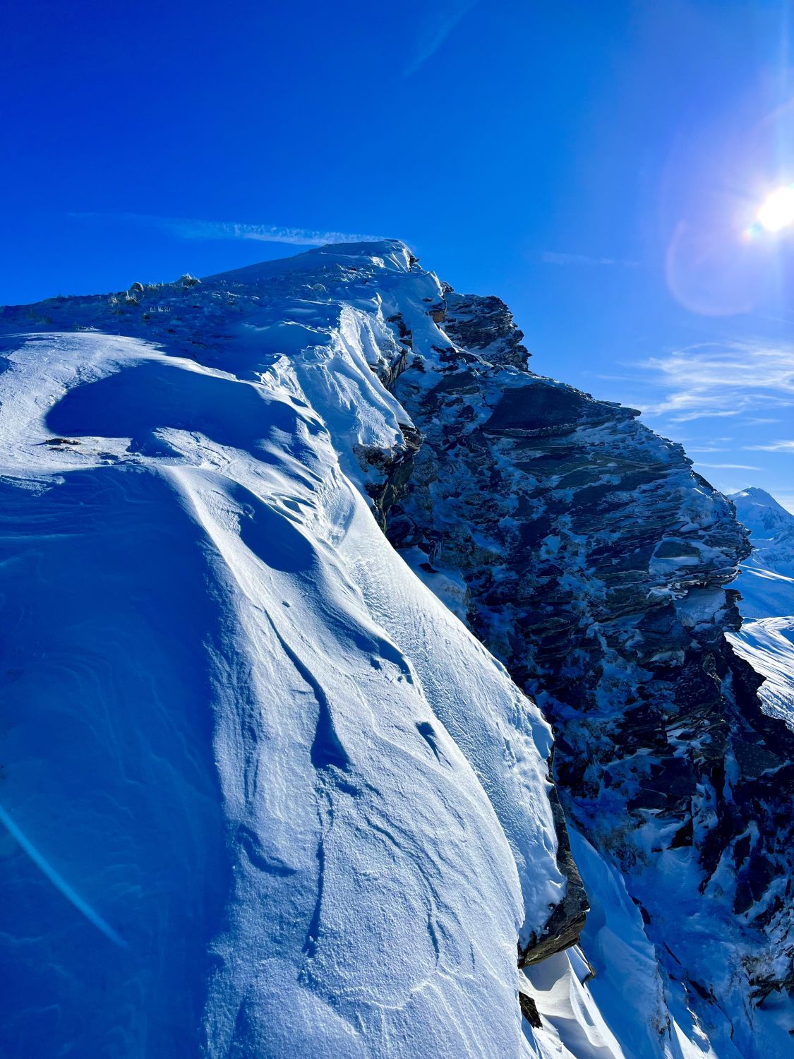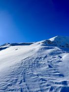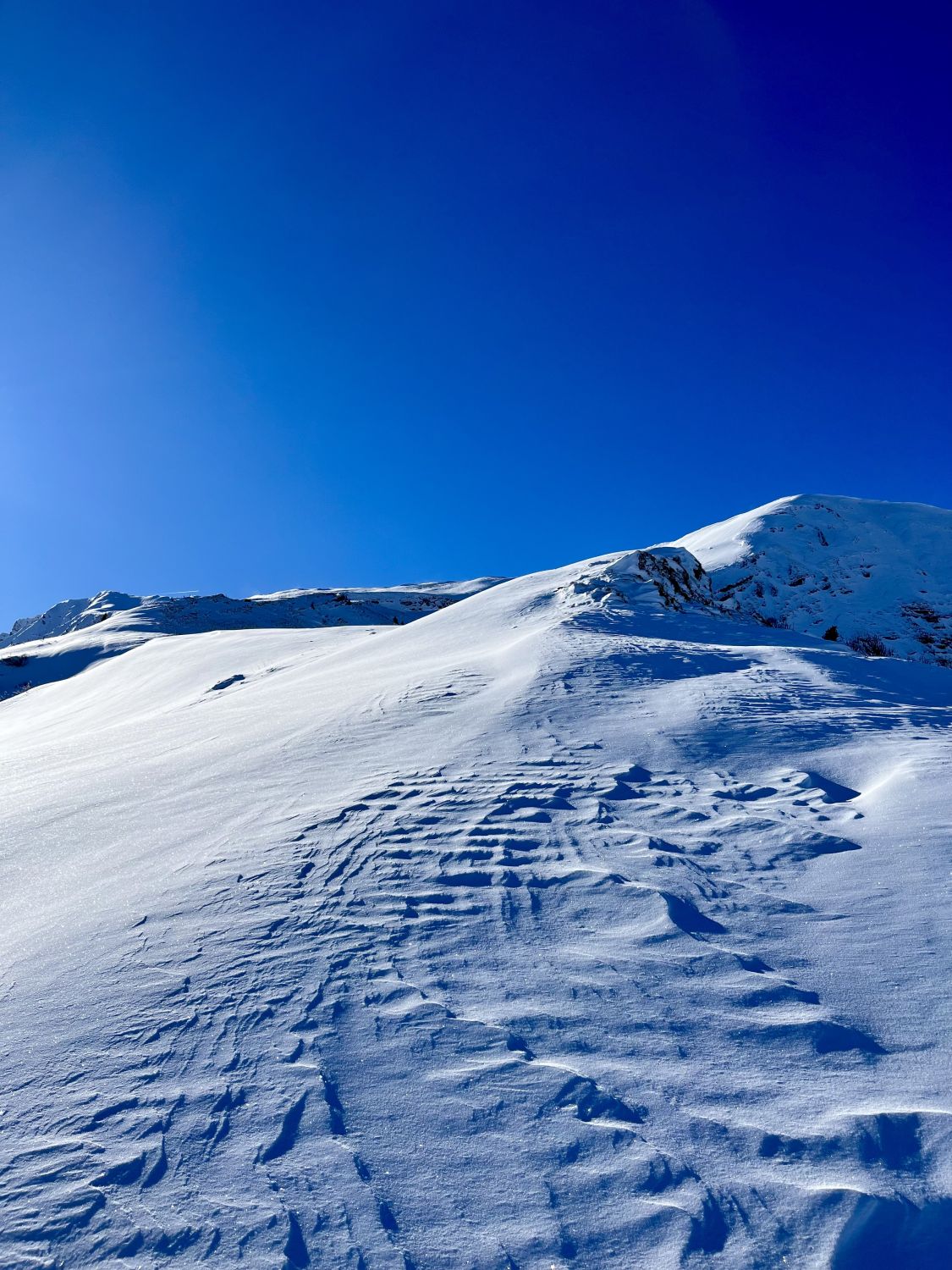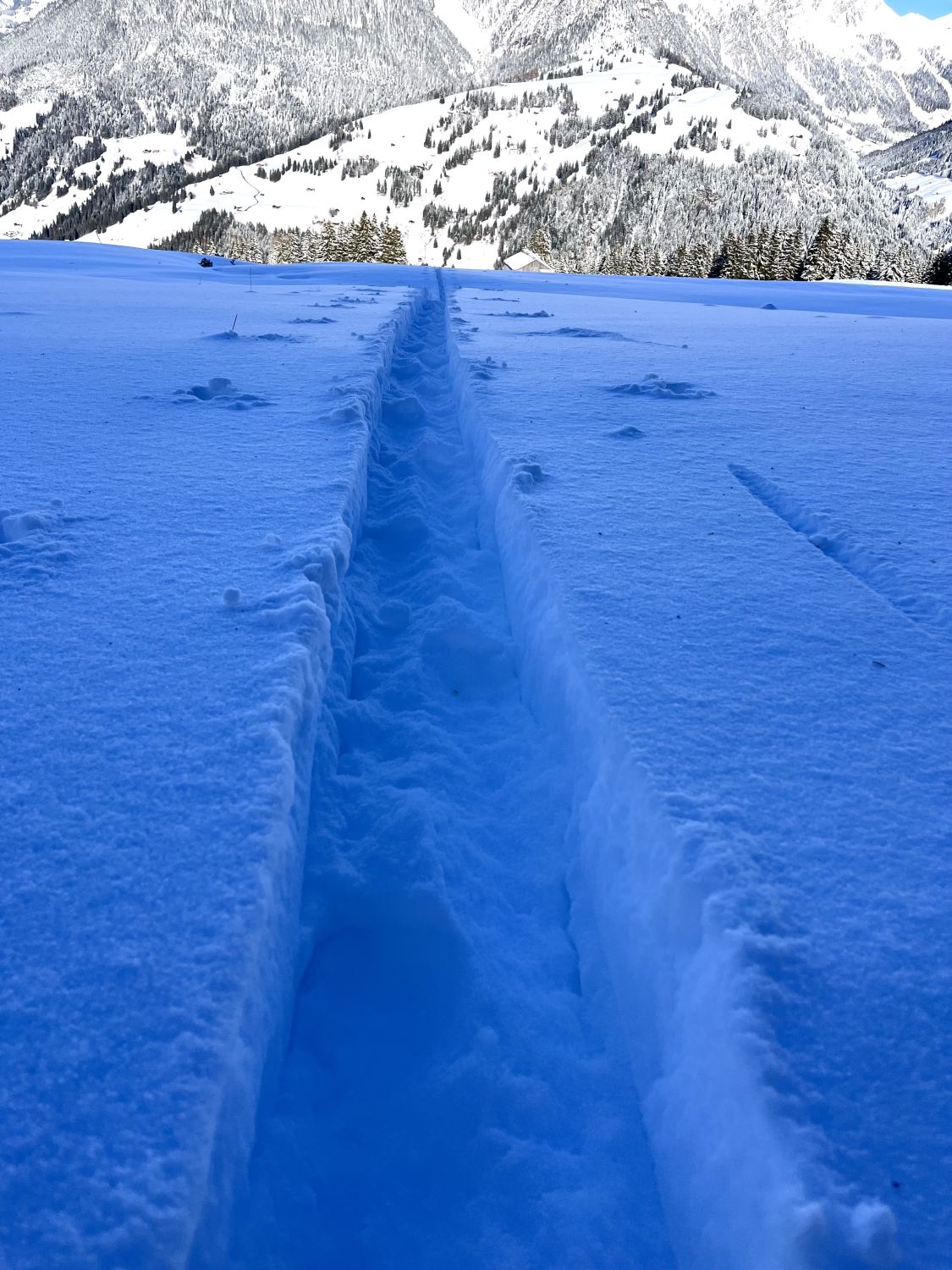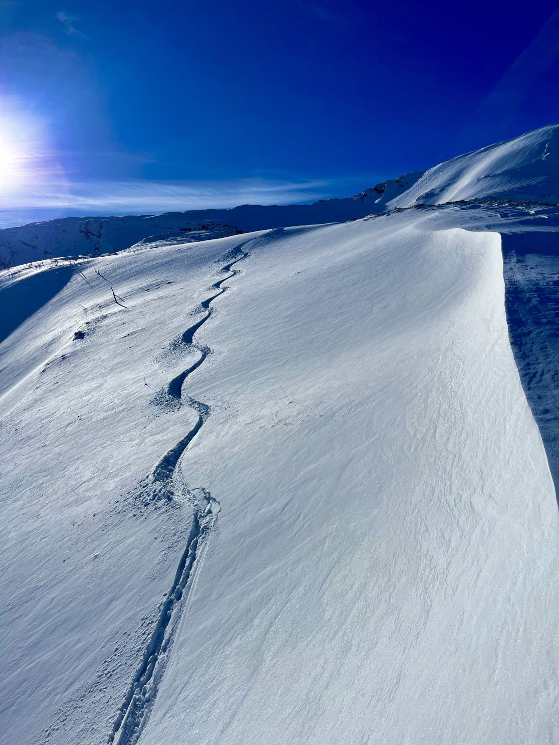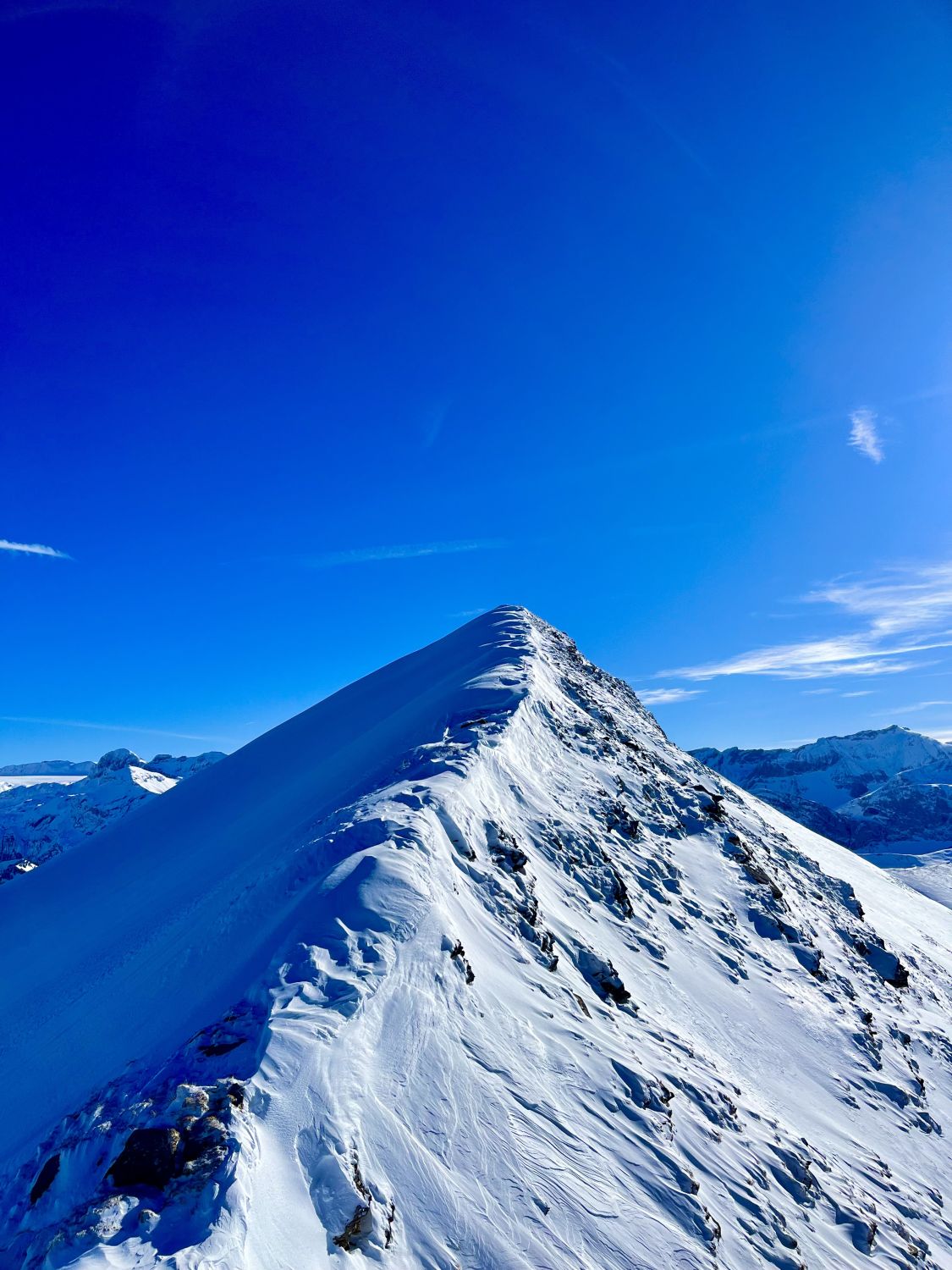 Top Verhältnisse. Im Talboden in St. Stephan hat es noch zu wenig Schnee. Bin Richtung Dürrenwald hochgefahren bis in die Kurve unterhalb Untere Ougstebode auf 1333 Meter. Ab dieser Höhe hat es eine gute Schneeunterlage mit ca. 20-30 cm Neuschnee. Dann nimmt die Schnehöhe zu bis ca. 40 cm. Es war harte Spurarbeit. Der Pulverschnee ist bis auf den Gipfel wunderschön. In Kammnähe ist der Schnee zum Teil Windgepresst. Es gab kein Steinkontakt. Traumhaft schönes Wetter und angenehm warm. Auf dem Gipfel hatte es leichten Wind. Flöschorn ist ganz abgewindet und nicht lohnend