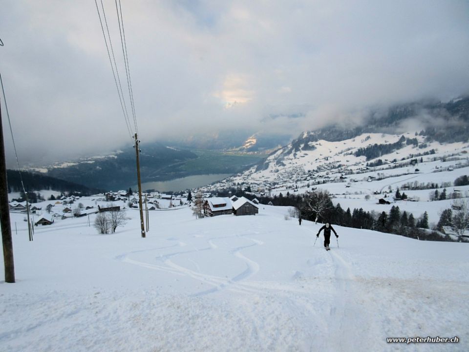 Abfahrt: Durchgehend traumhaft. Sonne bis fast ins Dorf hinunter. An den Rändern konnten wir noch eigene Linien ziehen. Wer sucht, der findet. Ganz unten hat es eine leichte Kruste, die überschneit ist. Stört aber nicht so.