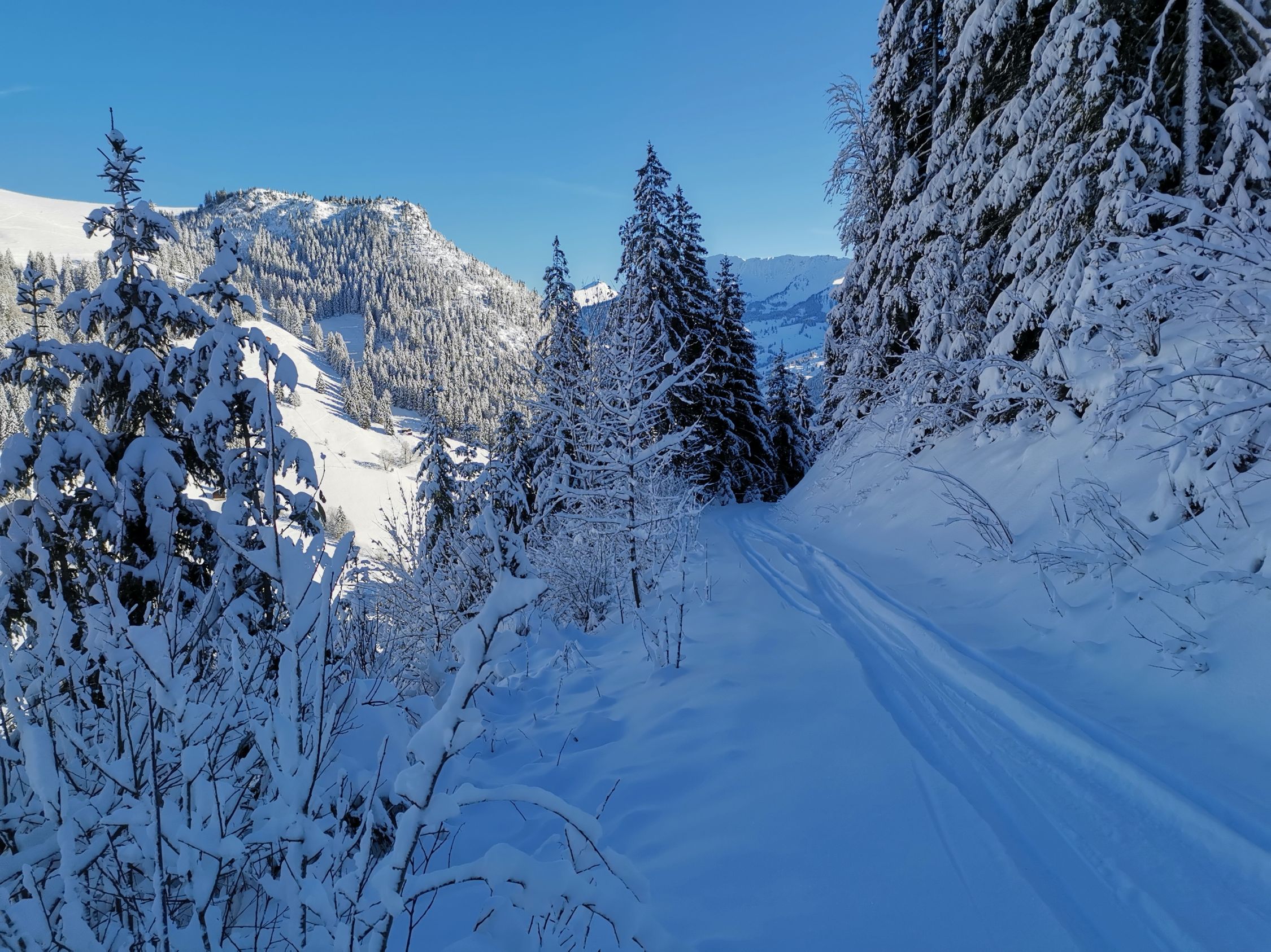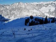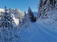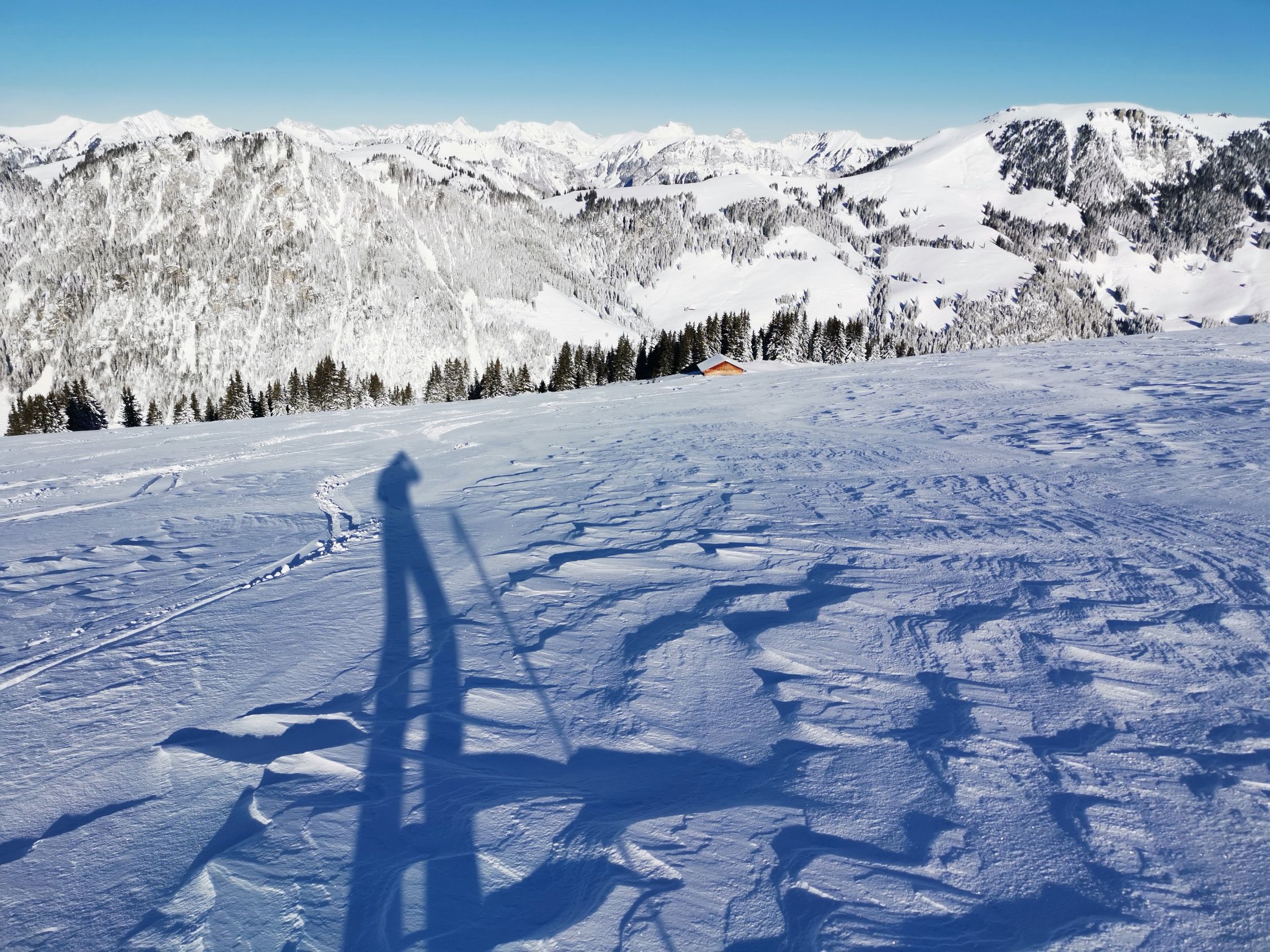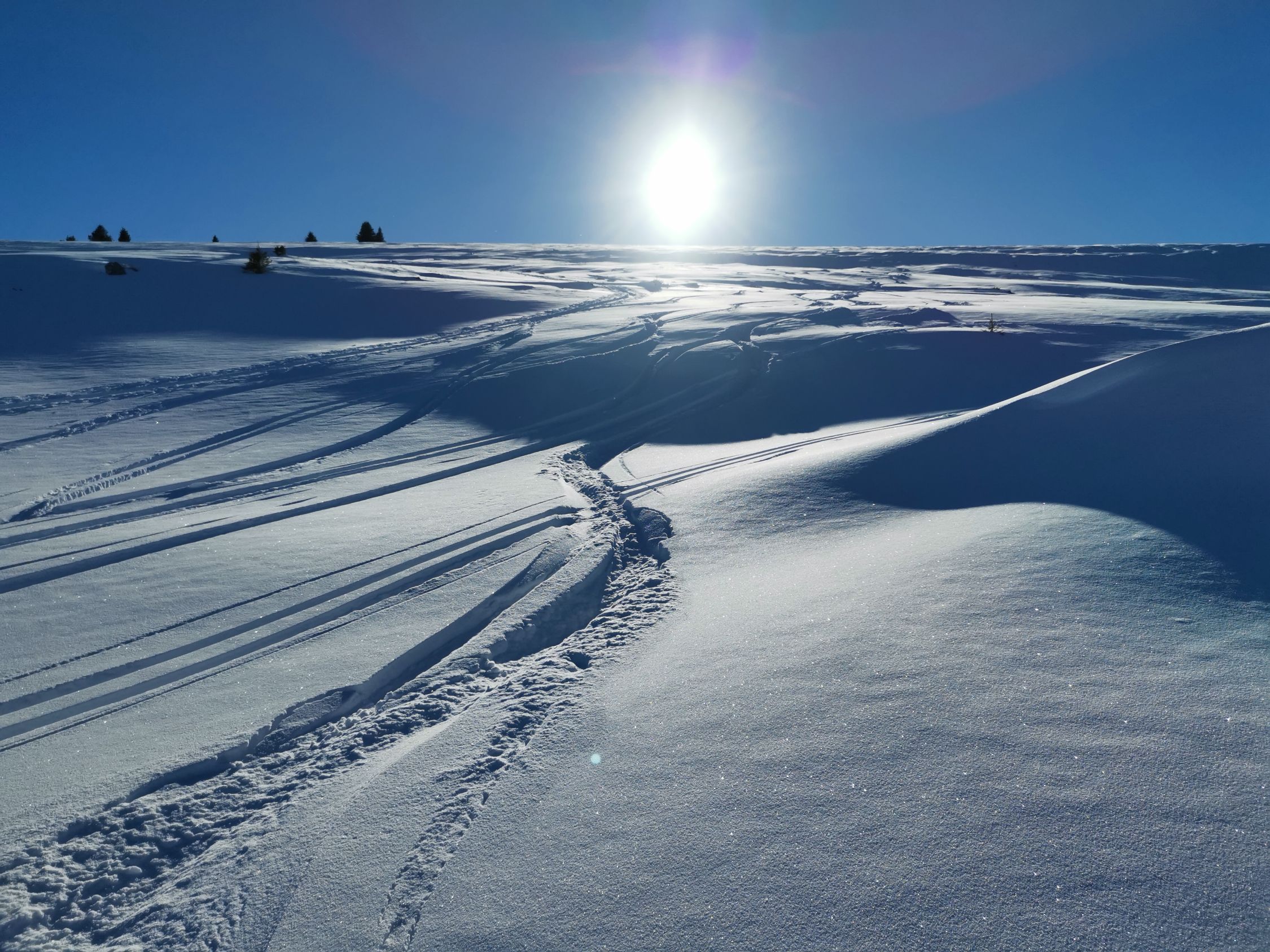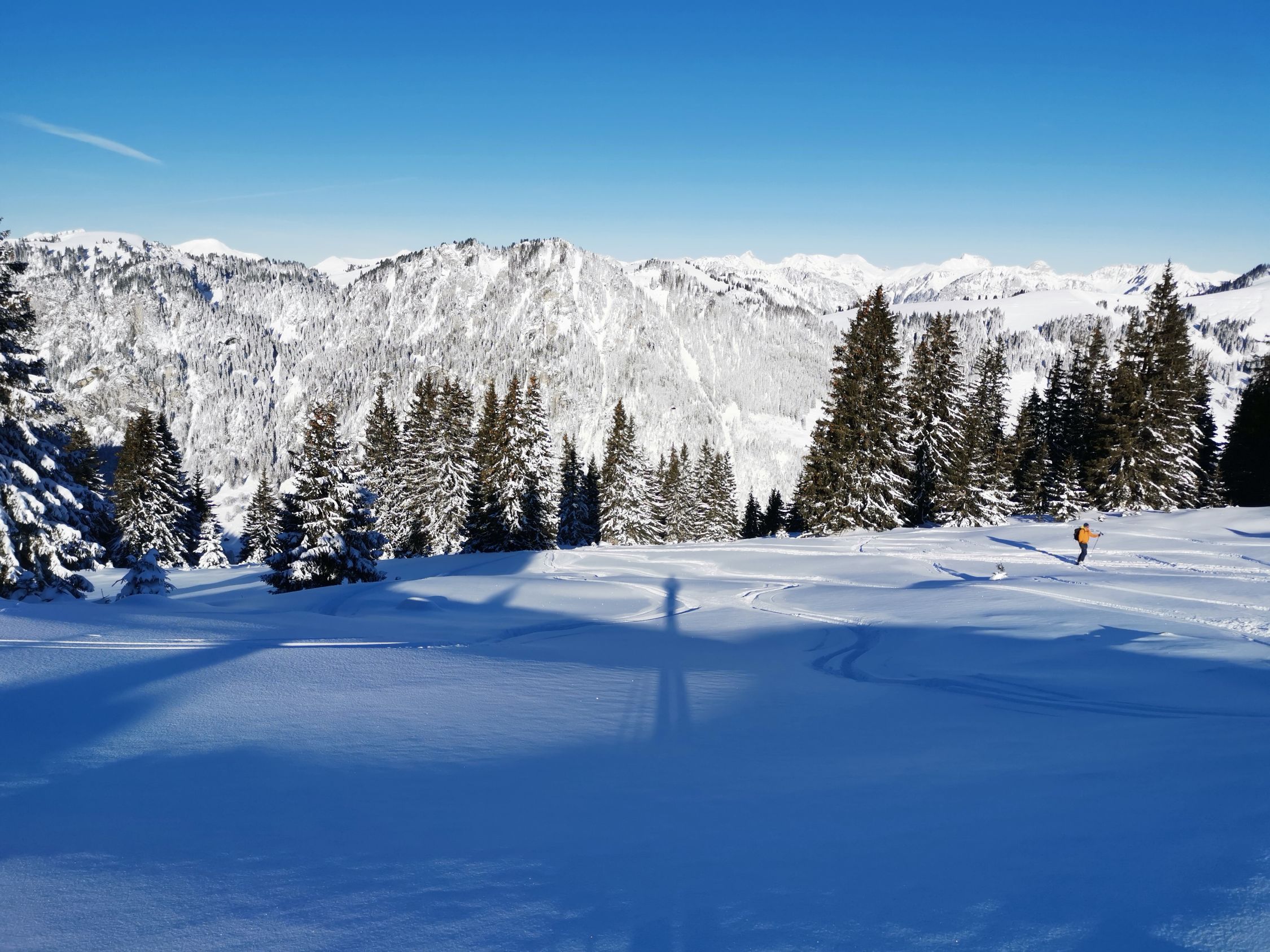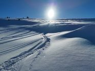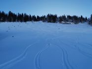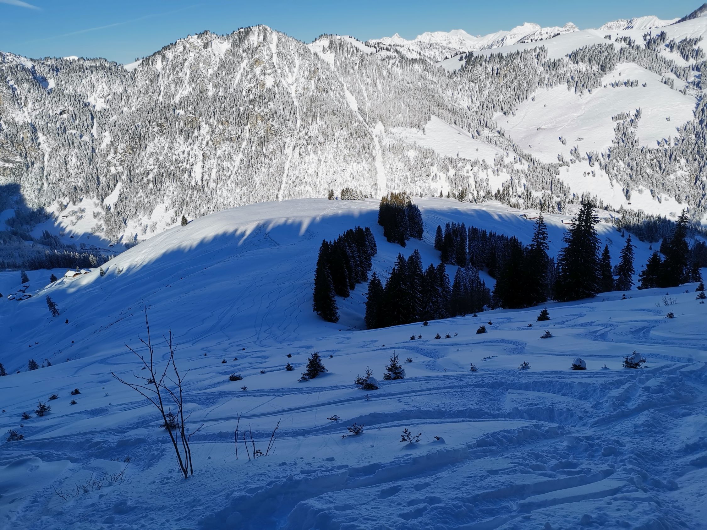 20-30cm Pulver auf tragender Unterlage. Oben etwas abgeblasen, ganz unten noch zu wenig, deshalb Abfahrt auf der Alpstrasse.