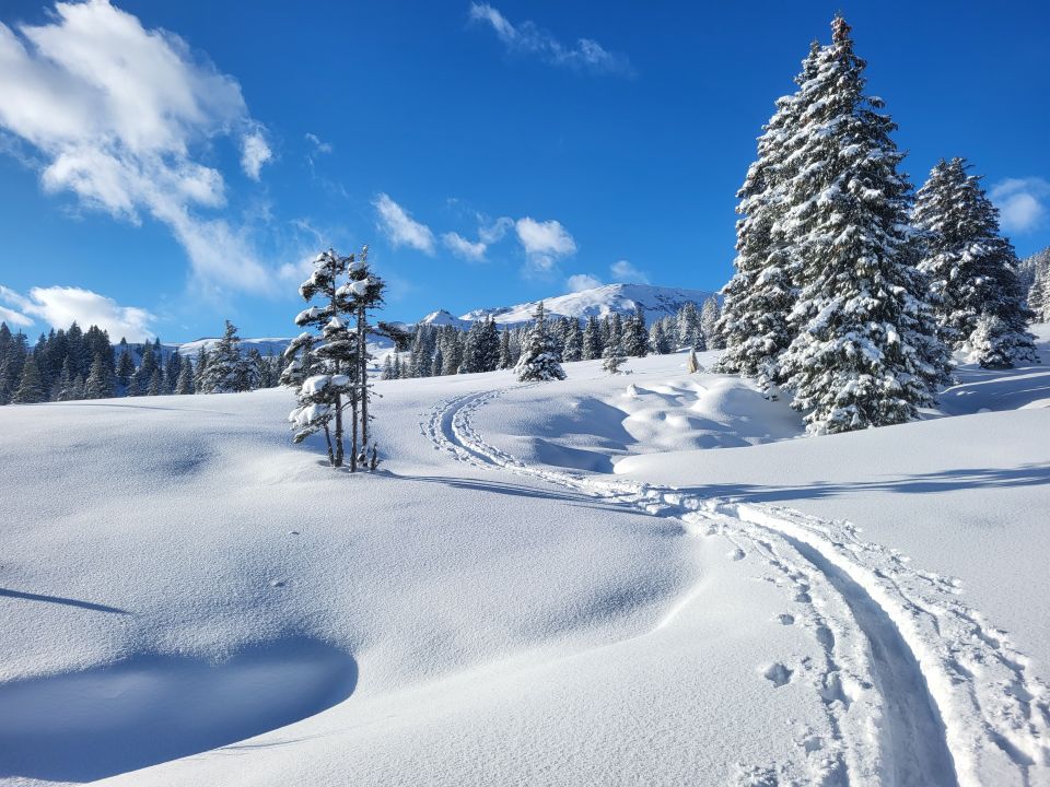 Erstaunlich gute Verhältnisse. Rund 20-40 cm Neuschnee bereits ab dem Parkplatz. Auf der ganzen Strecke herrlicher Pulverschnee - danke an die fleissigen Spurer.
