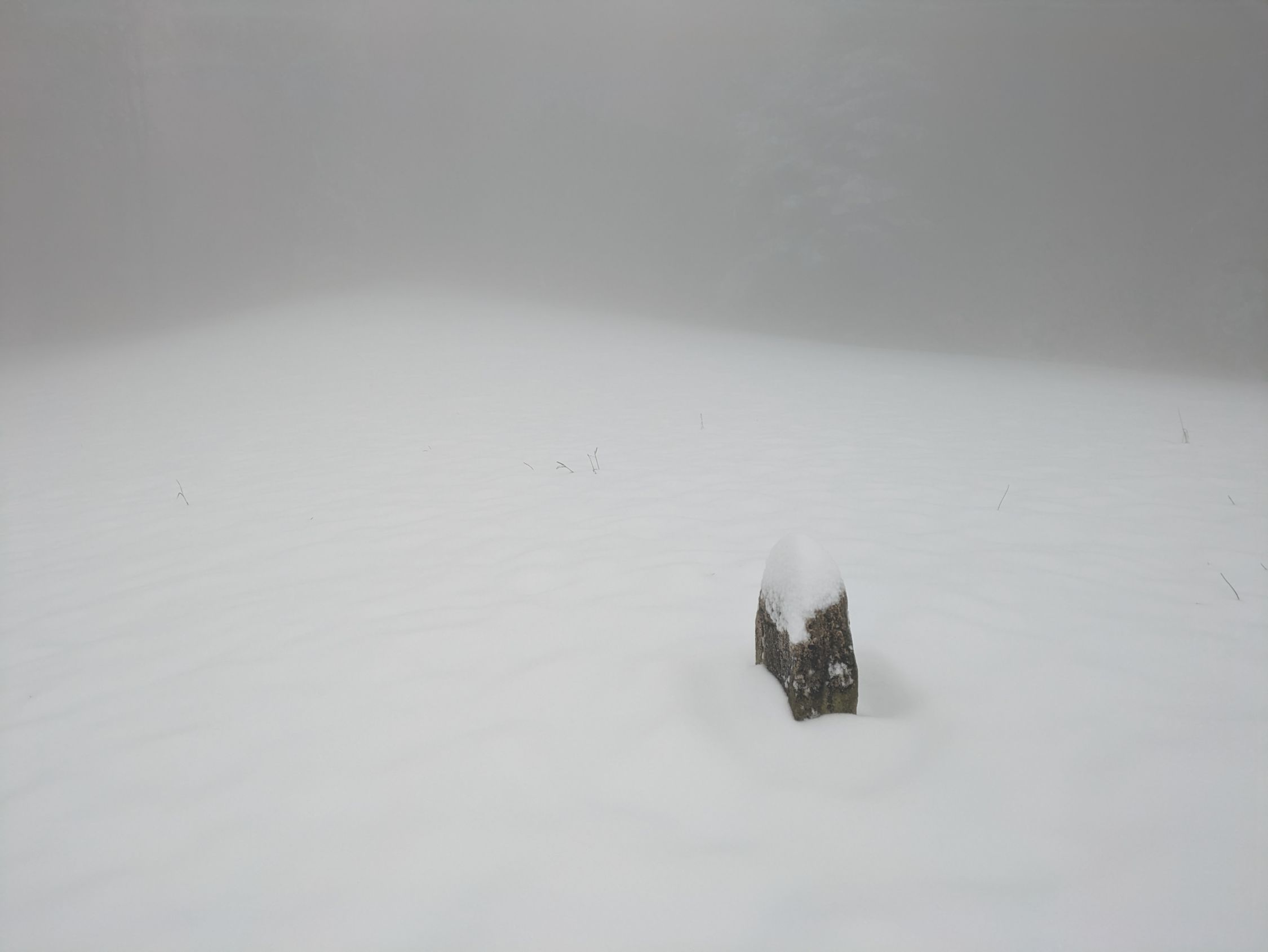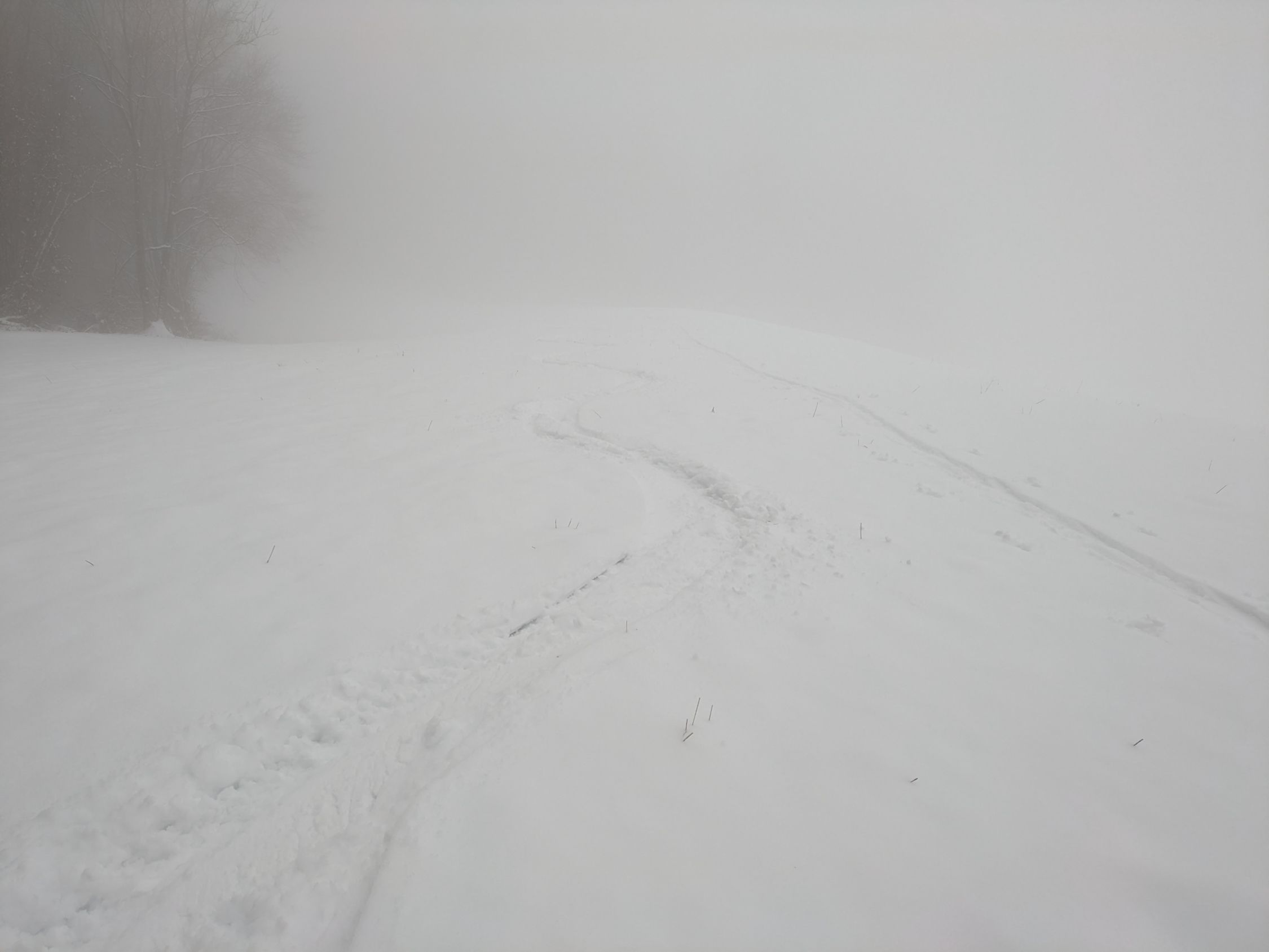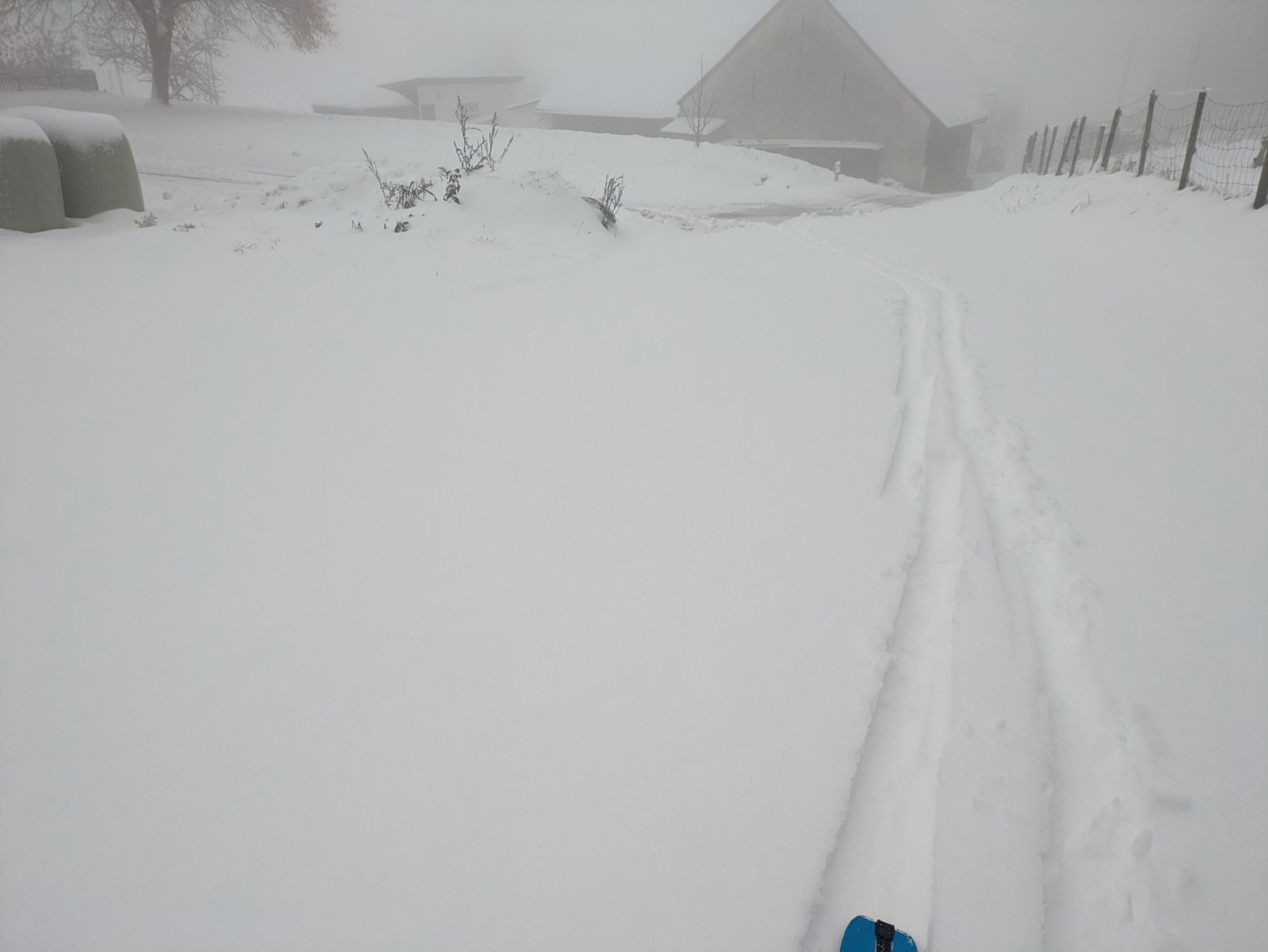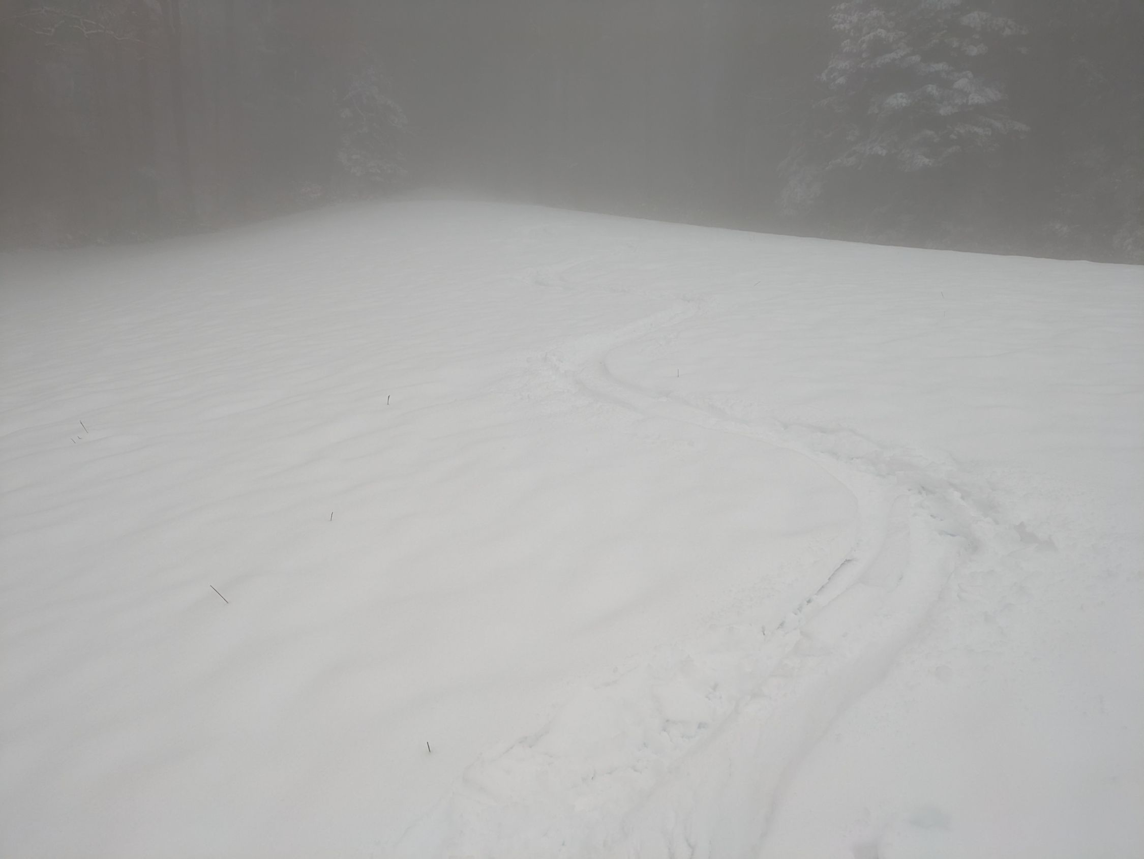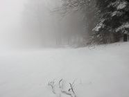 Leider war ich heute ein paar Stunden zu spät: Bereits vor dem Mittag begann es in den neu gefallene Schnee zu regnen aufgrund des rasanten Temperaturanstiegs. Die Folge war feuchter Schnee, der keinen Spass bereitete... 10cm Neuschnee waren es sicher, ganz oben auch 15 Zentimeter. Einige Schwünge gelangen auf dieser Unterlage grad noch knapp. Kein Steinkontakt.