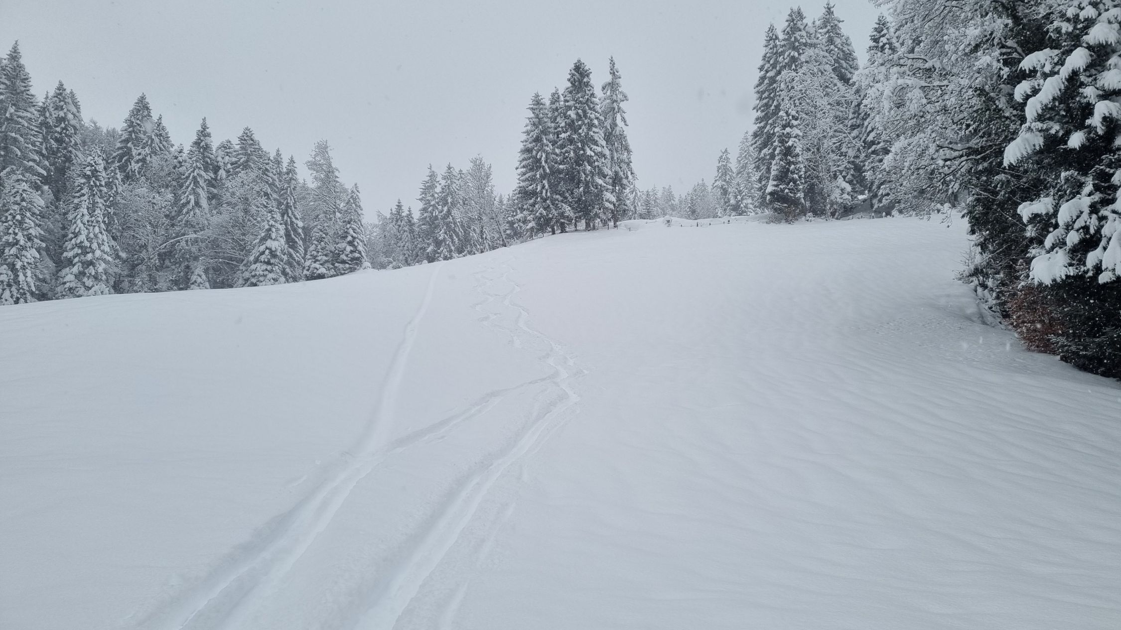 Rund 40cm Pulverschnee beim Start, oben mindestens 80cm Pulverschnee. Ein Traum zum Fahren. Zum Glück ist es oben nicht ganz so flach wie unten. Man würde stecken bleiben bei dem vielen Schnee. Feindkontakt ist so nicht zu erwarten