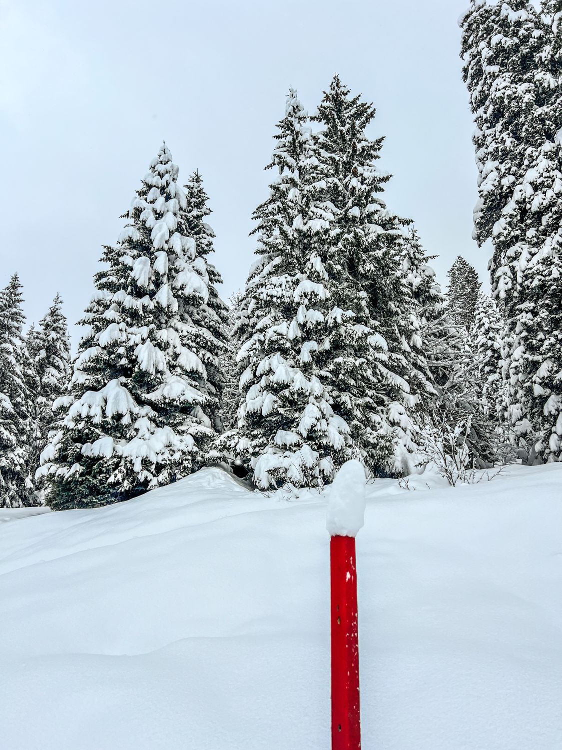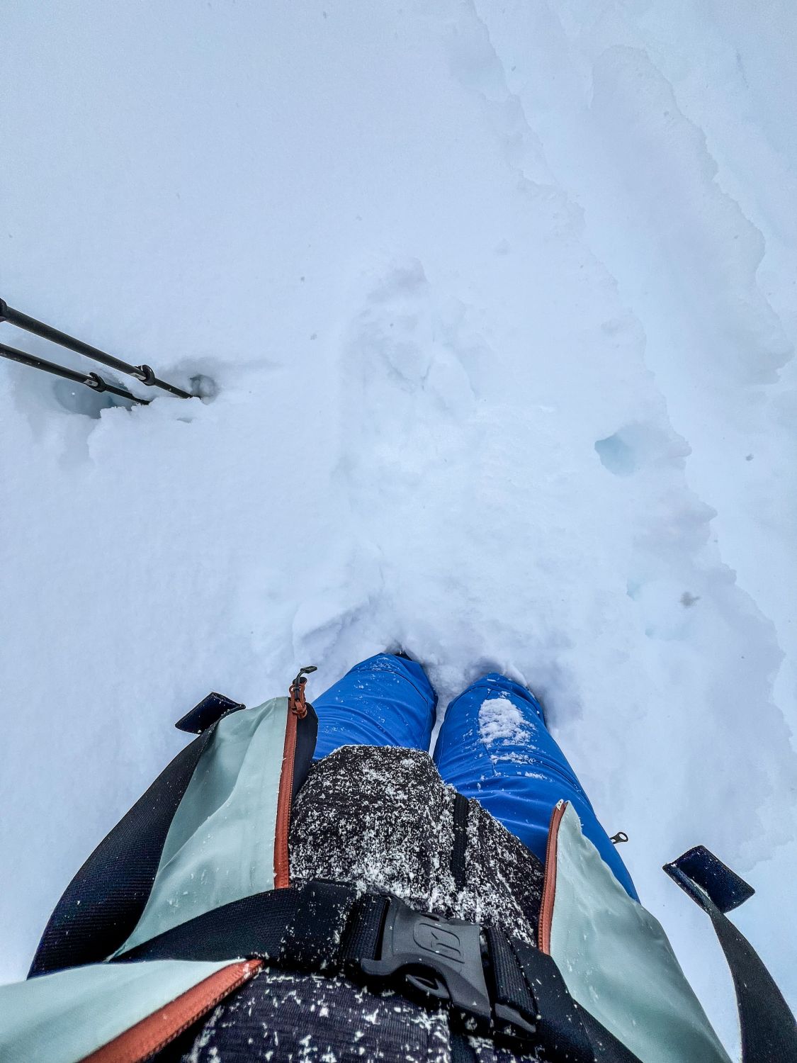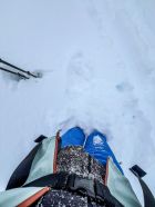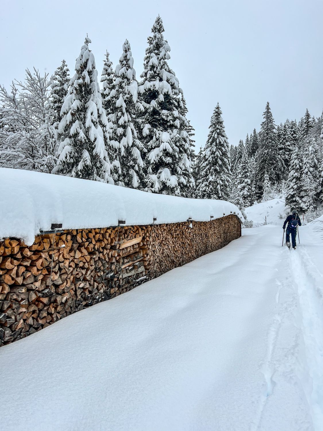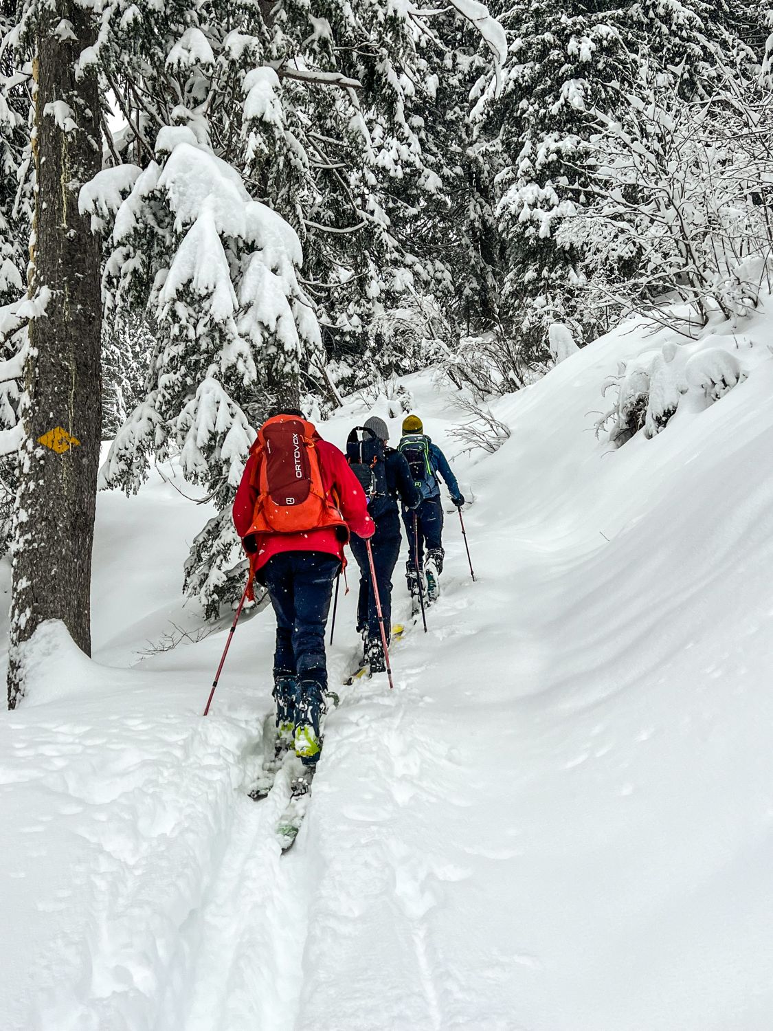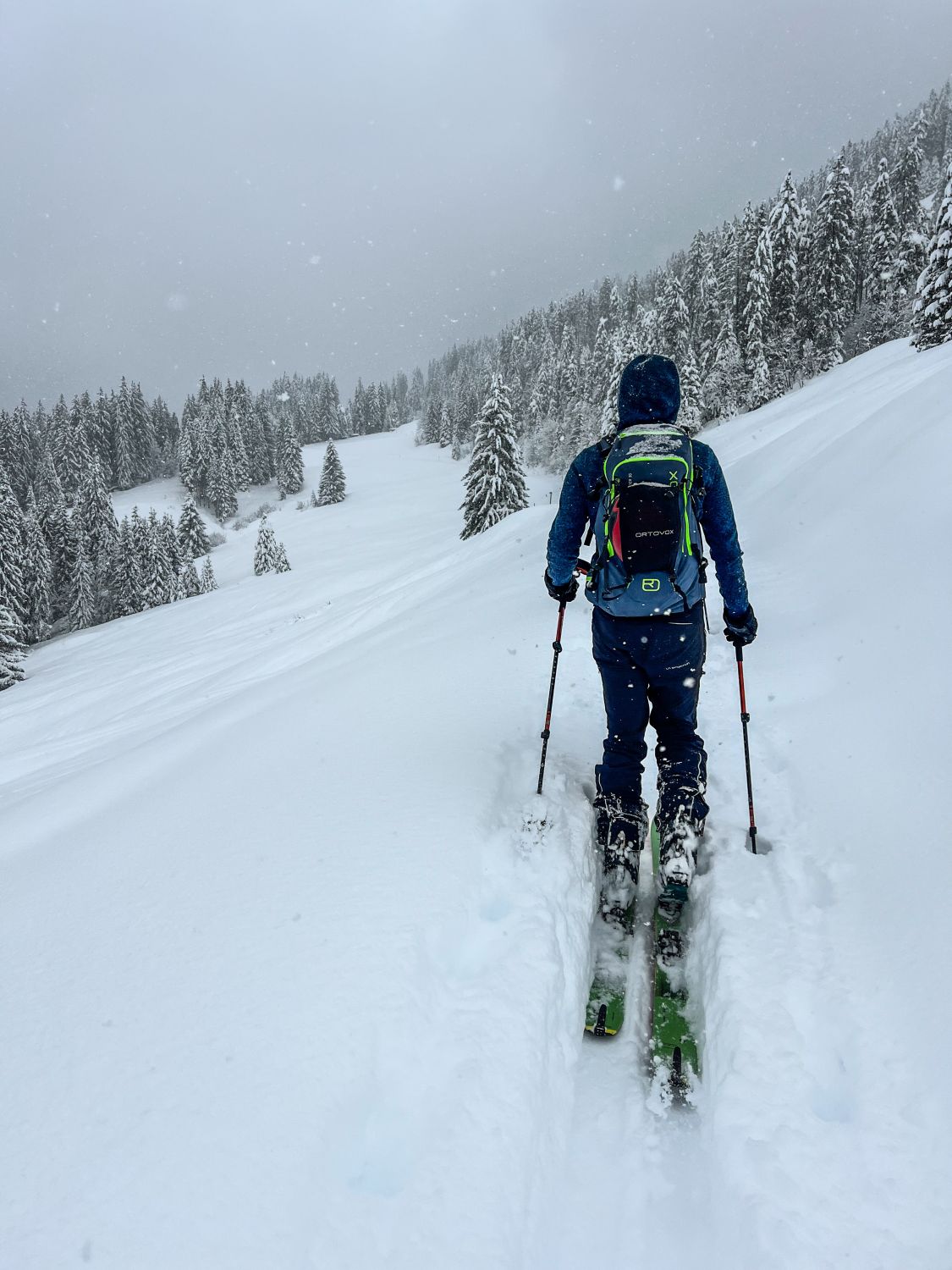 Gefühlt ist auf der Route unendlich viel Schnee. Teilweise zu viel um flüssige Schwünge in der Abfahrt zu machen. Dafür ist die Route phasenweise etwas zu flach. Was sie zur perfekten Tour für heikle Verhältnisse wie heute macht.