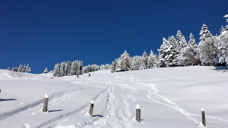 Start der Tour am 9.30 Uhr, viel Pulverschnee auf der ganzen Route, ein schöner Wintertag heute, Sonnenschein von A-Z.