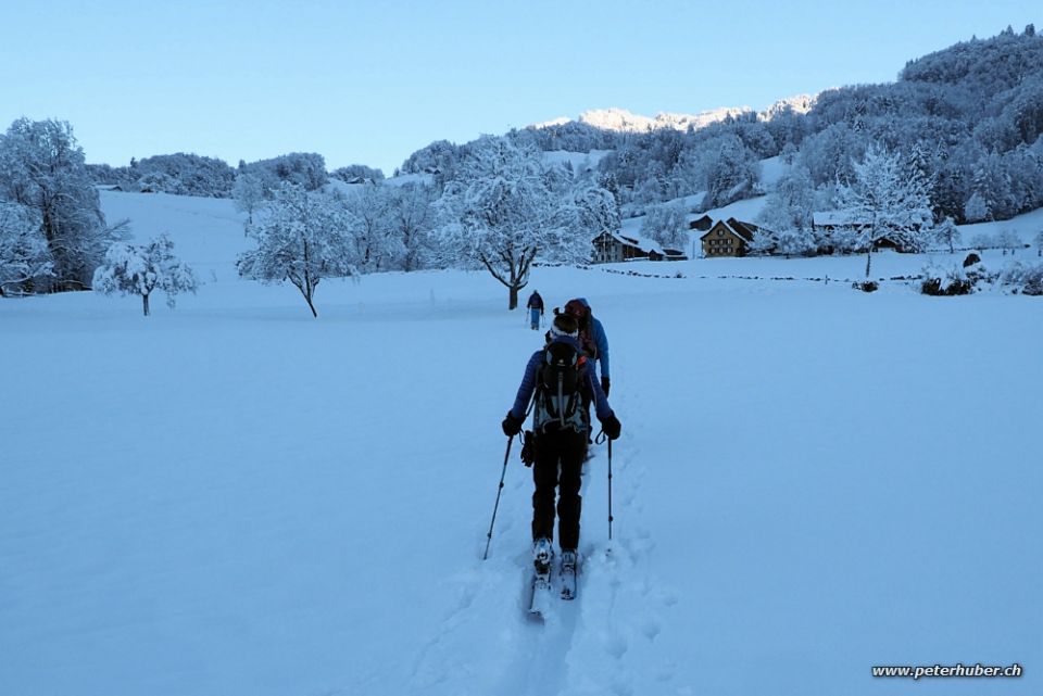 Entgegen der Prognose kein Hochnebel sondern Sonnenschein den ganzen Tag. Im Dorf hat es zirka 25 cm Pulverschnee mit wenig Unterlage. Nach oben nimmt der Schnee rasch zu. Gute Spur bis zum Gipfel.