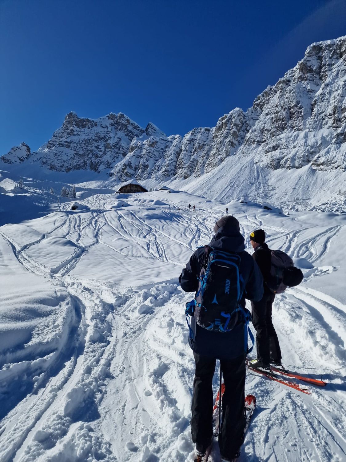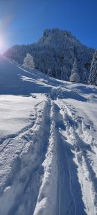 stabil und schon durch einige Tourenfahrer befahren war, fuhren wir ebenfalls den Nordhang hinunter. Danach bis Alp Grimmi weiterhin mit Pulverschnee. Steinkontakte gab es heute keine. Der Waldweg ist gut eingeschneit, es hat aber wie fast immer zwei bis drei Stellen, die vorsichtig (Steine) befahren werden müssen.