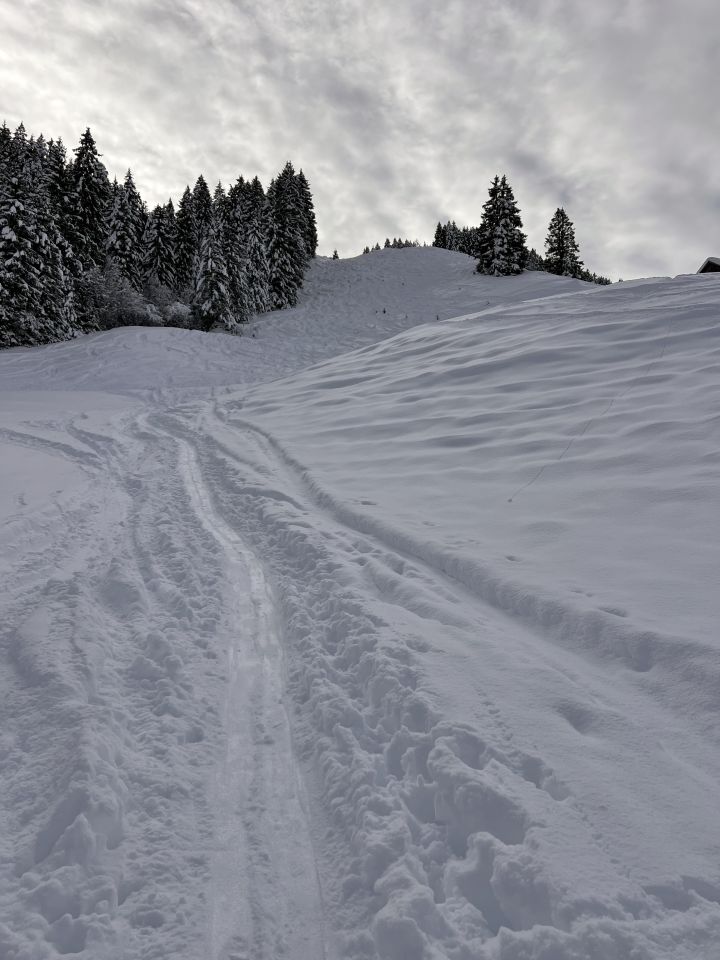 Ab Skidepot guter Trittschnee - wahlweise ist auch Skiaufstieg möglich.