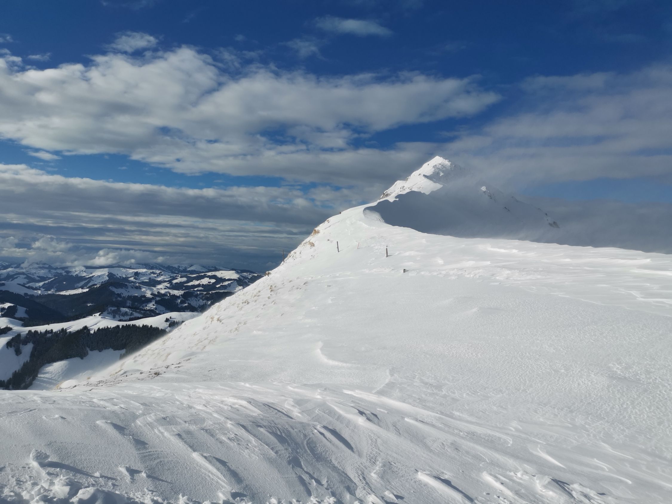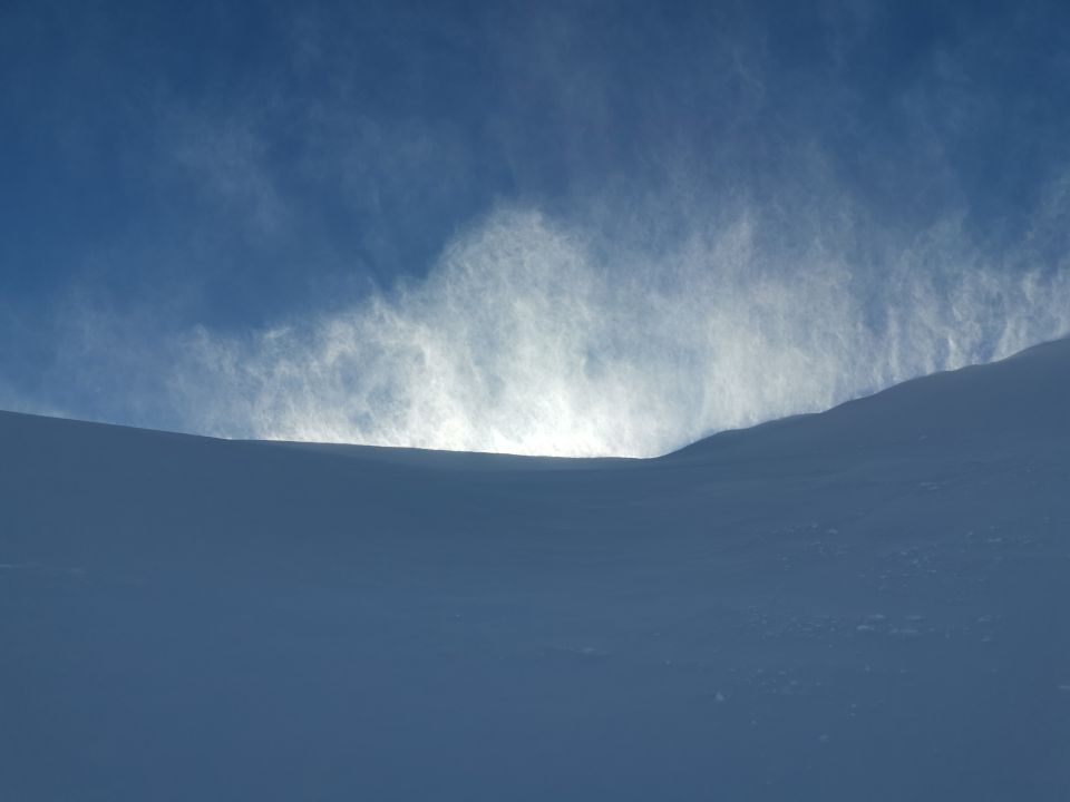 Unten weiterhin toller Pulver, langsam etwas schwerer werdend. Oben leider stark abgeblasen und heftiger Wind. Trotzdem eine schöne Tour.