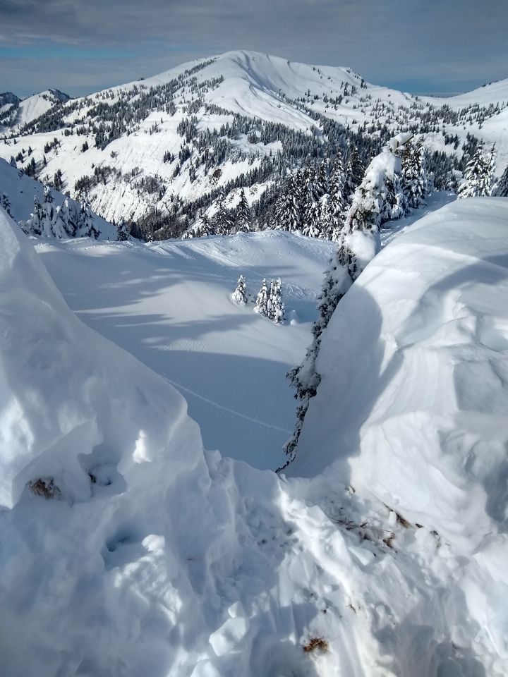 Vom Heidenkopf zur Oberen Siplingeralpe Hangneigung gerade ausreichend um den Pulver zu genießen