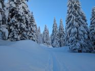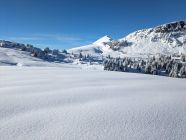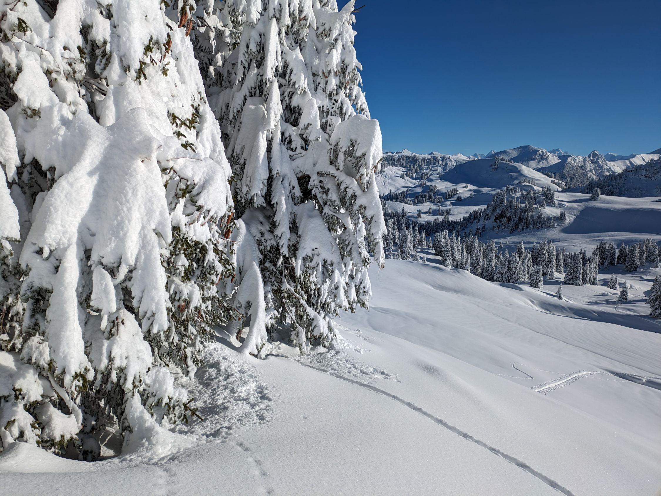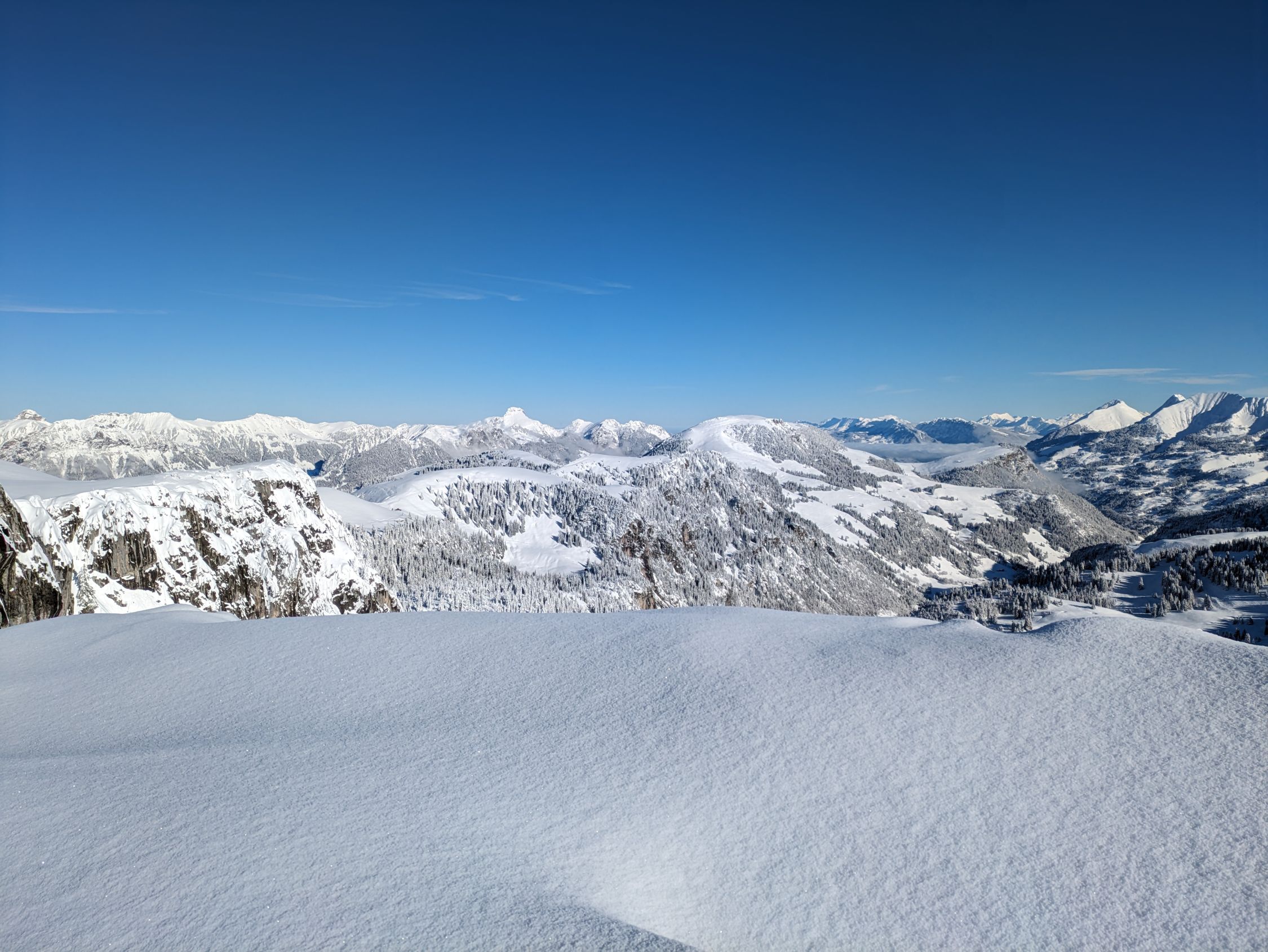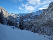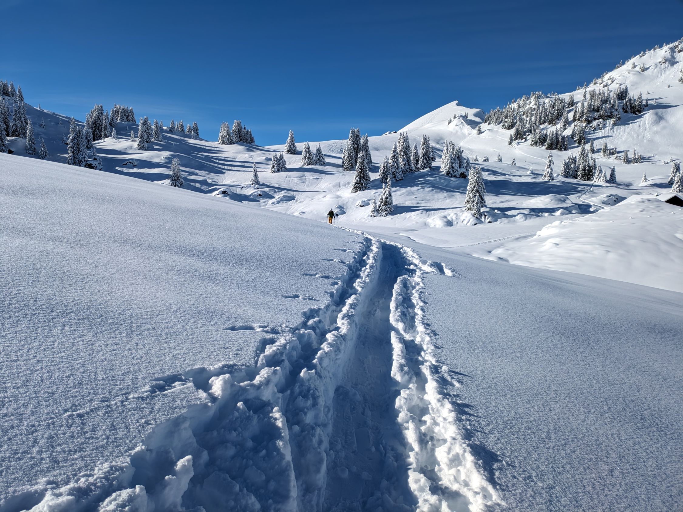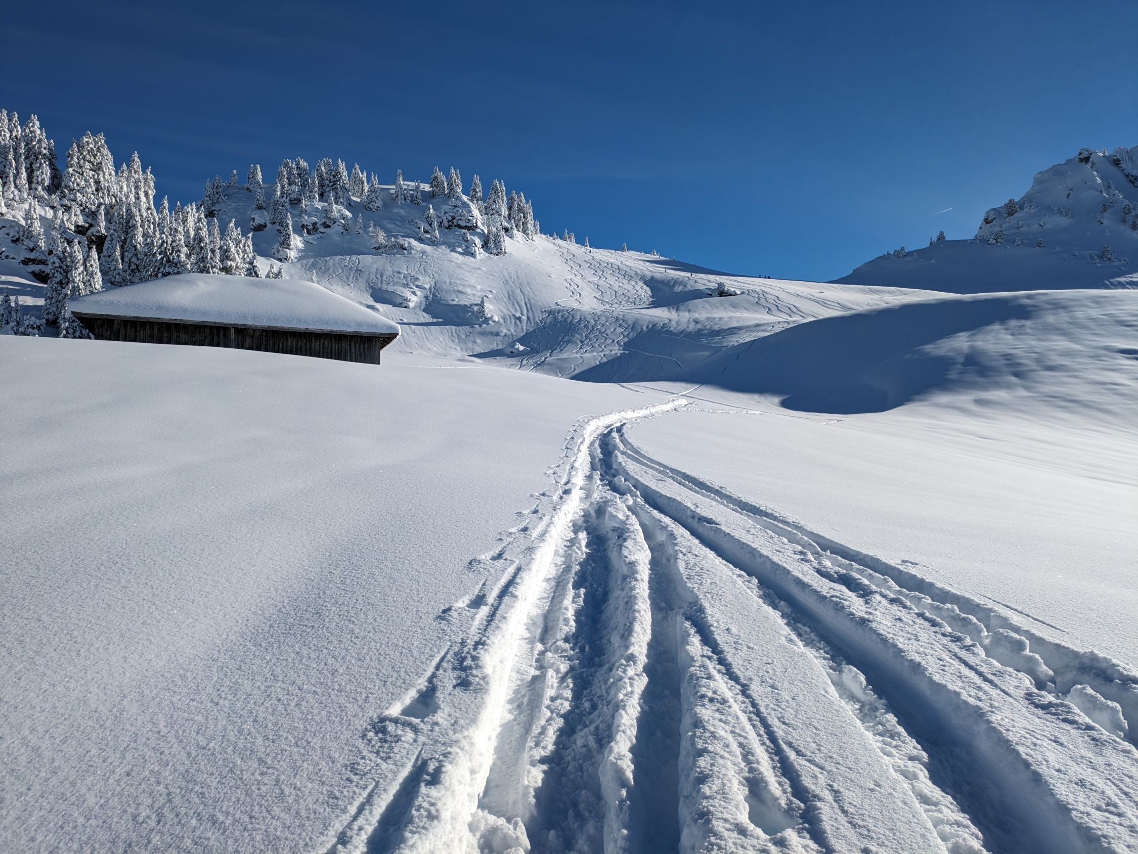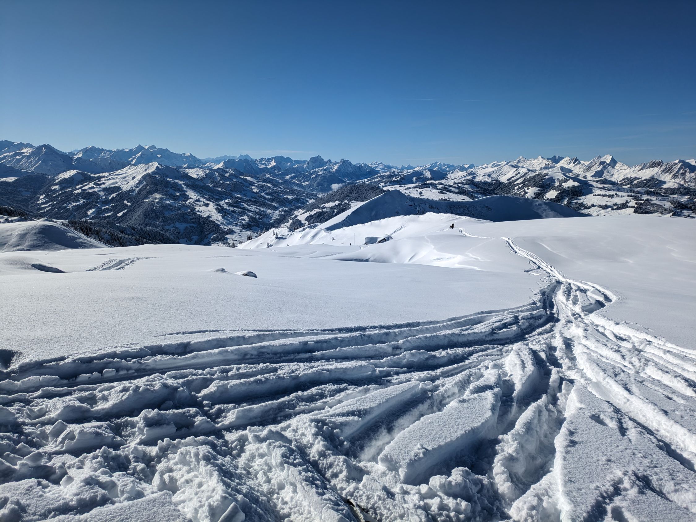 Viel Pulver in diesem Gebiet. Überraschend wenig Leute unterwegs angetroffen - die Skitoureros in den rund 20 - 30 parkierten Fahrzeugen hatten rundum eine grosse Auswahl an Gipfelzielen, darum verteilte sich die "Masse" sehr gut.
