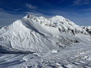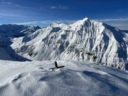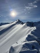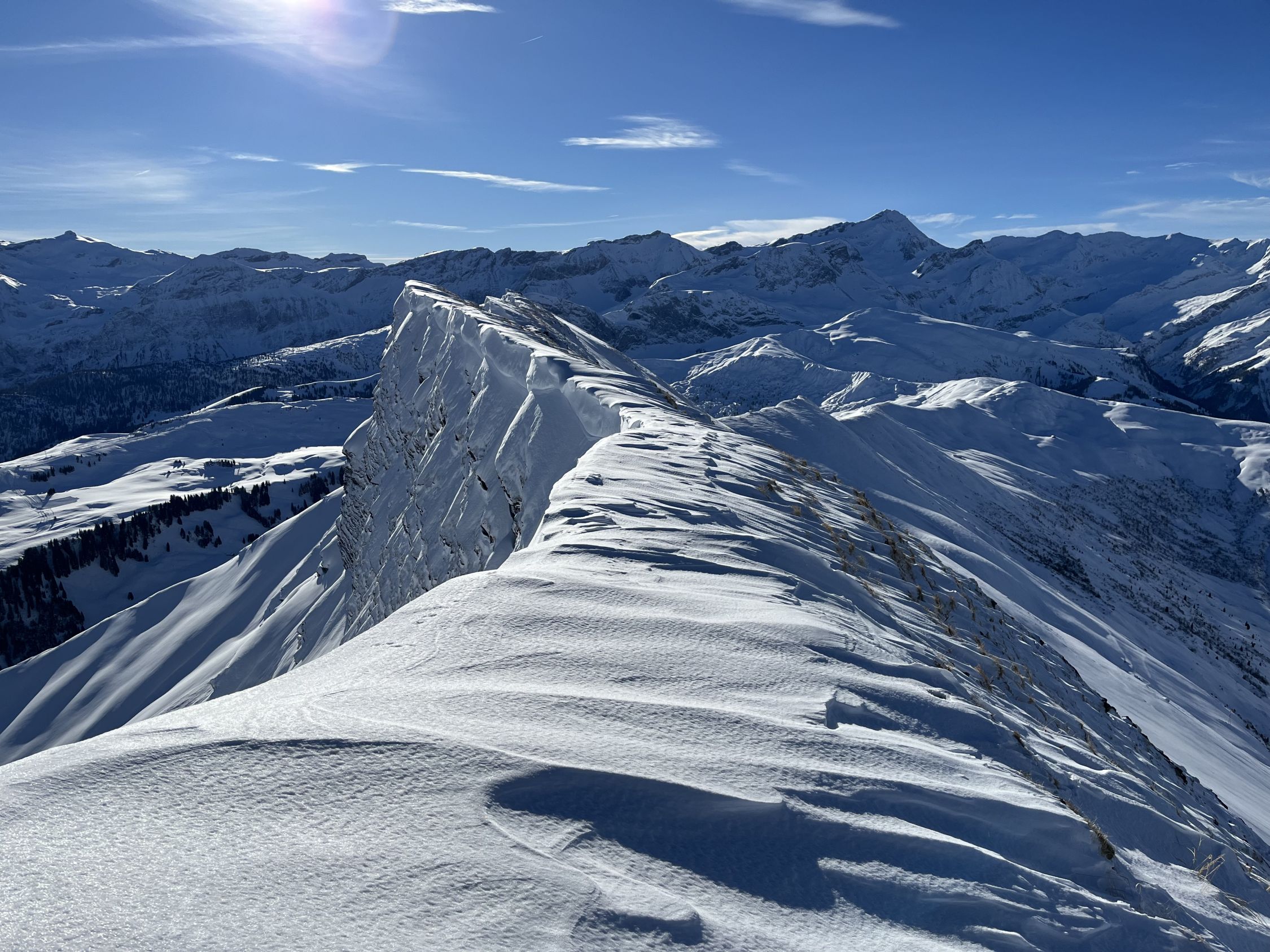 Schön pulvriger Schnee, Grate etwas abgeblasen, an besonnten Stellen Schnee zunehmend schwer. Schönes und kaltes Wetter, auf den Graten etwas windig