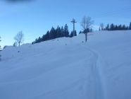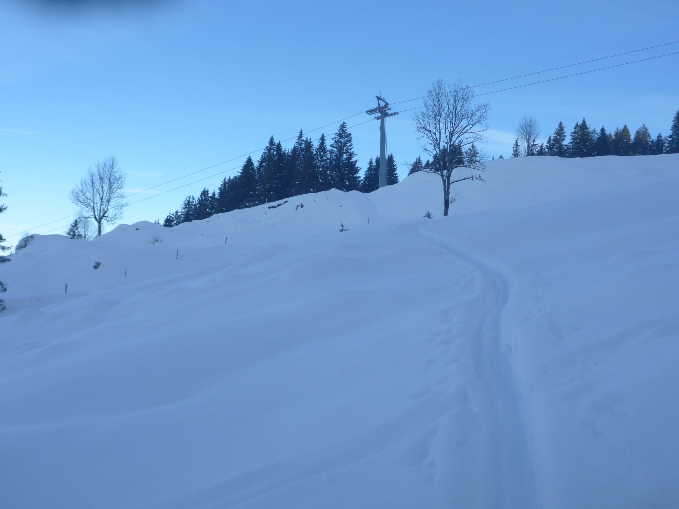 Für meine Verhältnisse etwas flache, aber schön gleichmässig angelegte Aufstiegsspur. Schnee oberflächlich Pulver, darunter wohl auf Grund der warmen zurückliegenden Tage aber eher schwer. Bin wegen meines lädierten Knies deshalb über die gut präparierte Piste abgefahren, obwohl es vermutlich ginge.