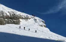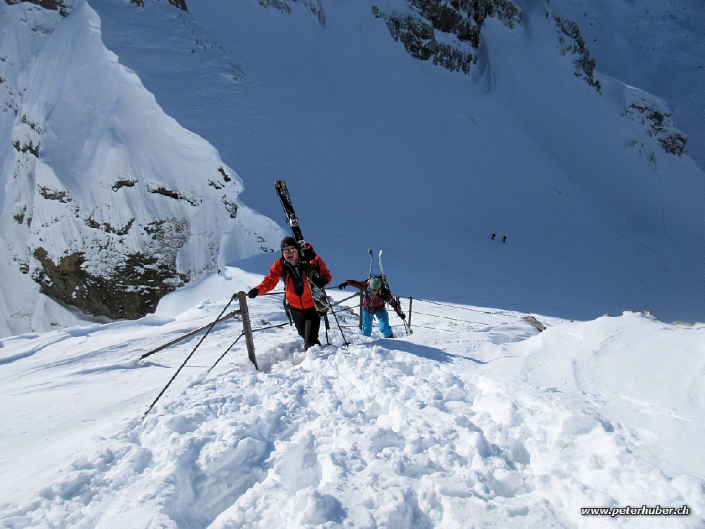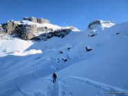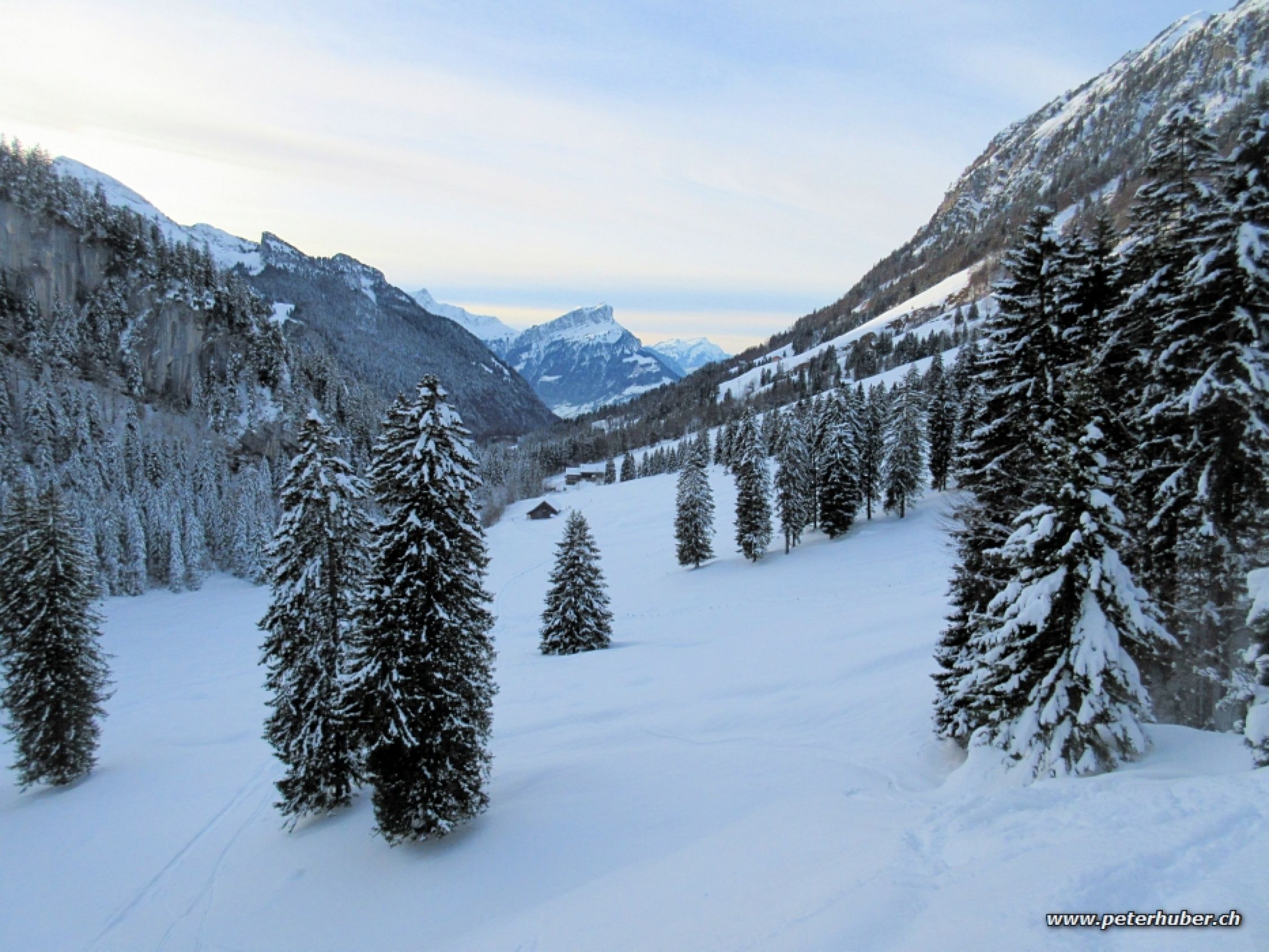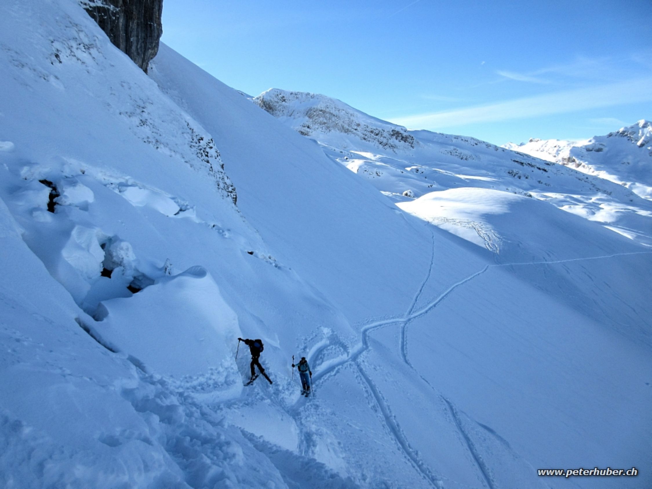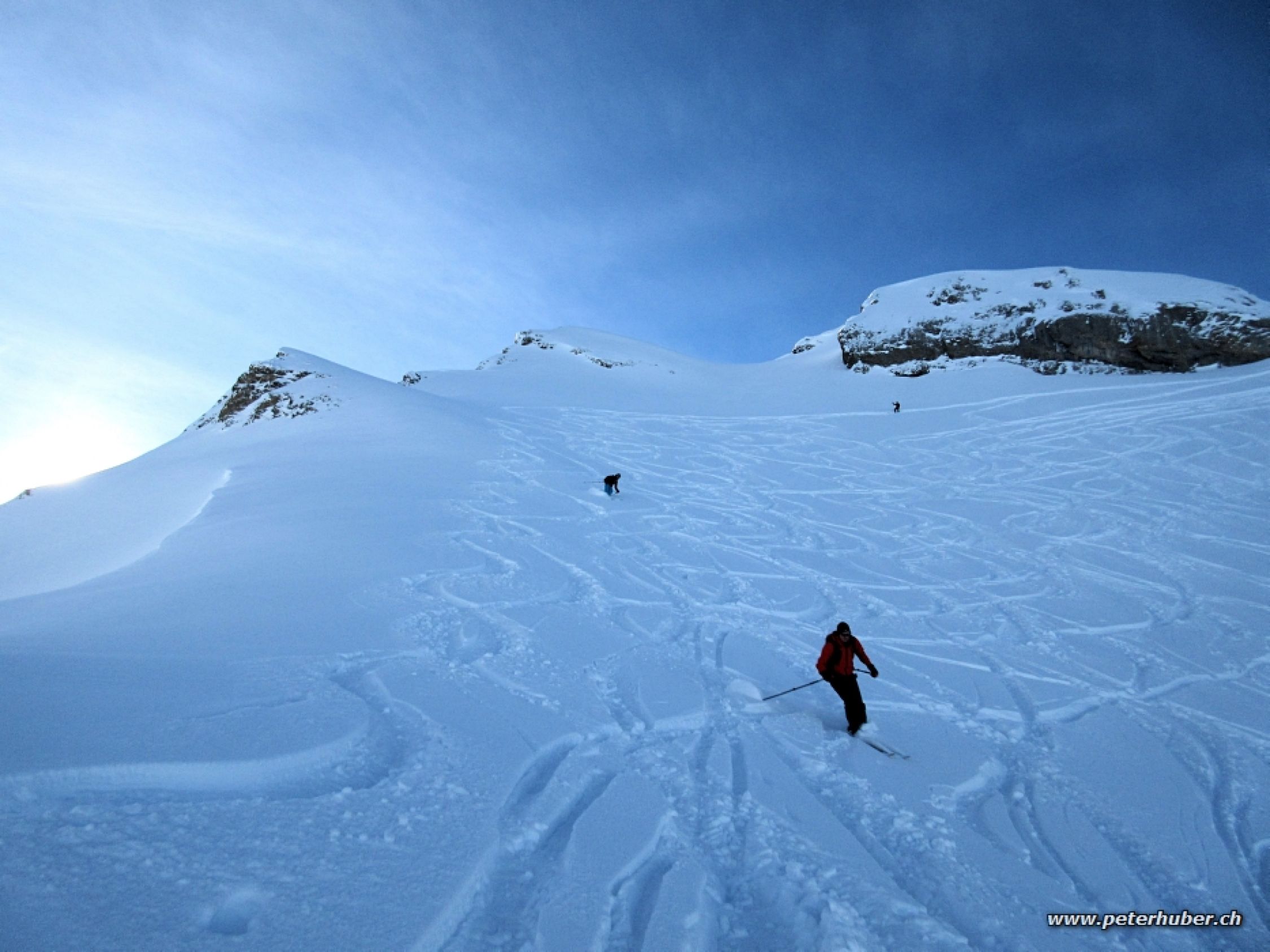 Abfahrt: Via Alpeli zur Suterlishütte und Wiederaufstieg auf die Höchi. Traumhafter Pulverschnee, meist noch unverspurt. Im obersten Teil stellenweise windgepresst. Ab der Mitte sensationell. Auch die Abfahrt von der Höchi auf gut angelegter Spur sehr gut zu fahren und dann zu unterst noch ein paar schöne Hänge.
