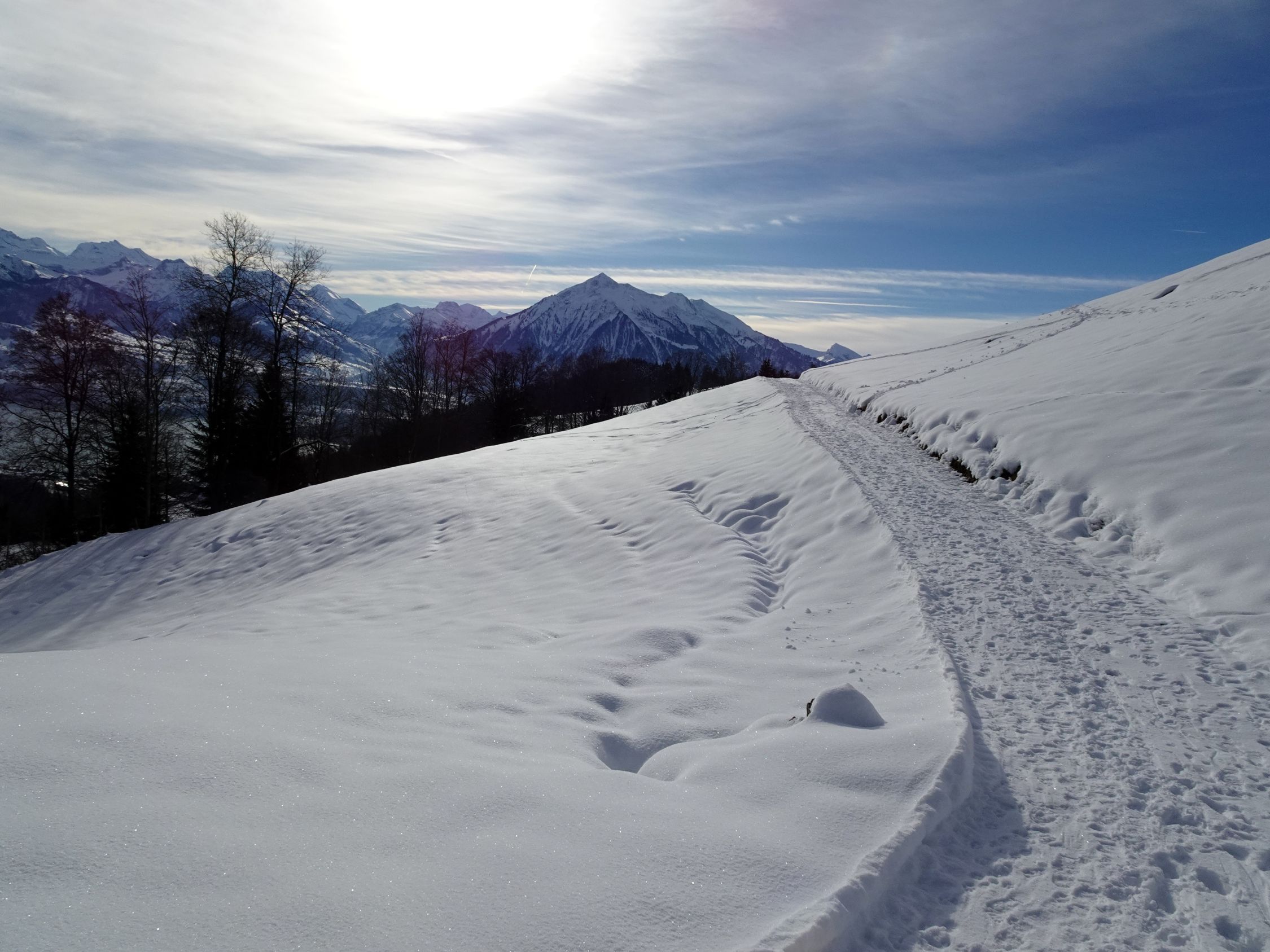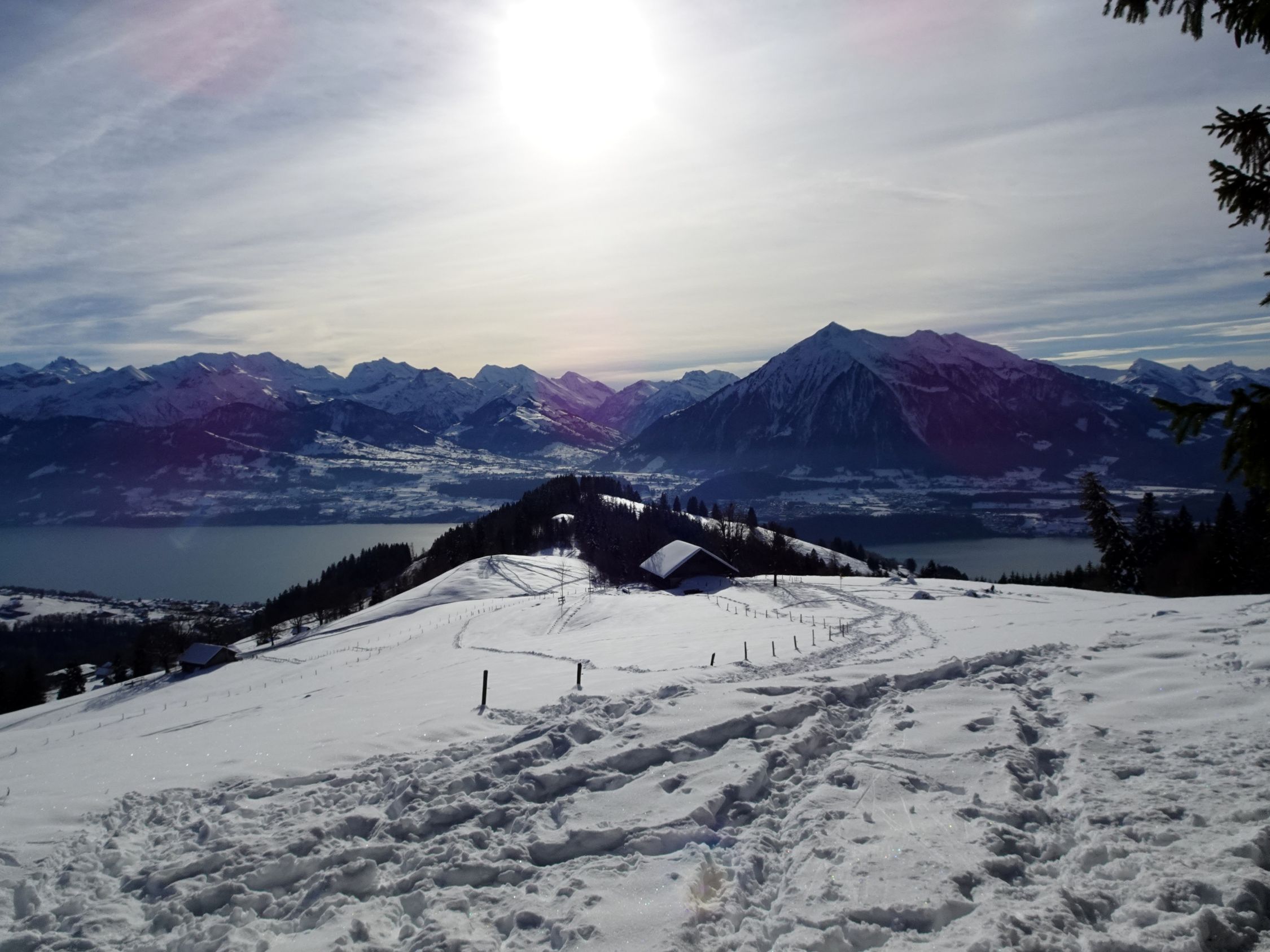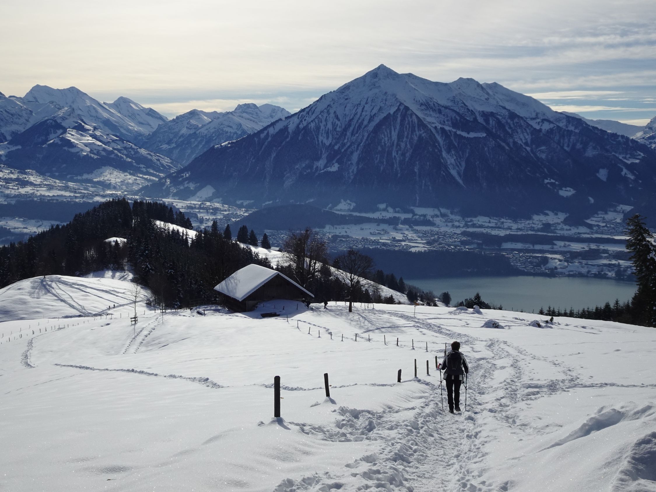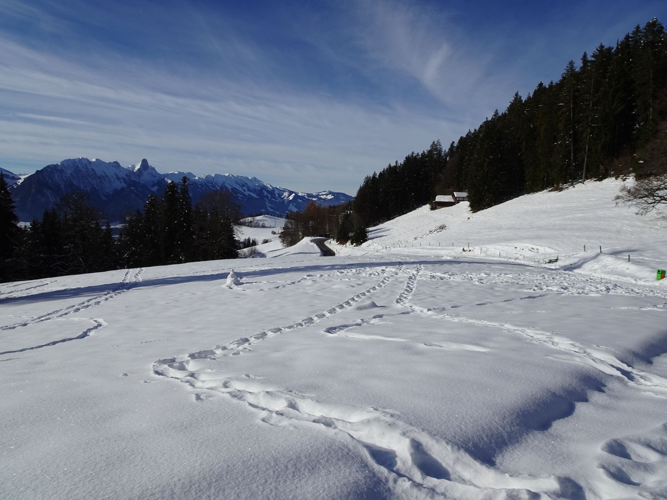 Anmerkung: wir haben als "Vorspeise" den Weihnachtsweg von Heiligenschwendi gemacht. dort war der Schnee auf dem Weg durch die vielen Besucher der letzten Tage stark gepresst und zum Teil rutschig. Wir haben die (Grampini), nennt man si so? geschätzt und siicherheitshalber , bei kleineren Unterbrüche bis Schwanden Säge benutzt. Ohne ging es auch, aber etwas mühsamer.. Die Wanderstöcke waren ebenfalls hilreich. Fazit : Wer gute Schuhe hat und gut zu Fuss ist, kann, abgesehen von manchen Wackeleinlagen, gut durchkommen.
