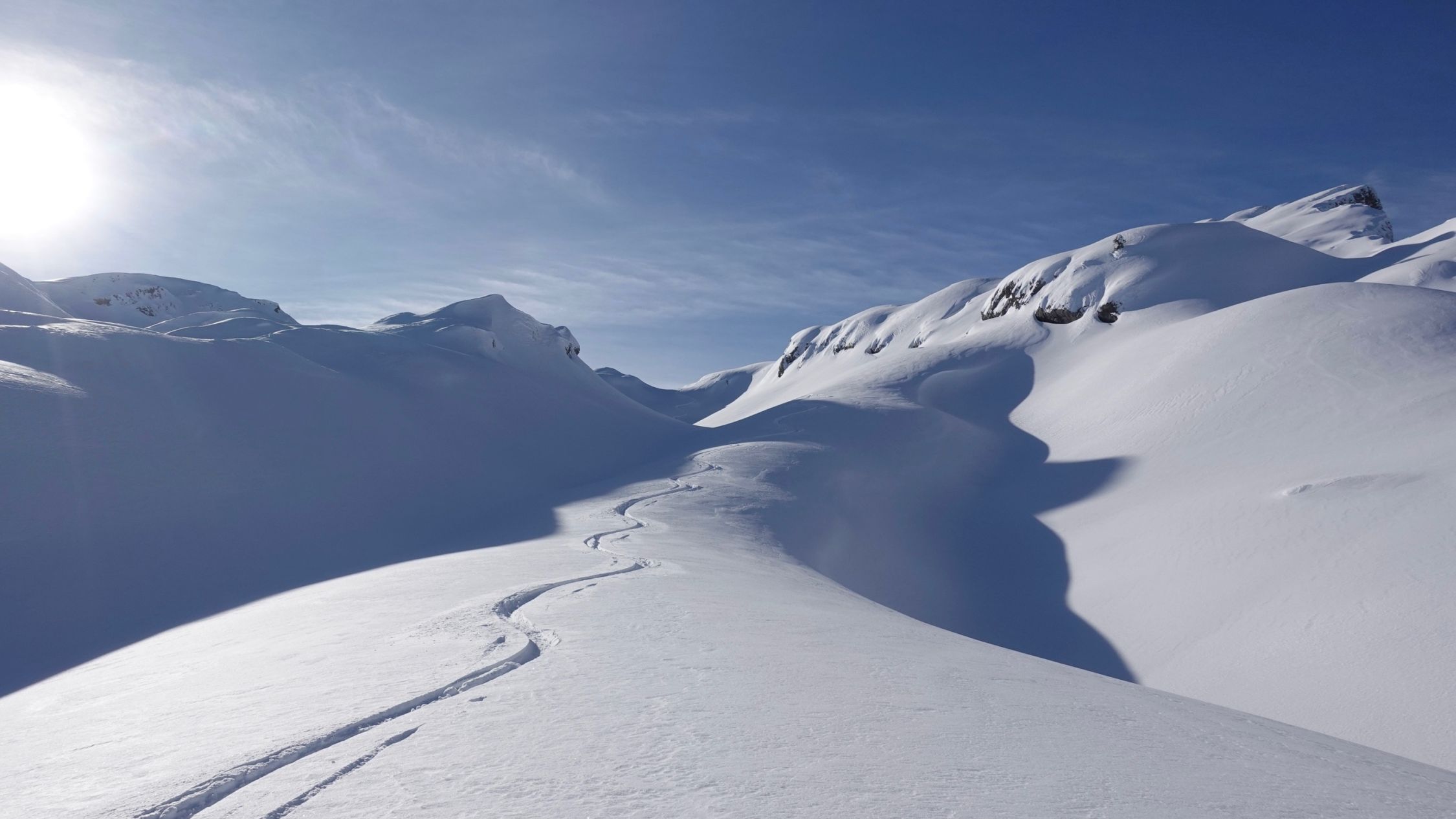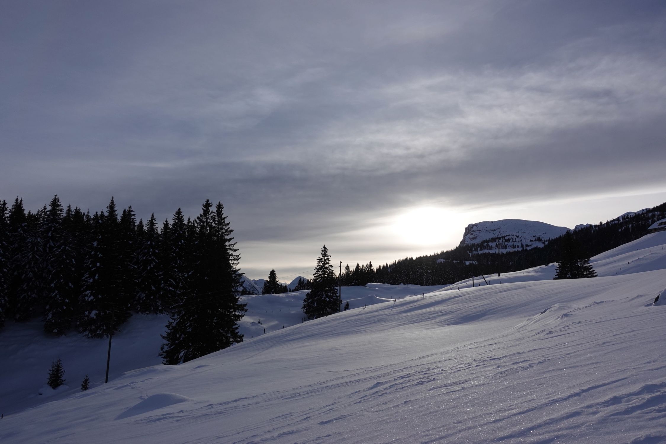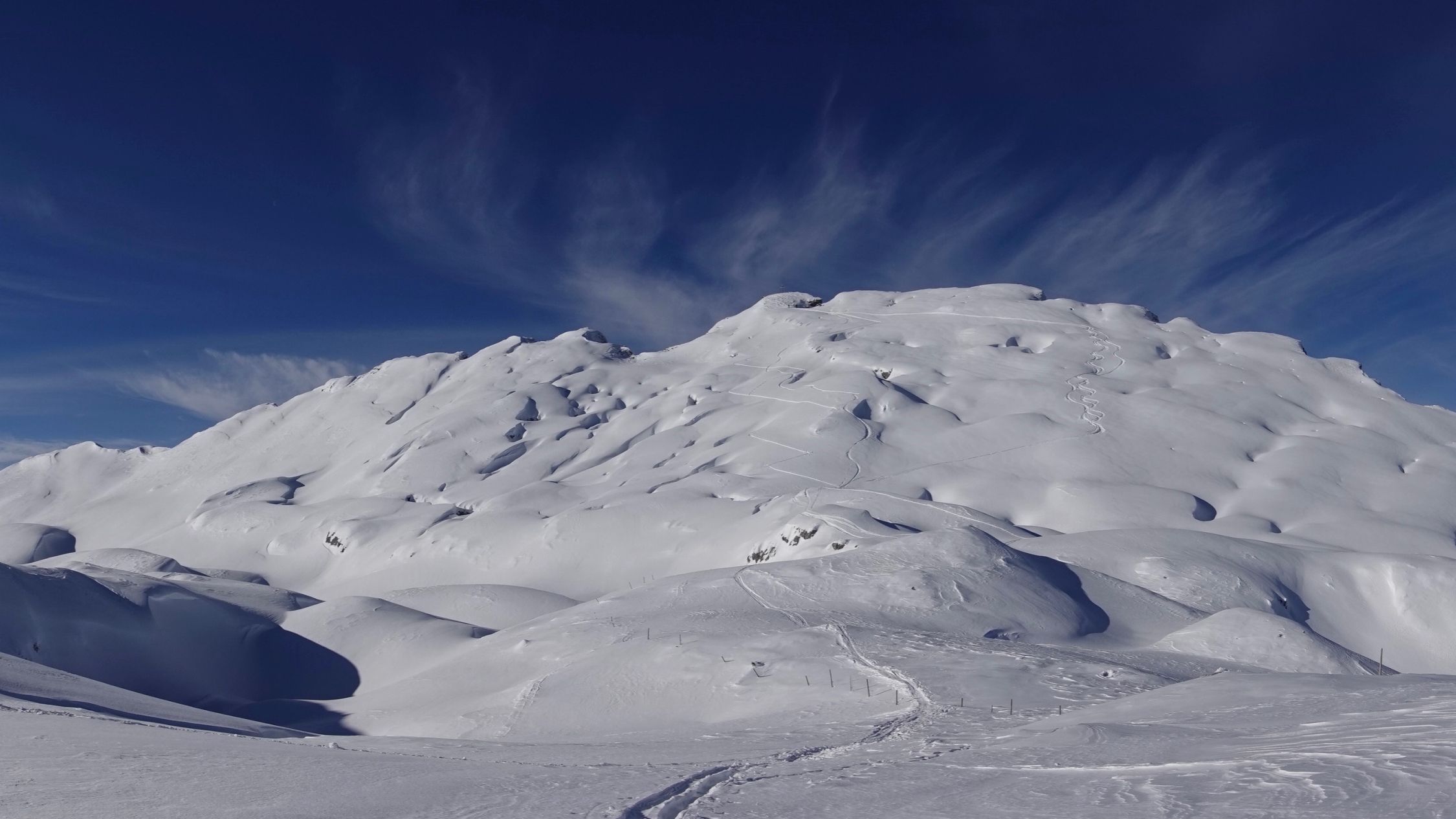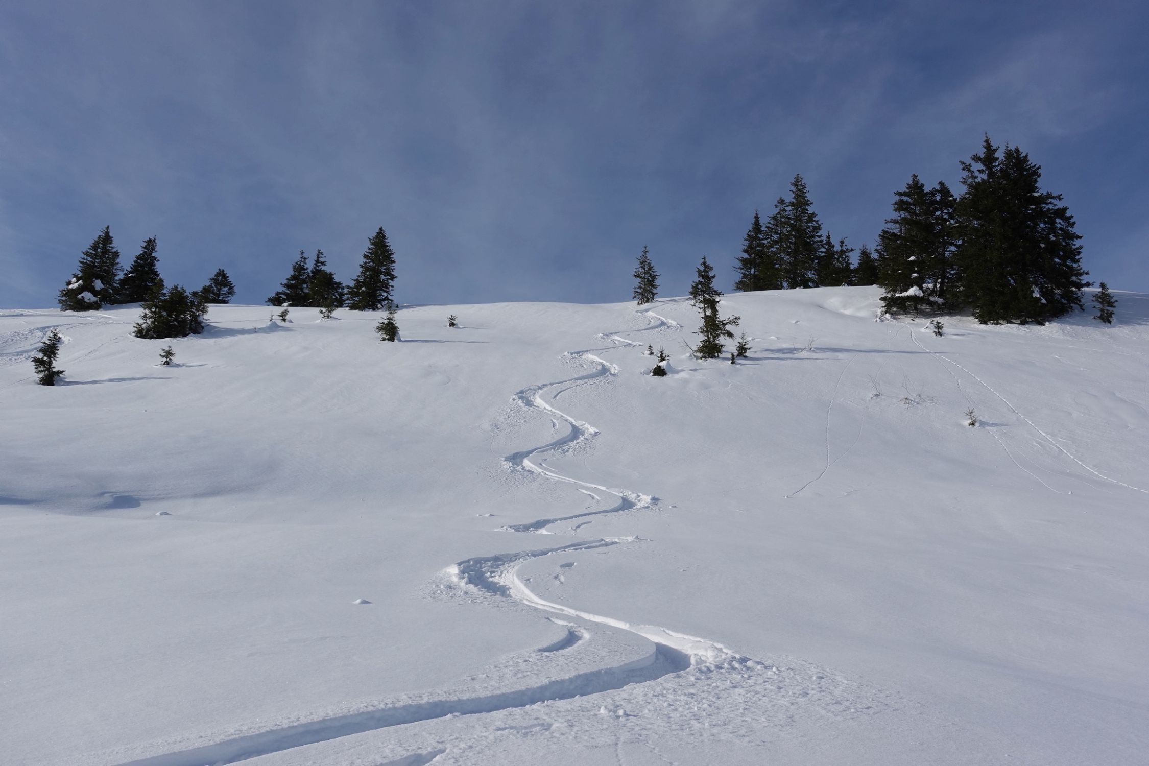 Ab Hirsegg für Anfang Dezember bereits gut eingeschneit. Oberhalb der Waldgrenze leicht windgedeckelt (zügiger Wind, der die Aufstiegsspur rasch zudeckte). Gipfelhang dann wieder pulvrig. In der Abfahrt immer mit der notwendigen Voraussicht, nicht wegen Steinen sondern wegen der Karstlöcher, die man besser grosszügig umfährt. Bei Schönwetter wie heute aber kein Problem.