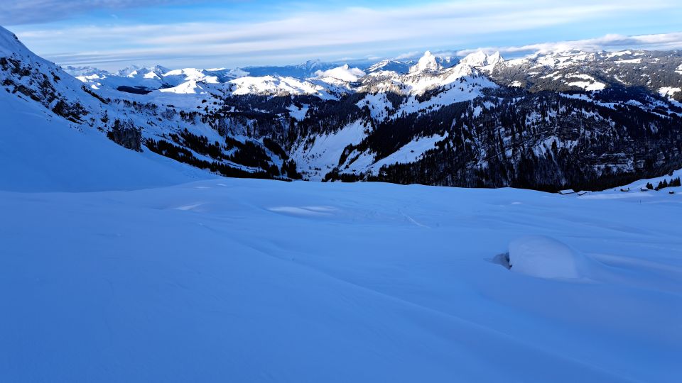 Abfahrt: Die obersten Hänge vom Gipfel bis unter die Steilstufe vom Wind geprägt, aber schön zu fahren. Danach bis ca. 1600 müM genussvoller, leicht gebundener Pulverschnee. Ab Druesberghütte Bruchharst bis Pt. 1421 Beginn Waldweg. Waldweg und Piste hart.