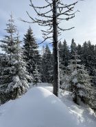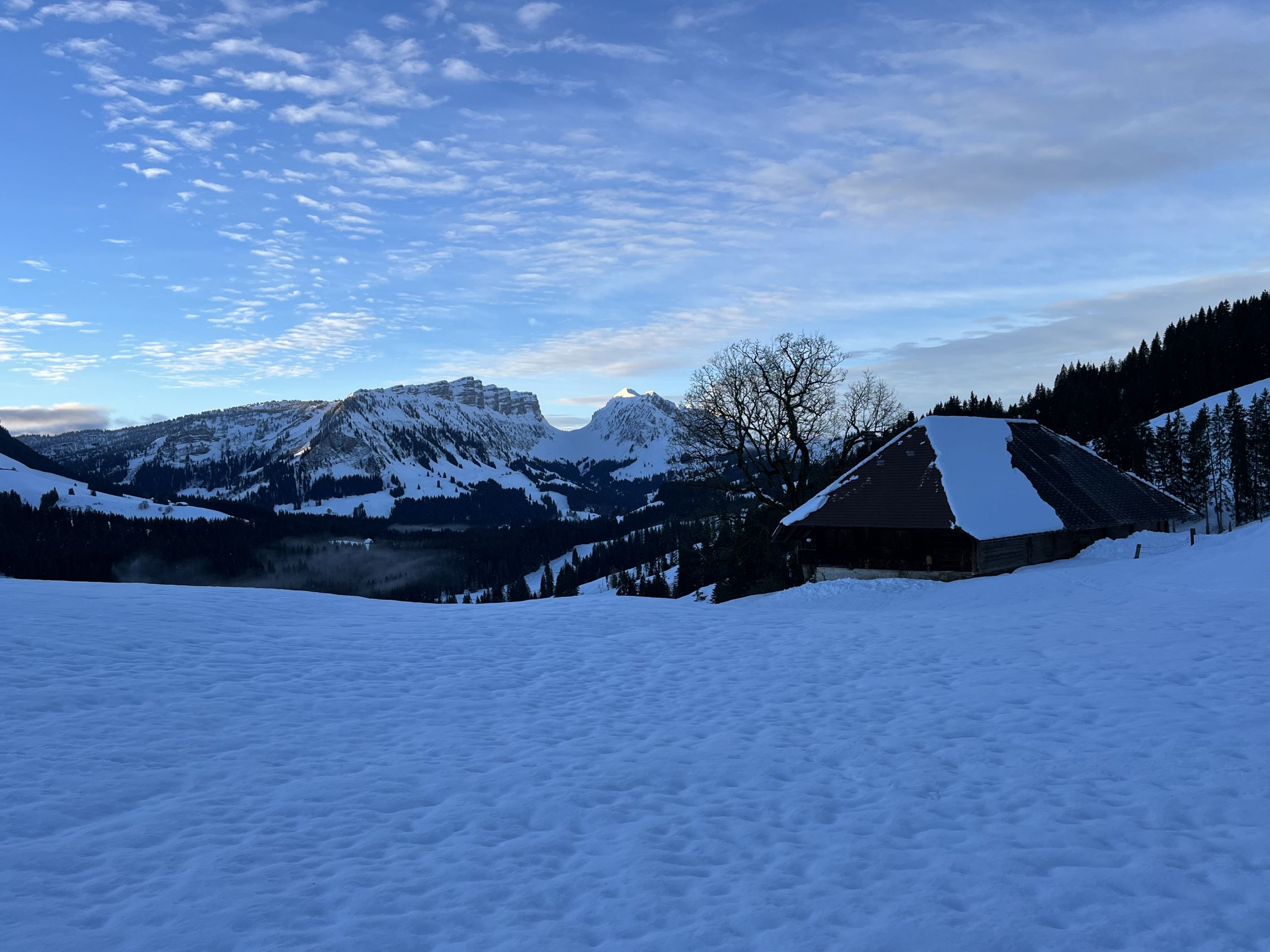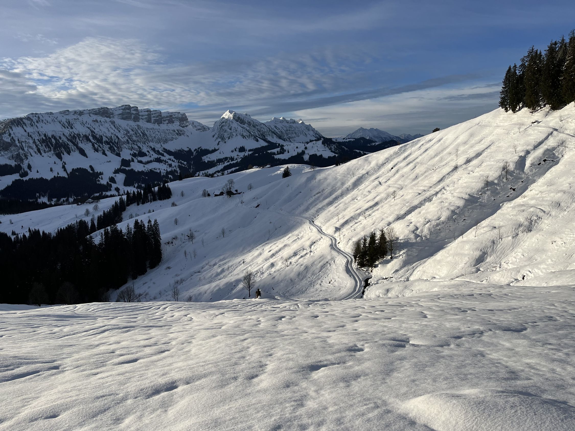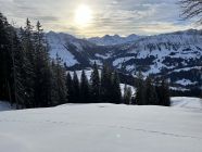 Wie erwartet hat die Erwärmung dem Schnee nicht gut getan. Statt Pulver nun eine Art Kartoffelstock, zum Teil mit einer Regenkruste garniert. Besser war es heute oberhalb ca. 1500 m, offenbar war gestern dies etwa die Höhe der Schneefallgrenze.