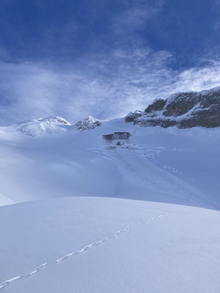 unten bis zu de schnüer bruchharsch. Einer 2-3 Tage alten Spur folgend auf dem Sommer weg hochgekämpft, gleitschneemäuler unter 10-15cm Schnee durchblitzen sehen…”wird kein langer Aufenthalt” dachte ich mir.