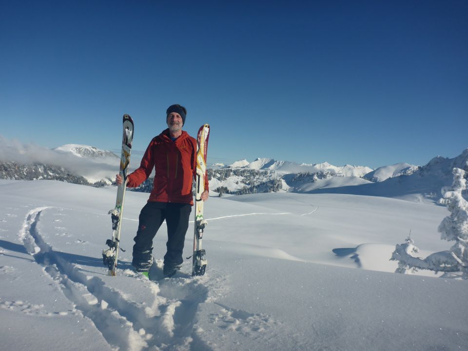Verschiedene kleinere Lawinen, teils direkt ab Grund (noch feucht}, teils auf der unter dem Pulver liegenden Schicht, die nicht optimal verfestigt ist, abgleitend. Ich habe aus Zeitgruenden kein Schneeprofil gemacht, das wird sich fuer anspruchsvollere Touren lohnen.