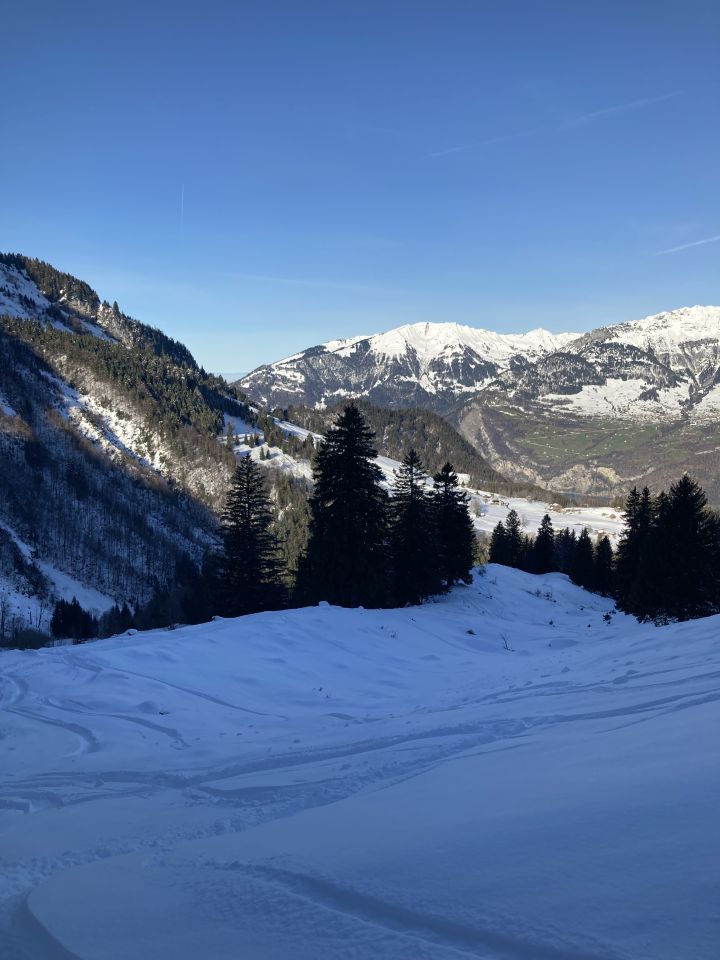 Obstalden grün, geschlossene Schneedecke ab etwa 900. Tragezeit für ÖV vermutlich etwa 2km. Beim PP Hüttenberge (1033) wenige cm Pulver auf solider Unterlage. Auf dem Waldweg nach Ammenlii (1060) noch ein paar trockene Stellen. Ab Chratzegg (ca. 1250) dann deutlich dickere Power-Auflage. Offenes Gelände der Firzalp windgeprägt, am Gipfelaufbau liegt der Eispanzer stellenweise blank.