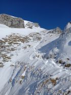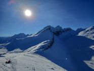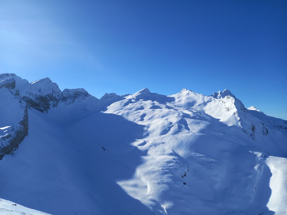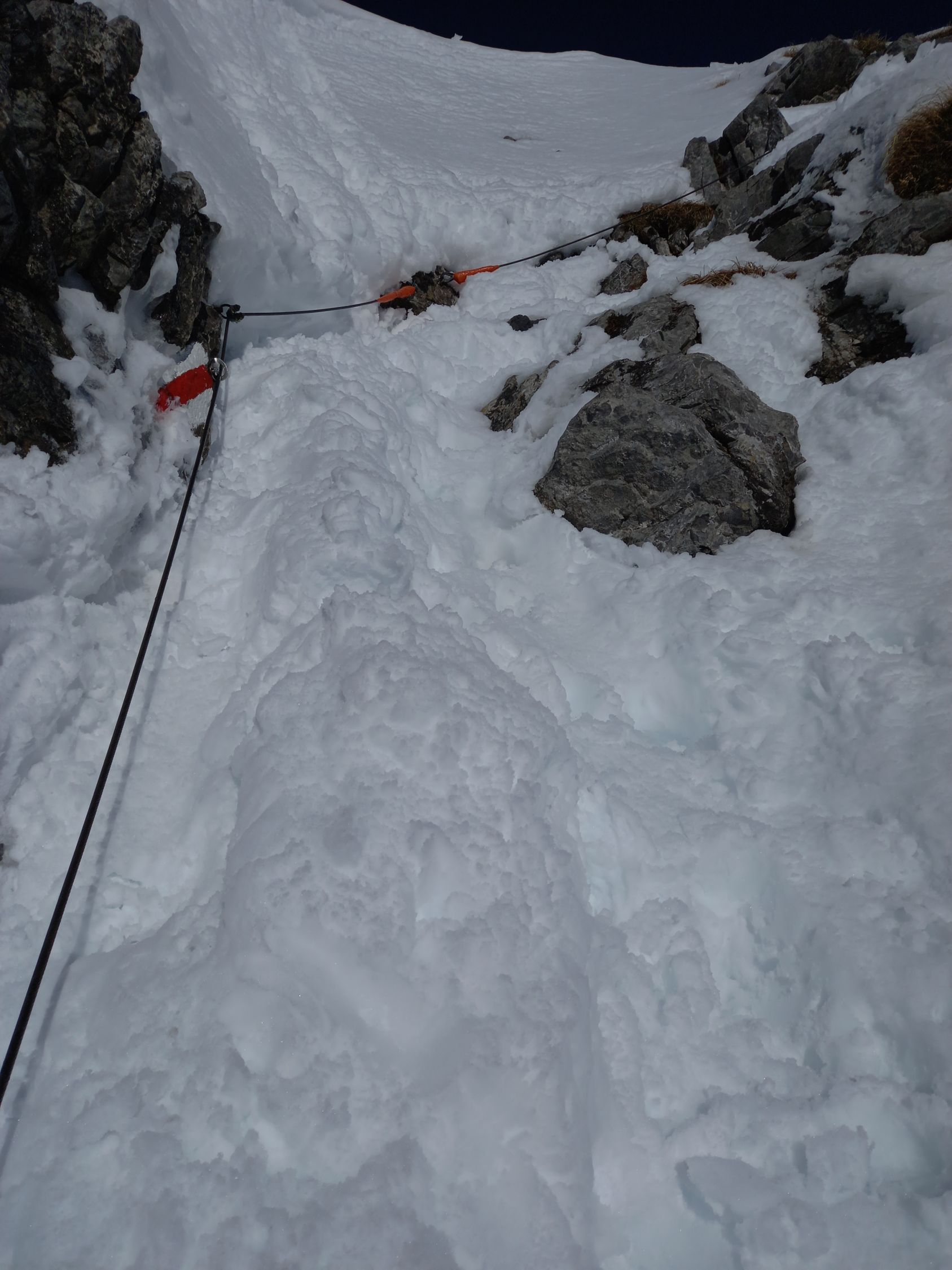 Mit dem Bus hoch , Start um 10 Uhr. Für die Jahreszeit fast schon üppig Schnee, hurtig hoch auf guter Spur zu Hanenspil und über die Seen weiter zum Isisitzgrat. Der Gratrücken zum Margli hat auch schon gut Schnee, Verhältnisse im Aufstiegscoulor gut: mit Trittschnee und fast kein Eis, unteres Kabel jetzt freigeschaufelt. Schöne Aussicht auf das Gedränge auf der Rosswies.