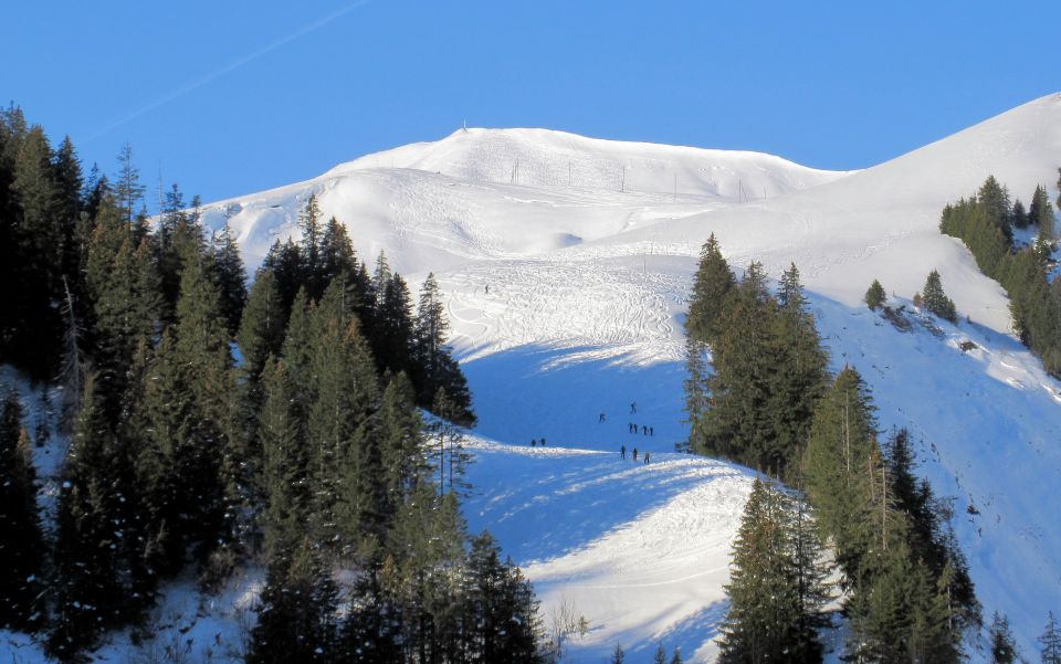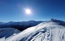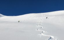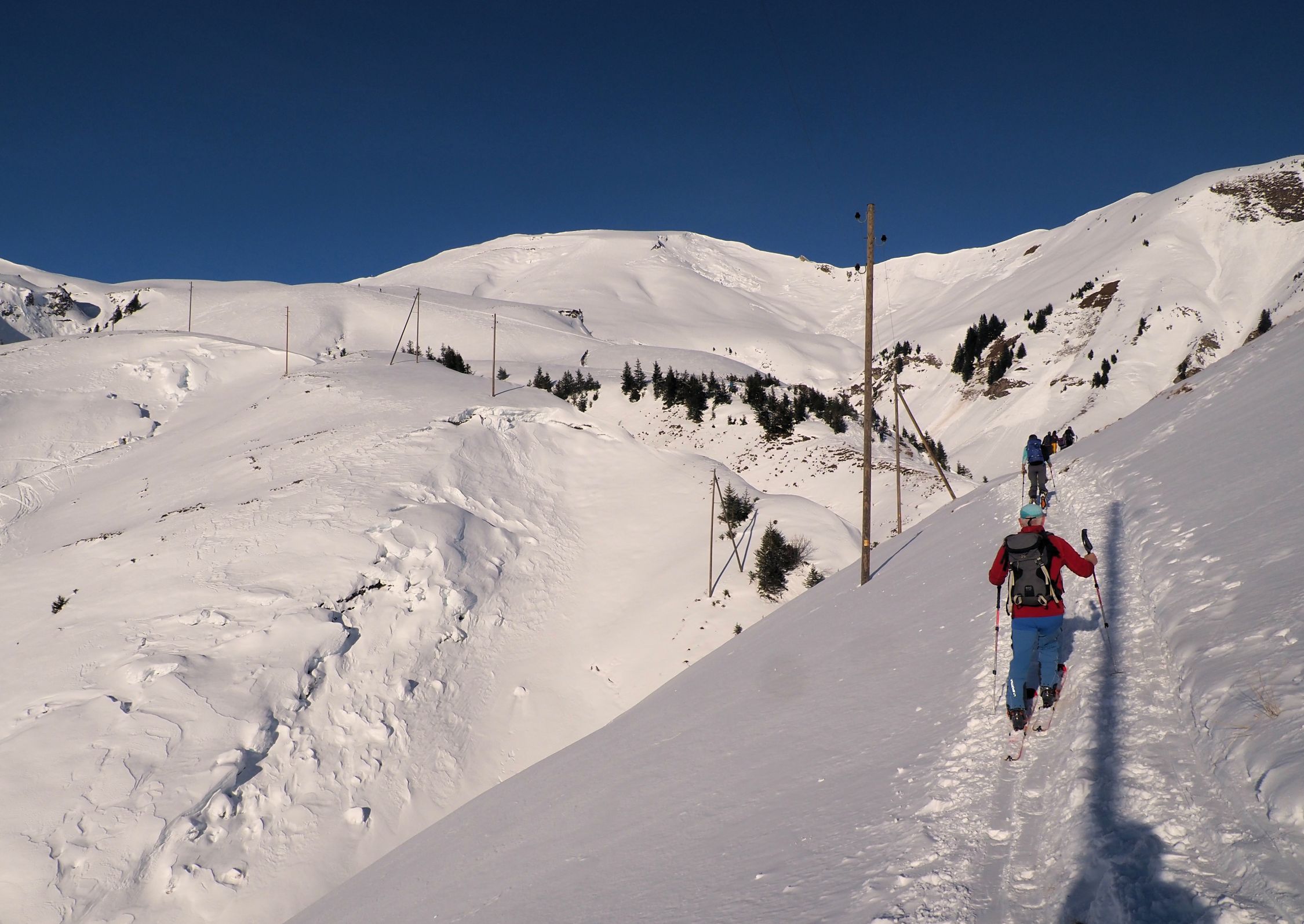 Mit den ersten beiden Bahnen nach 9 Uhr kamen viele Tourengänger. Kein Wunder bei dem tollen Wetter. Es hat viel Schnee ab der Bergstation. Zwischen 10 - 20 cm Neuschnee auf gut tragender Unterlage. Im Vergleich zum letzten Jahr liegt der Schnee fast durchgehend unverweht. Es hat etliche gute Aufstiegspuren. In der Sonne sind sie etwas feucht, im Schatten pulverig - das gab wenig Stollen. Mit etlichen Tourengängern sind wir gemütlich aufgestiegen, sie haben sich gut verteilt.
