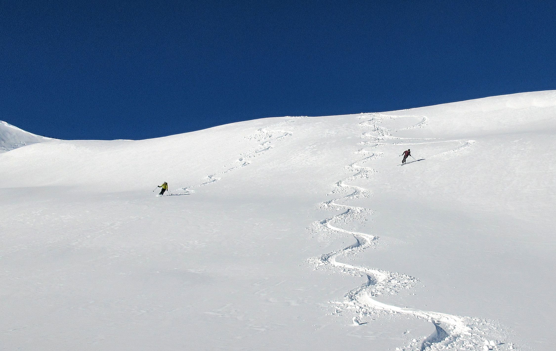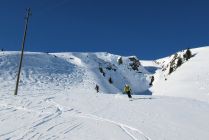 Abfahrt: Wir sind etwas nördlich vom Grat vor dem Arnifirst in den Osthang eingefahren und konnten im feuchten Pulverschnee schöne Kurven ziehen. Weiter unten im Flacheres stellenweise noch schöner, lockerer Pulver. Es hatte natürlich etliche verspurte Hänge. Auch diese liessen sich gut fahren. Selbst kurz ob der Bergstation fanden wir noch schönen Pulverschnee.