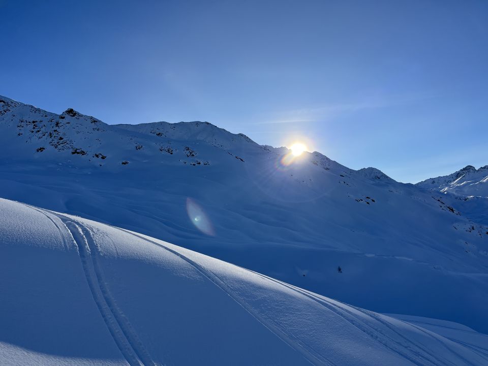 Früh gehen lohnt sich; die Sonneneinstrahlung wandelt den Pulverschnee rasch um.