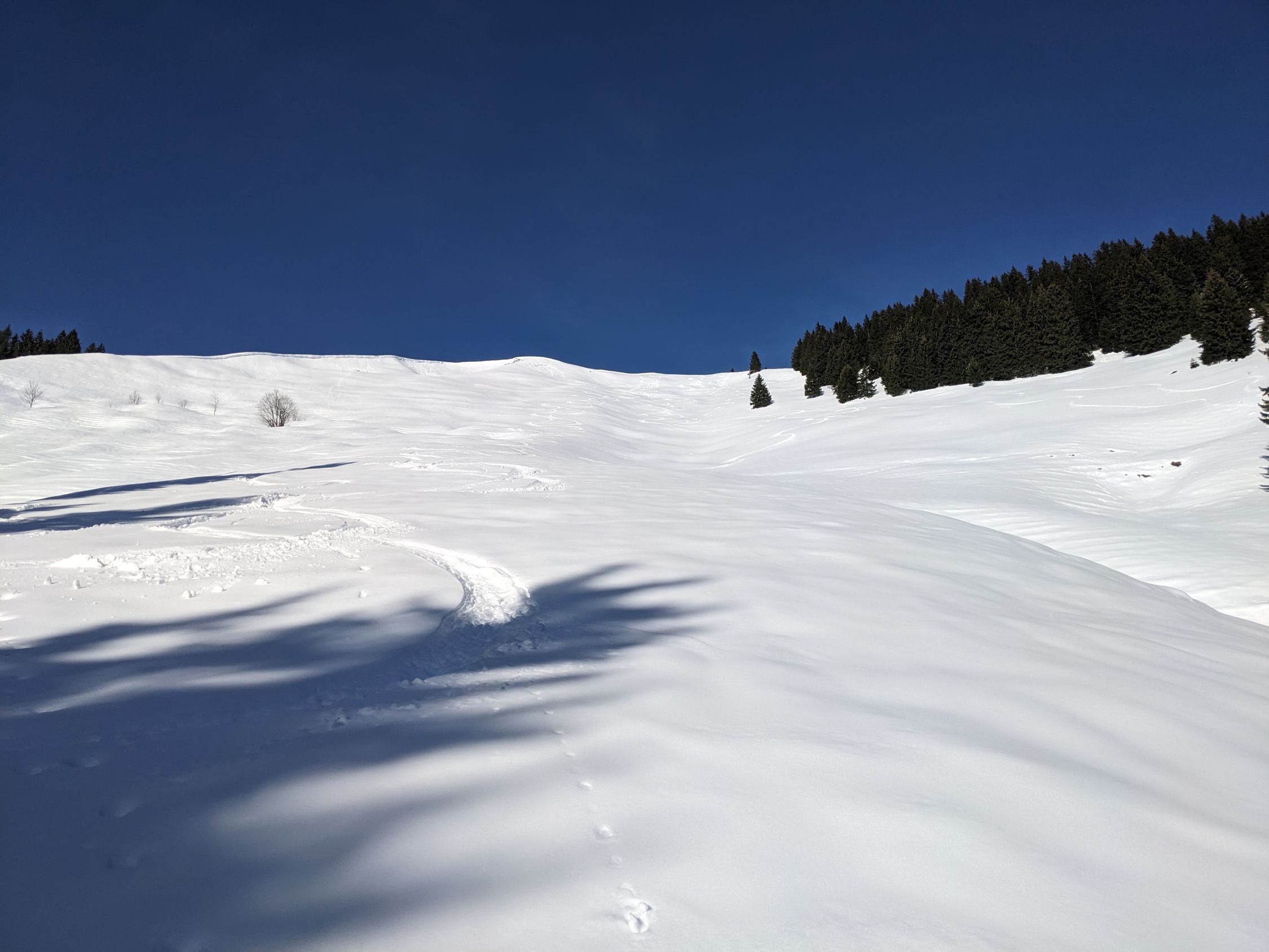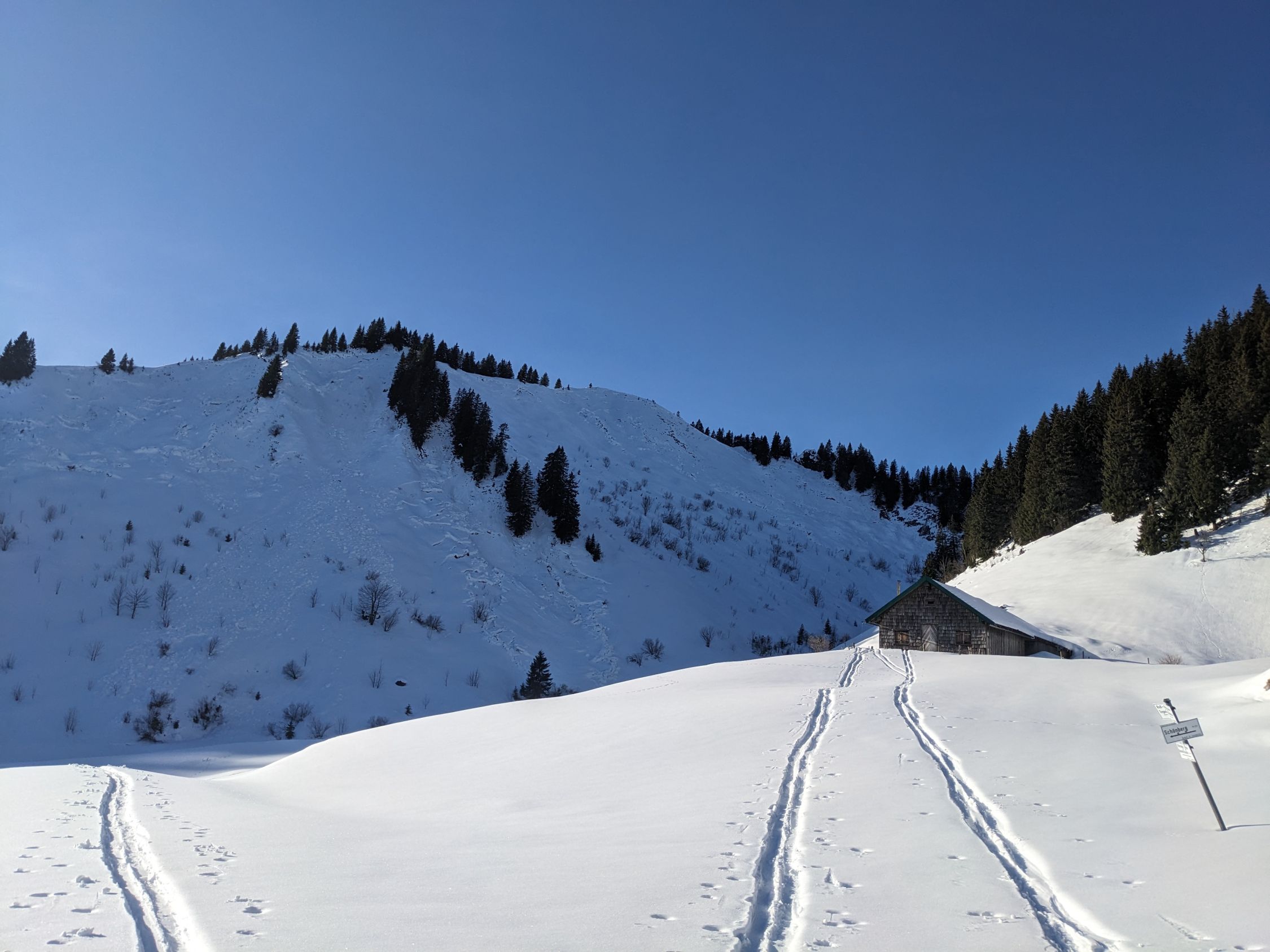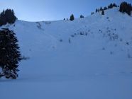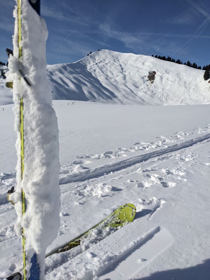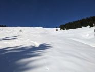 Insgesamt alles, was kein Süd in der Exposition hat noch pulvrig, Hänge über 35° oft mit Gleitschneerissen und -Abgängen, ein kleiner auch frisch am Schönberg. Steil südseitig kann die Schneequalität nicht ganz mithalten, hier droht ein Deckel. Und gut gewachste, nicht stollende Felle wären sehr von Vorteil.