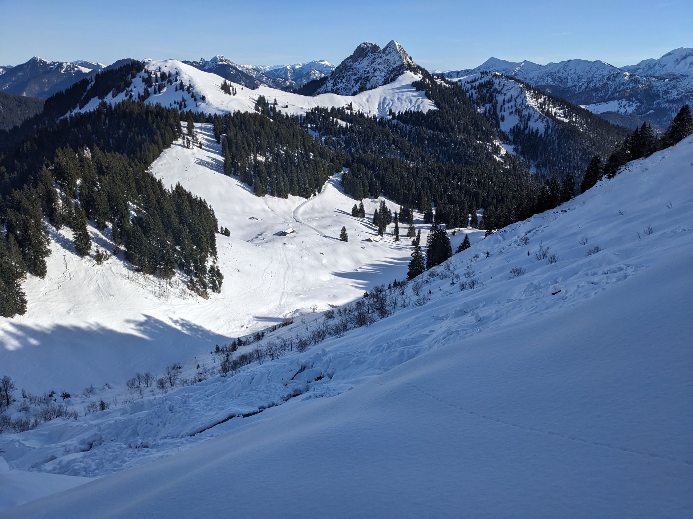 Anstieg zur Hochplatte, auch hier Osthang total verlahnt. Schließlich Abfahrt nordöstlich des Kamms nördlich der Roßsteinalm, hervorragender Schnee, bisher eine Spur. Kurzes Stapfen zum Buchsteinhaus, Abfahrt über Forstweg bis auf den Parkplatz noch ohne Unterbrechung.