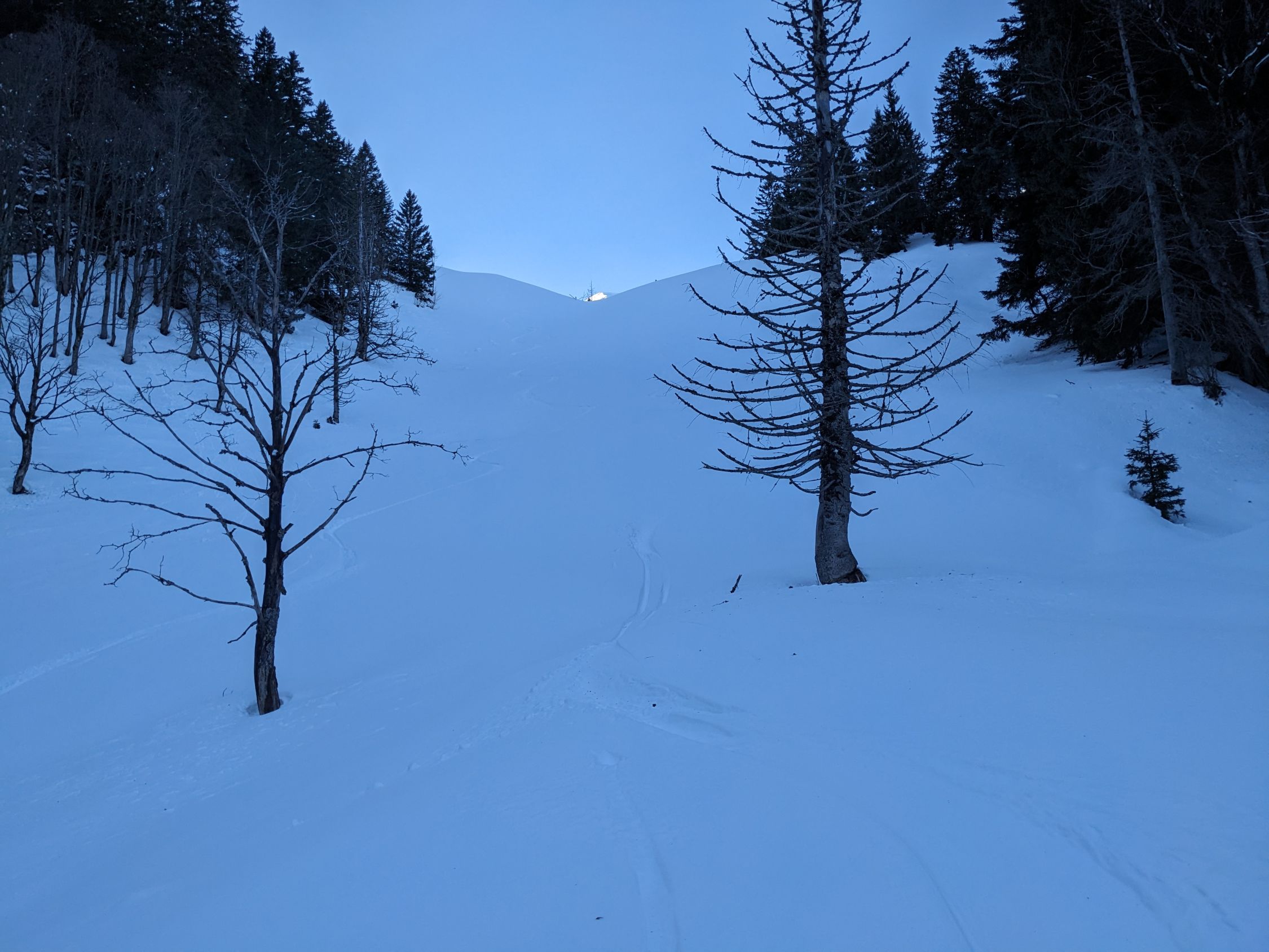 Schnee ab Parkplatz, aber dünn. Aufstieg links des Bachs, mit Schi dank vieler Unterbrechungen aber nicht empfehlenswert.