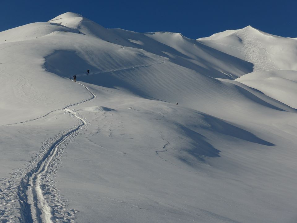 Wolkenlos; warm (6° am Gipfel). Tolle noch unverspurte Hänge bis 1700 m. Pulverschnee auf den Osthängen, etwas aufgeweicht bei den tiefer gelegenen Südosthängen.