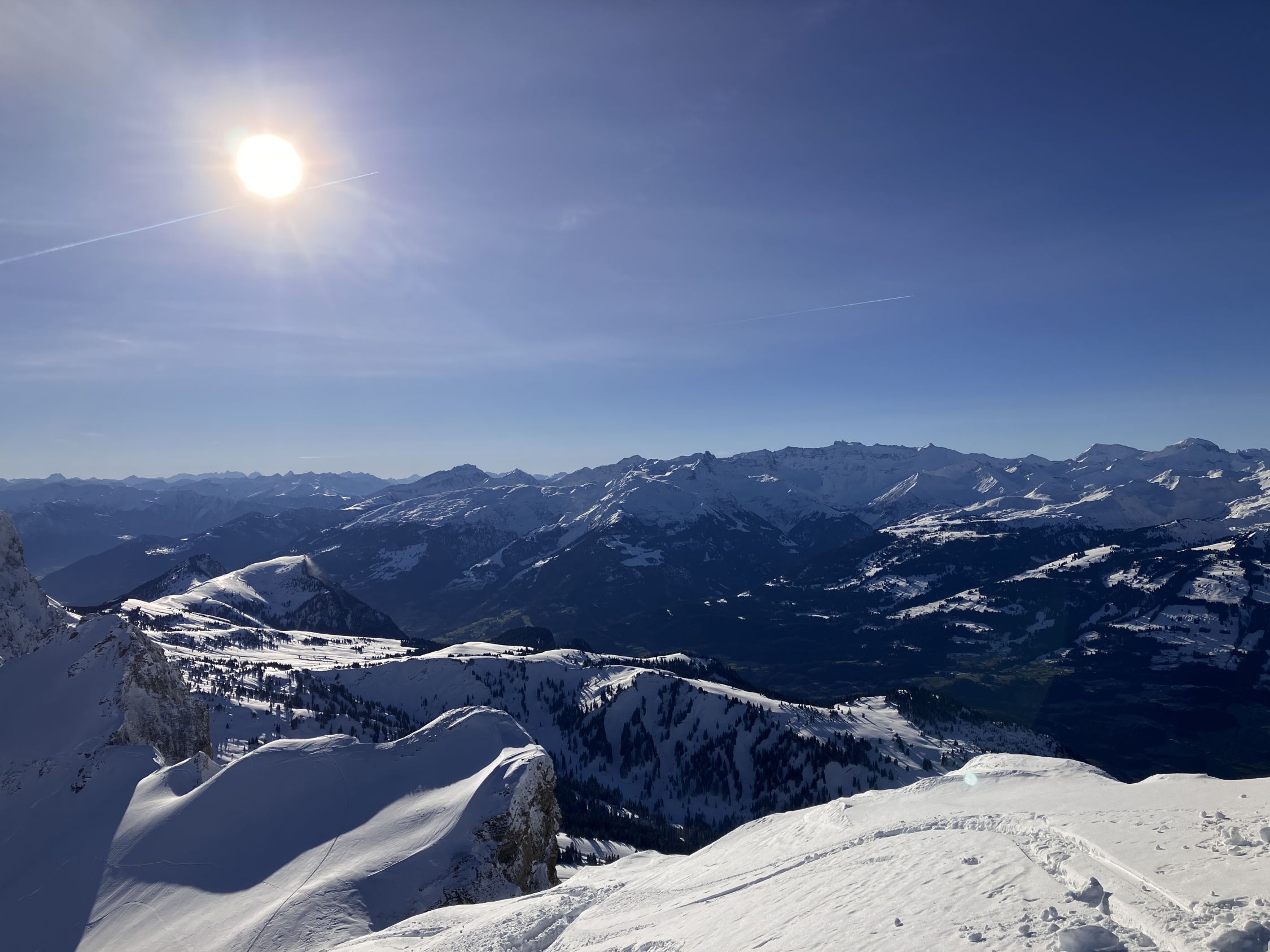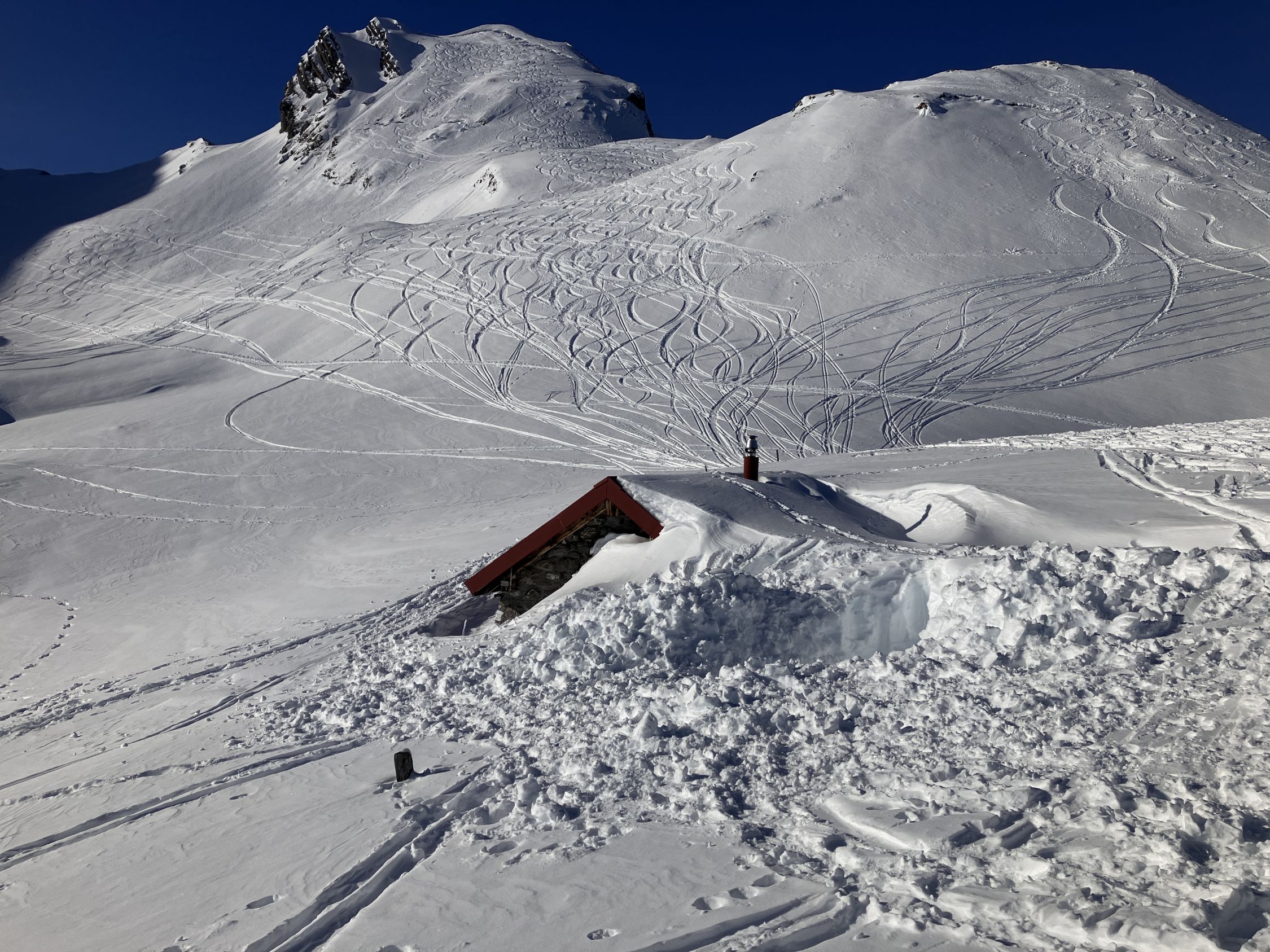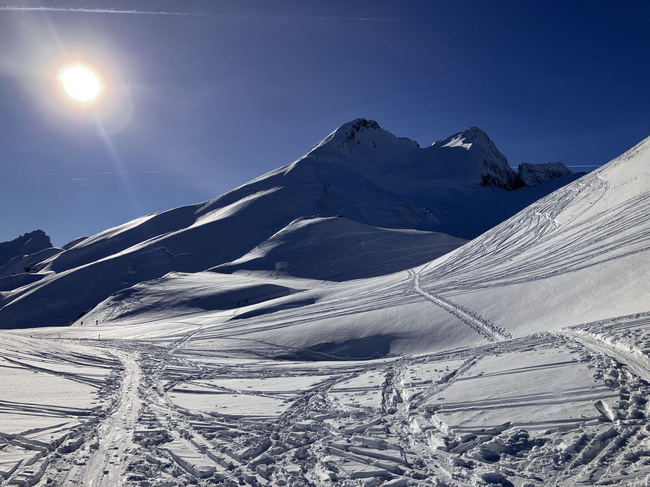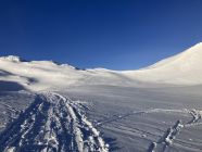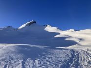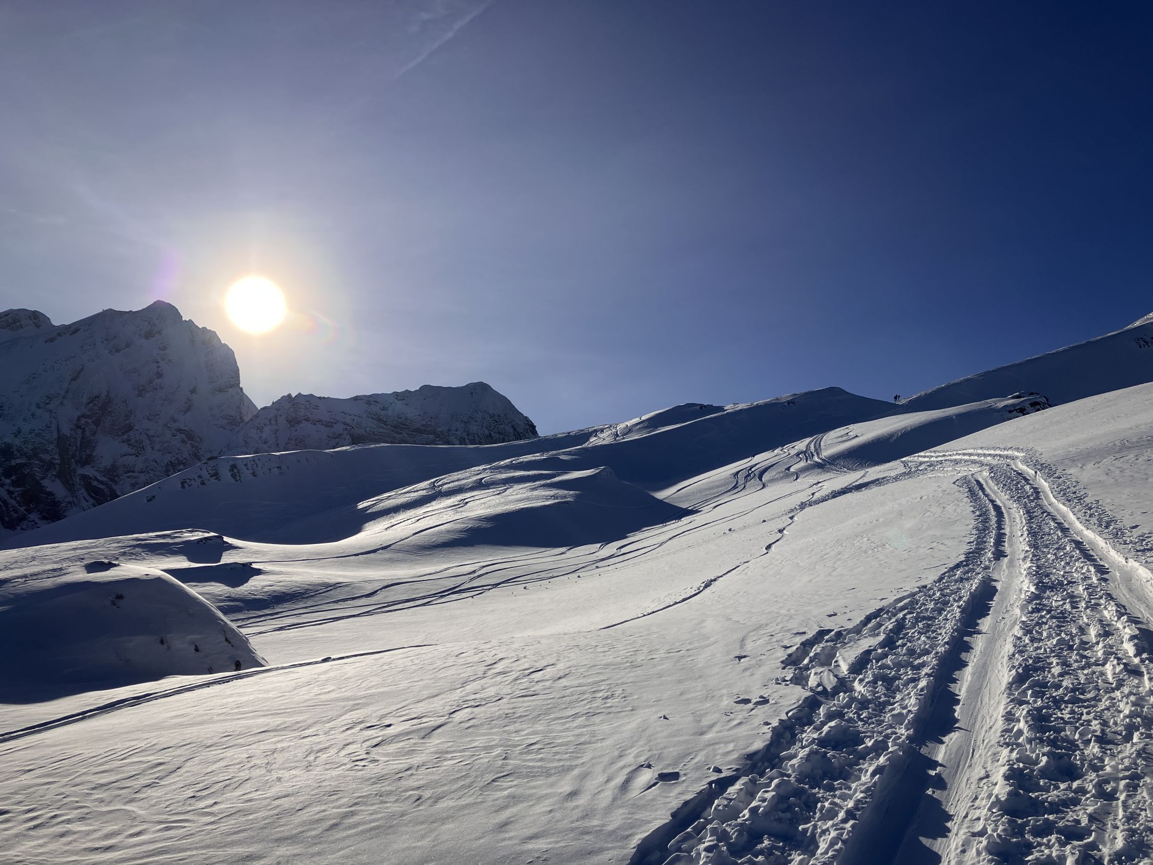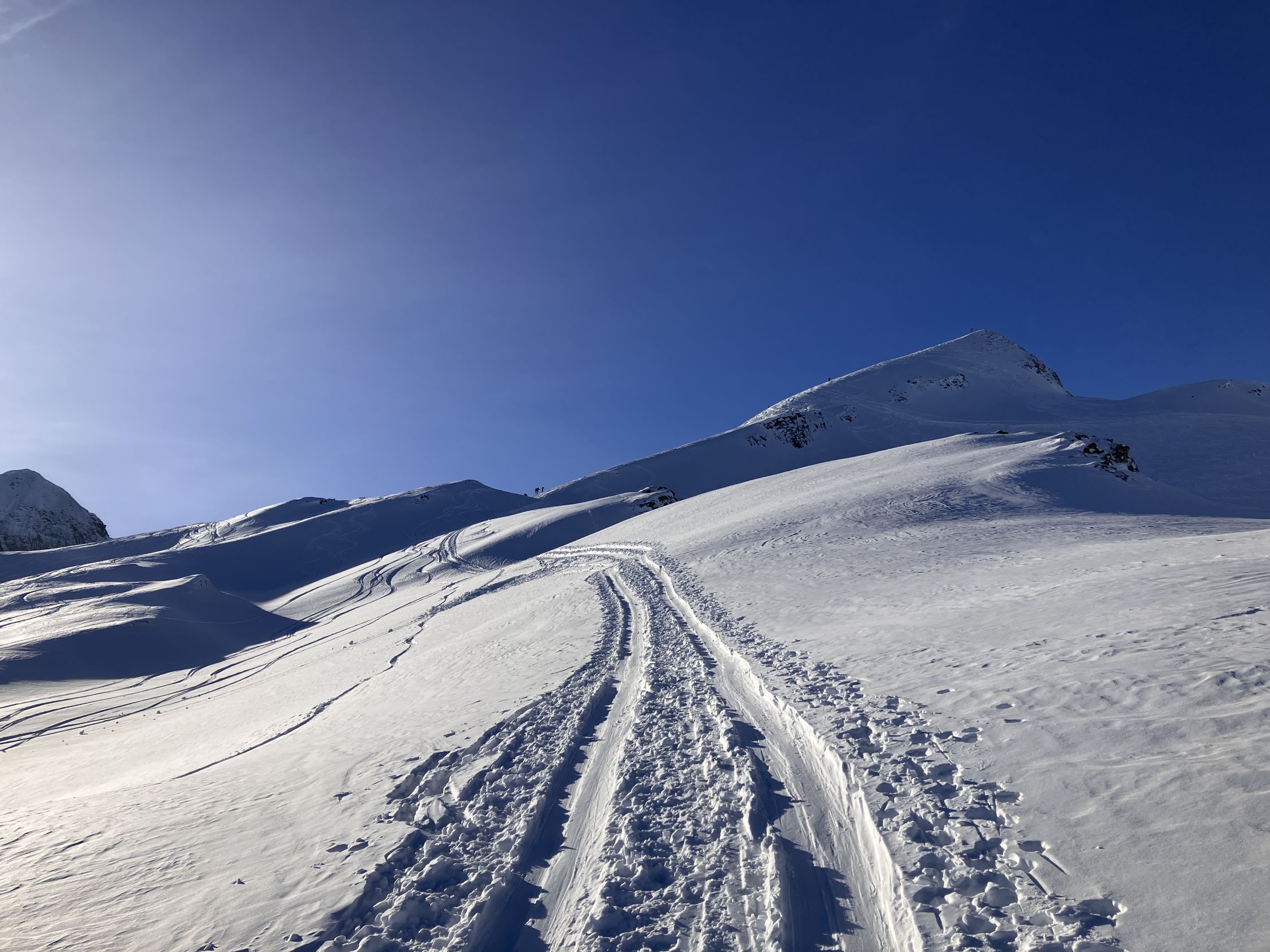Abfahrt vom Gipfel bester Pulver, bin die Mulde westlich der Aufstiegsspur abgefahren und vom Isizgrat zur Abfahrt vom Fulfirst rübergequert. Ab da dann manchmal eisiger Altschnee unterm Pulver, aber trotzdem gut zu fahren.