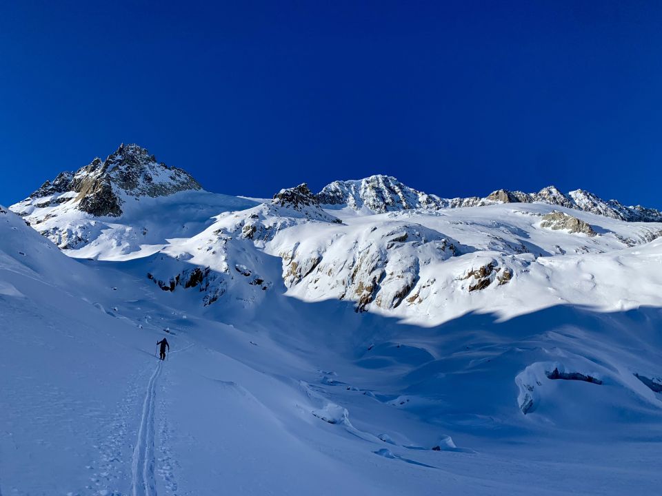 Für diese Jahreszeit waren die Temperaturen etwas zu warm. Daher der Schnee schon bald ziemlich schwer, vor allem auch bei der Abfahrt. In ein paar Nord/Schattenhängen jedoch teilweise schöner Pulverschnee. Spuranlage sehr gut. Heikel und etwas mühsam ist die Querung nach dem Tiefenbach-Restaurant der Passstrasse entlang, weilt dort schon einige Hänge runter gekommen sind und die Strasse voll von Lawinenkegeln sind. Trotzdem eine wunderschöne Tour mit eindrücklichem Ambiente der umliegenden Berge der Furka-Kette. Zusätzlich belohnt der Weitblick vom Bündnerland bis in die Walliseralpen.