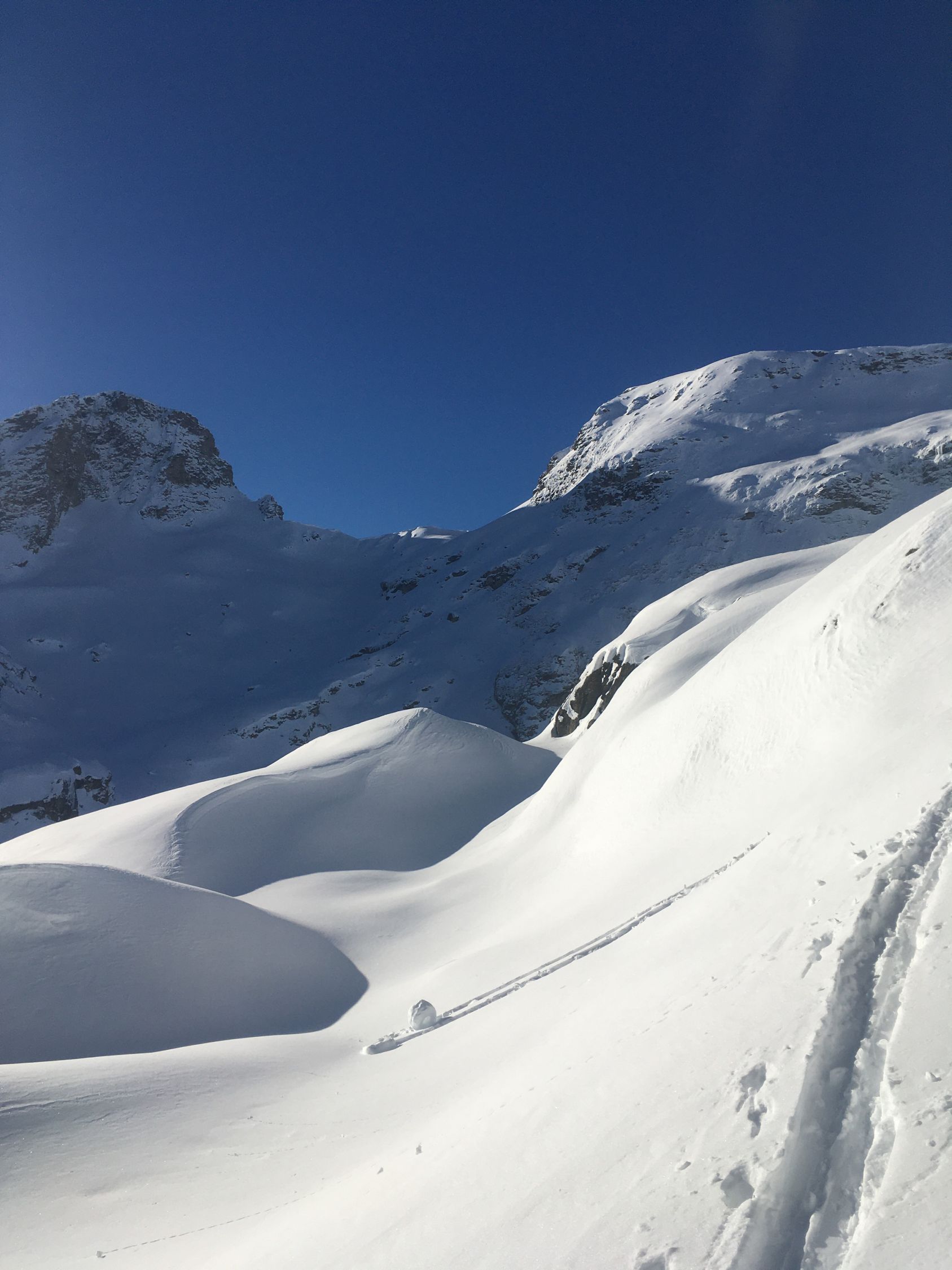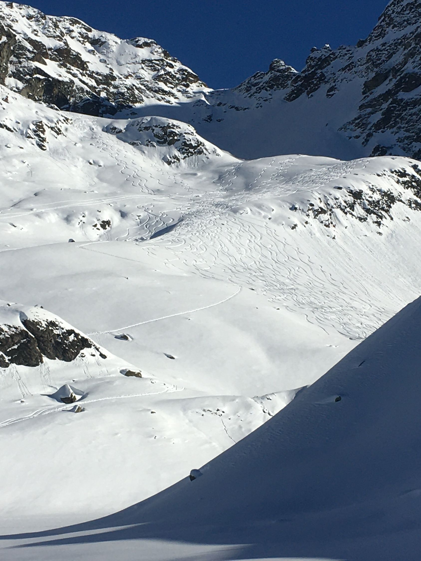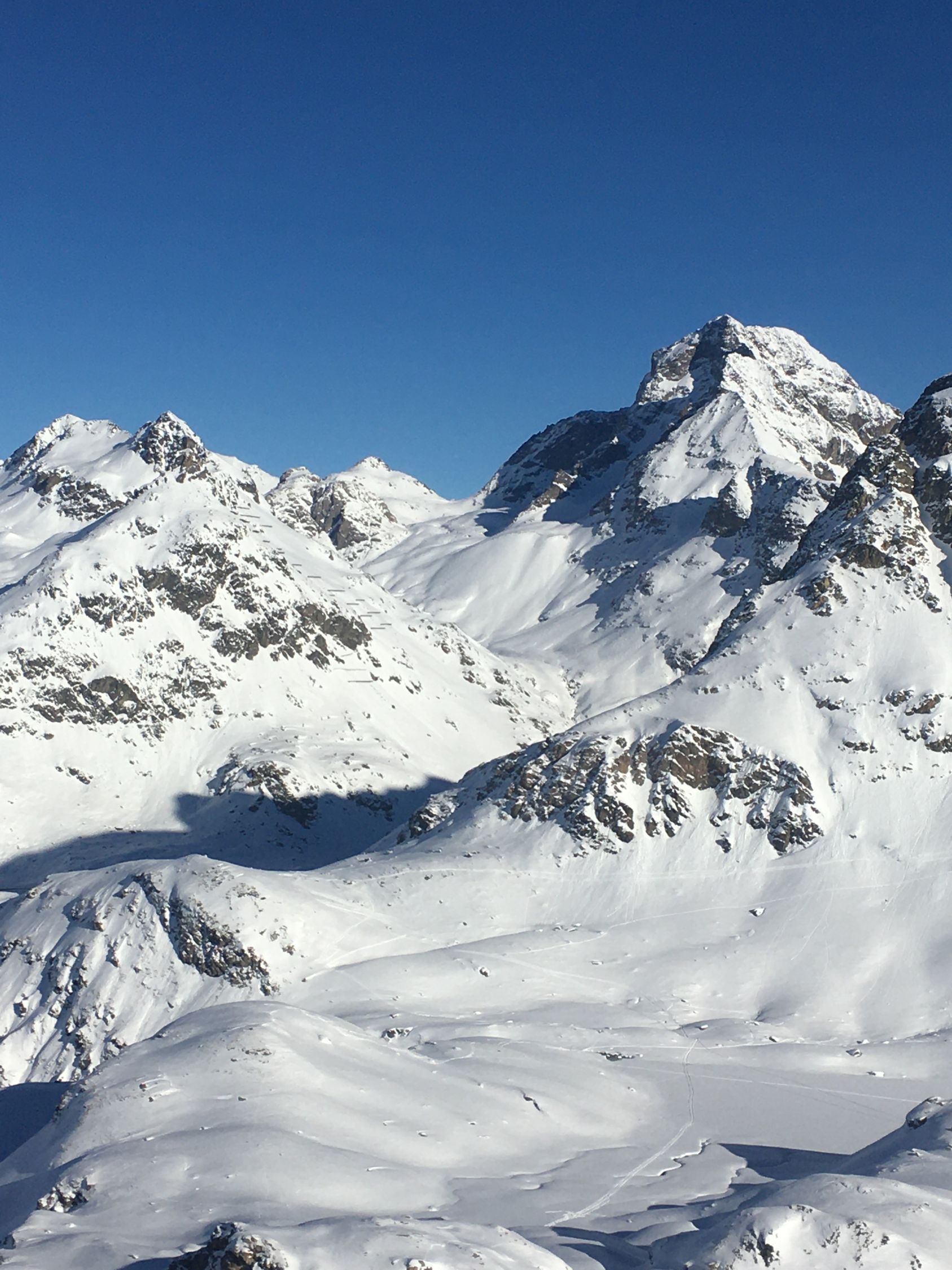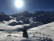 Kurze Tour auf den Felsgipfel P. 2581 östlich der steilen Flanke Piz d‘Emmat Dadora, WS-. Start La Vaduta 8.45 Uhr, minus 3 Grad, leichter Westwind. Gute Spur bis vor meinem Ziel Punkt 2581. Zwei Tourengänger haben mich überholt kurz nach Leg Grevasalvas. Kurz vor meinem Ziel waren sie verschwunden, vermutlich sind sie zur Julierstrasse abgefahren. Ich machte mich um 12 Uhr bereit, da sah ich um 12.15 Uhr zwei Tourengänger in der Ostflanke für Aufstieg Piz d‘Emmat Dadora . Für meinen Geschmack etwas spät, in der Abfahrt dann im Schatten. Tolle Pulverschnee Abfahrt zum Leg Grevasalvas, nur Aufstiegsspuren, anfellen für Aufstieg zu Punkt 2449 und perfekte Abfahrt zur Veduta.
