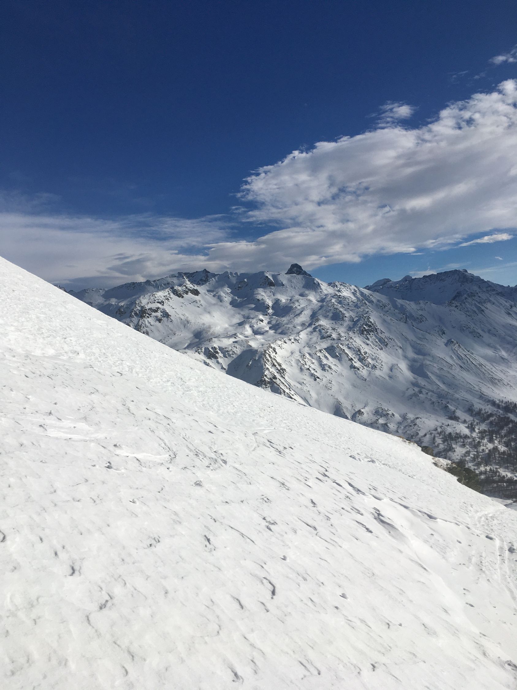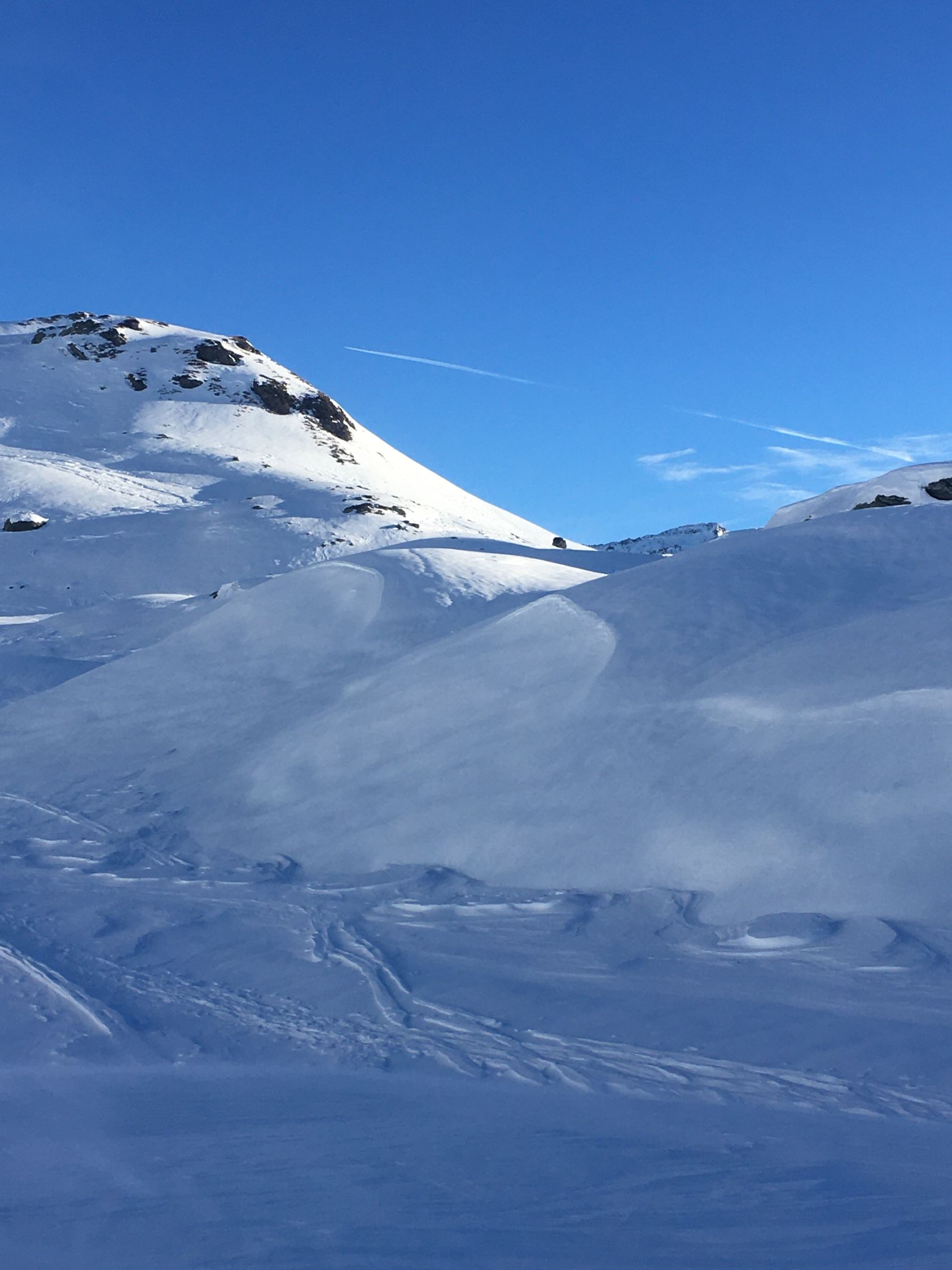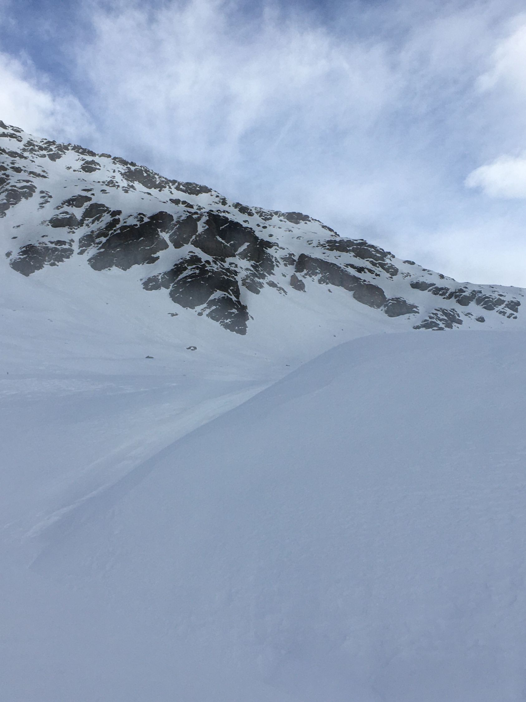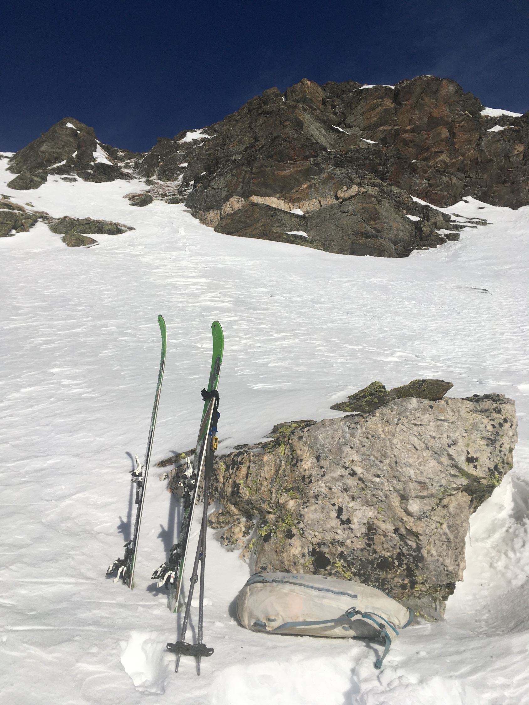 Hartschnee und starke Sturmböen hoch über dem Lago Bianco Südostflanke Piz Lagalb. Start 8.30 Uhr Parkplatz Berninapasstrasse unterhalb Ospizio Bernina, minus 2 Grad, starker böiger Nordwestwind. Alles pickelhart bis Flanke Lagalb, der Wind haute mich teilweise fast um, lästig. In der Flanke gute Spur bis Skidepot. Abfahrt nicht schlecht, teilweise Pulverschnee auf der harten Unterlage, unten teilweise Bruchharsch.