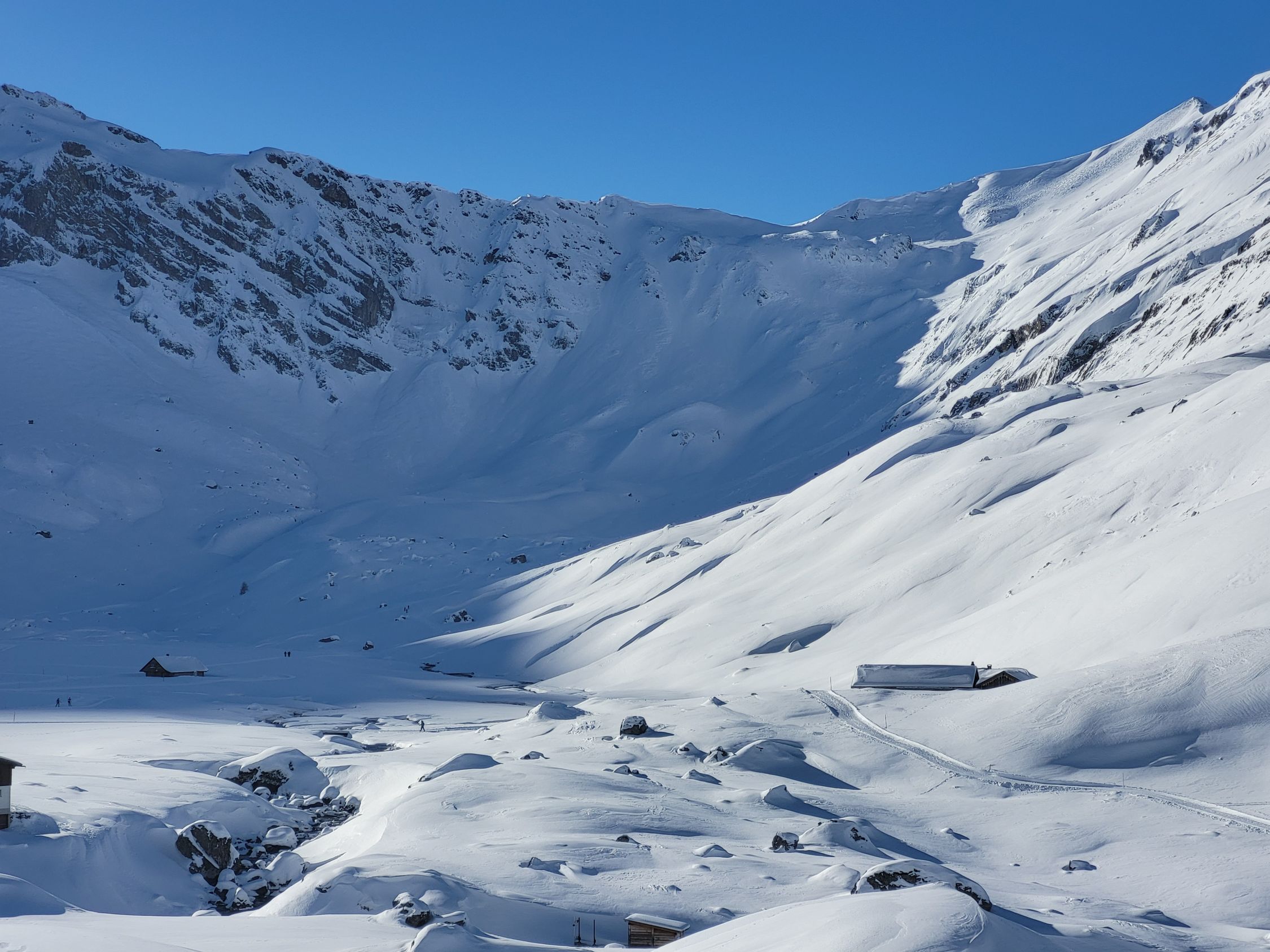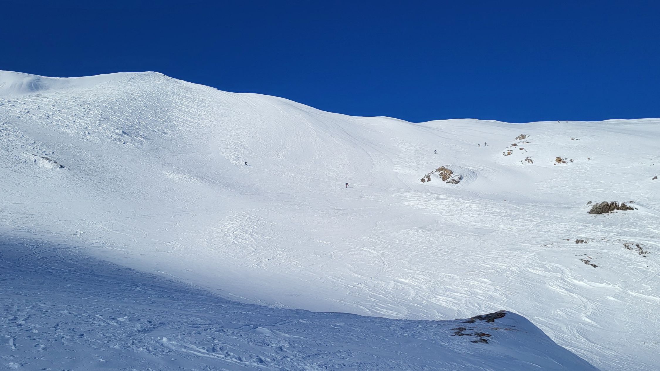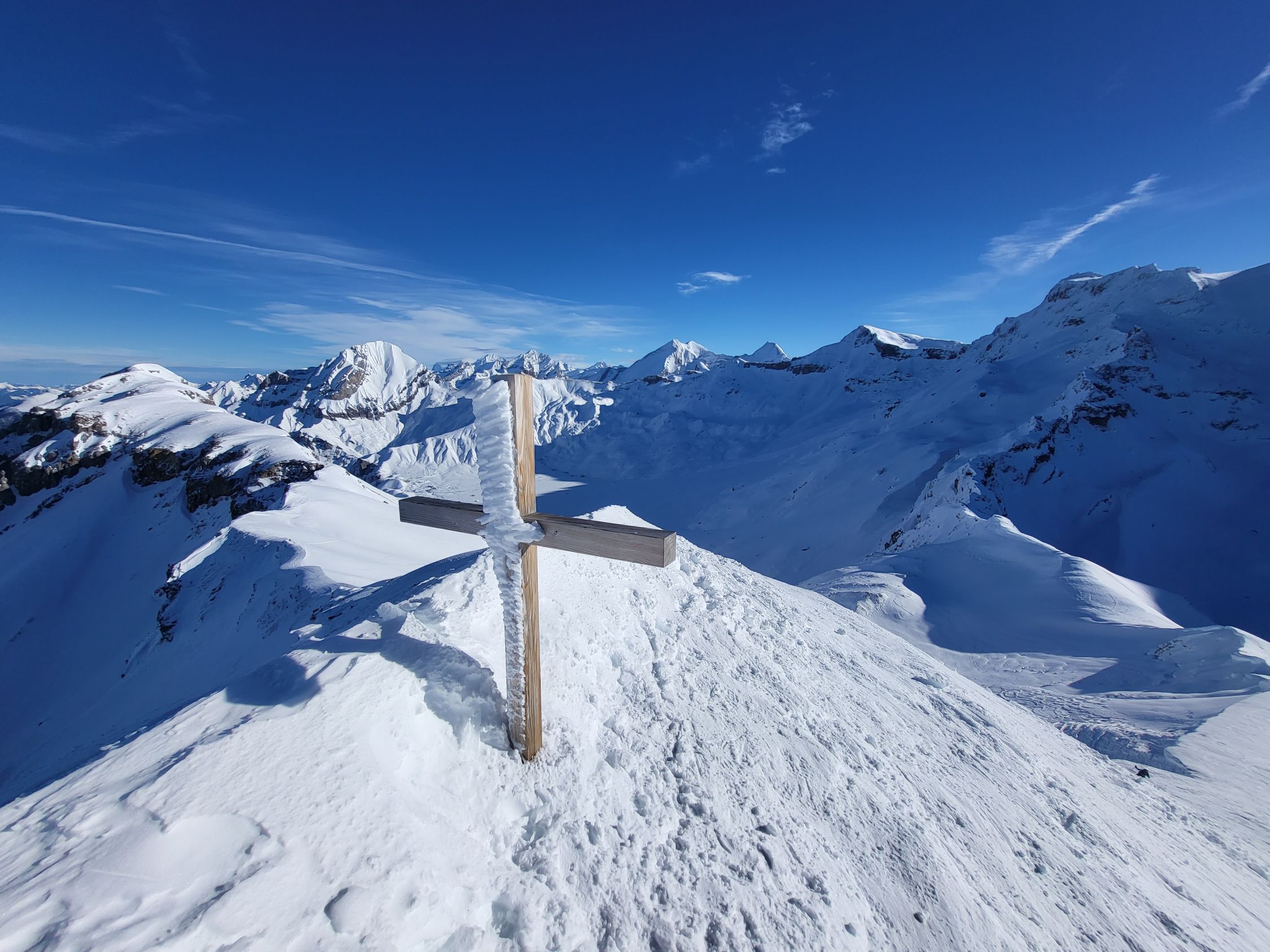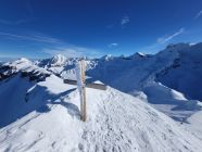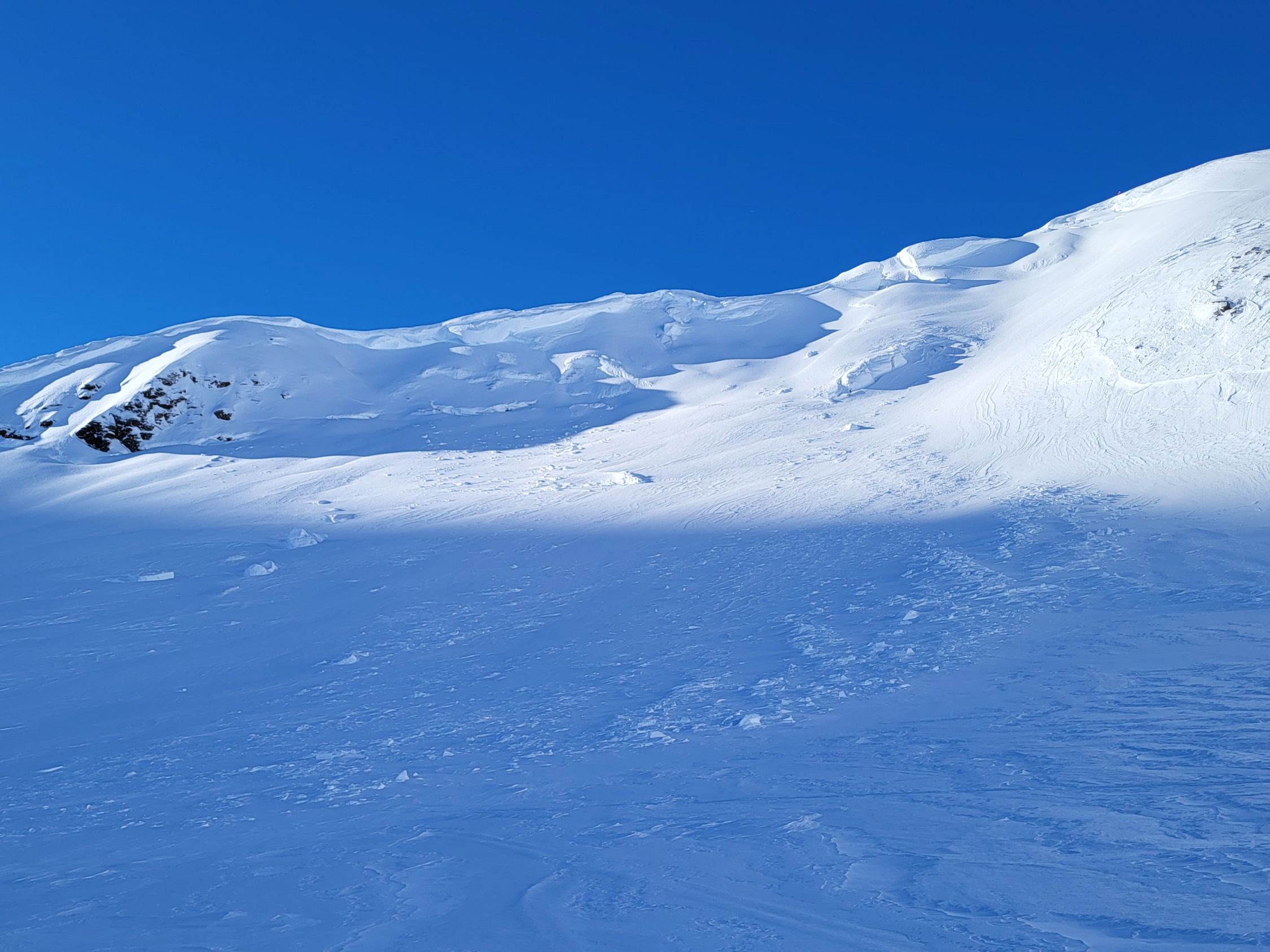 Der Neuschnee wurde vom starken Wind verfrachtet. Zum Glück tragender Deckel. Auf dem Grat zum Gipfel nicht mehr viel Schnee und relativ hart. Habe Harscheisen montiert, wäre aber auch ohne machbar. Die späteren Gruppen sind direkt durch die ESE-Flanke und zuletzt einige Meter über den NE-Grat zum Gipfel aufgestiegen. Dies wäre heute die bessere Variante gewesen, da auf dem Grat ein starker Wind wehte. Abfahrt direkt durch die Flanke auf tragender griffiger Schicht.