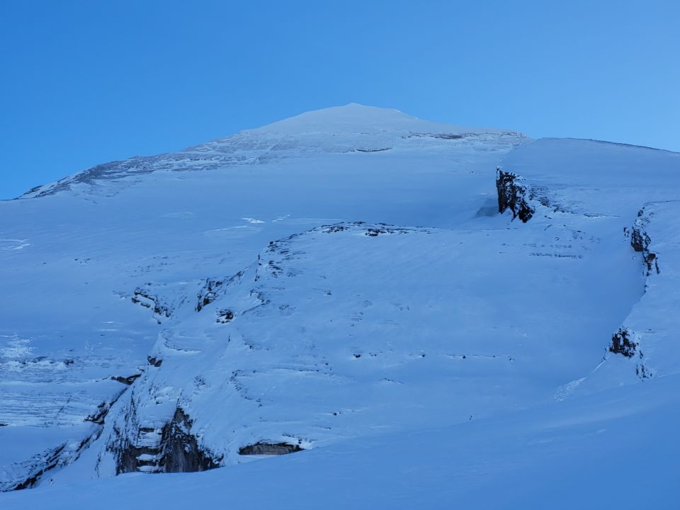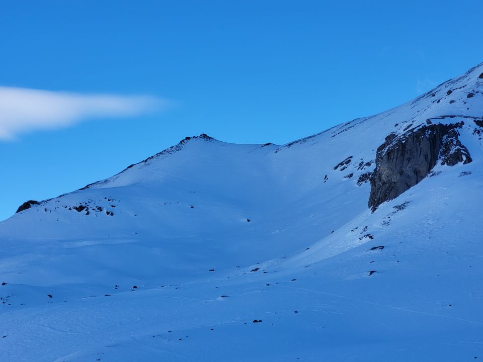 Es hat genug Schnee, aber dieser wurde durch den starken Wind bearbeitet. Meistens tragender Deckel, teilweise Bruchharsch. Kurz vor dem Gipfel ziemlich hart, fast eisig.
