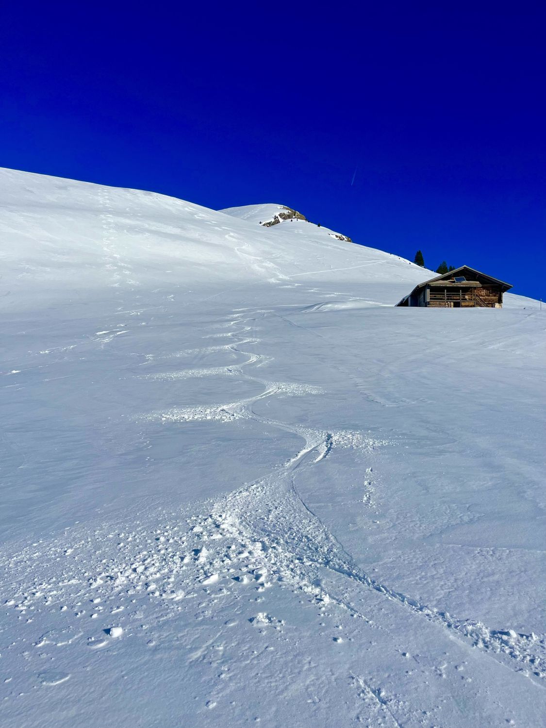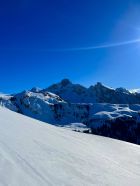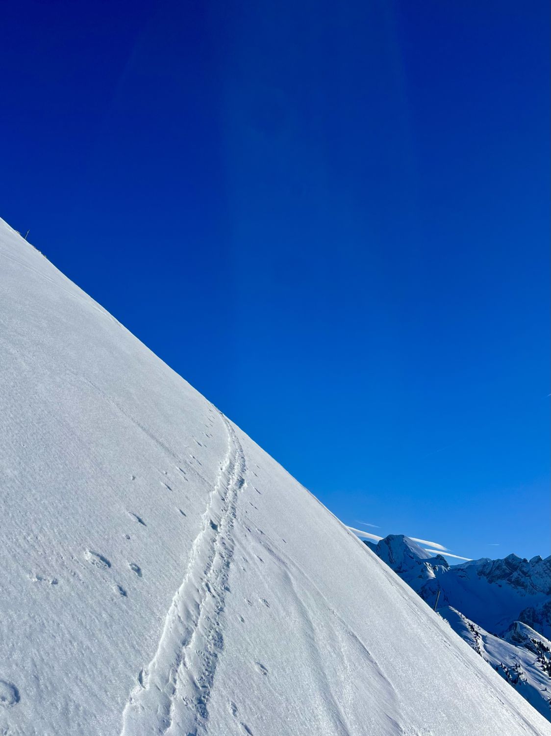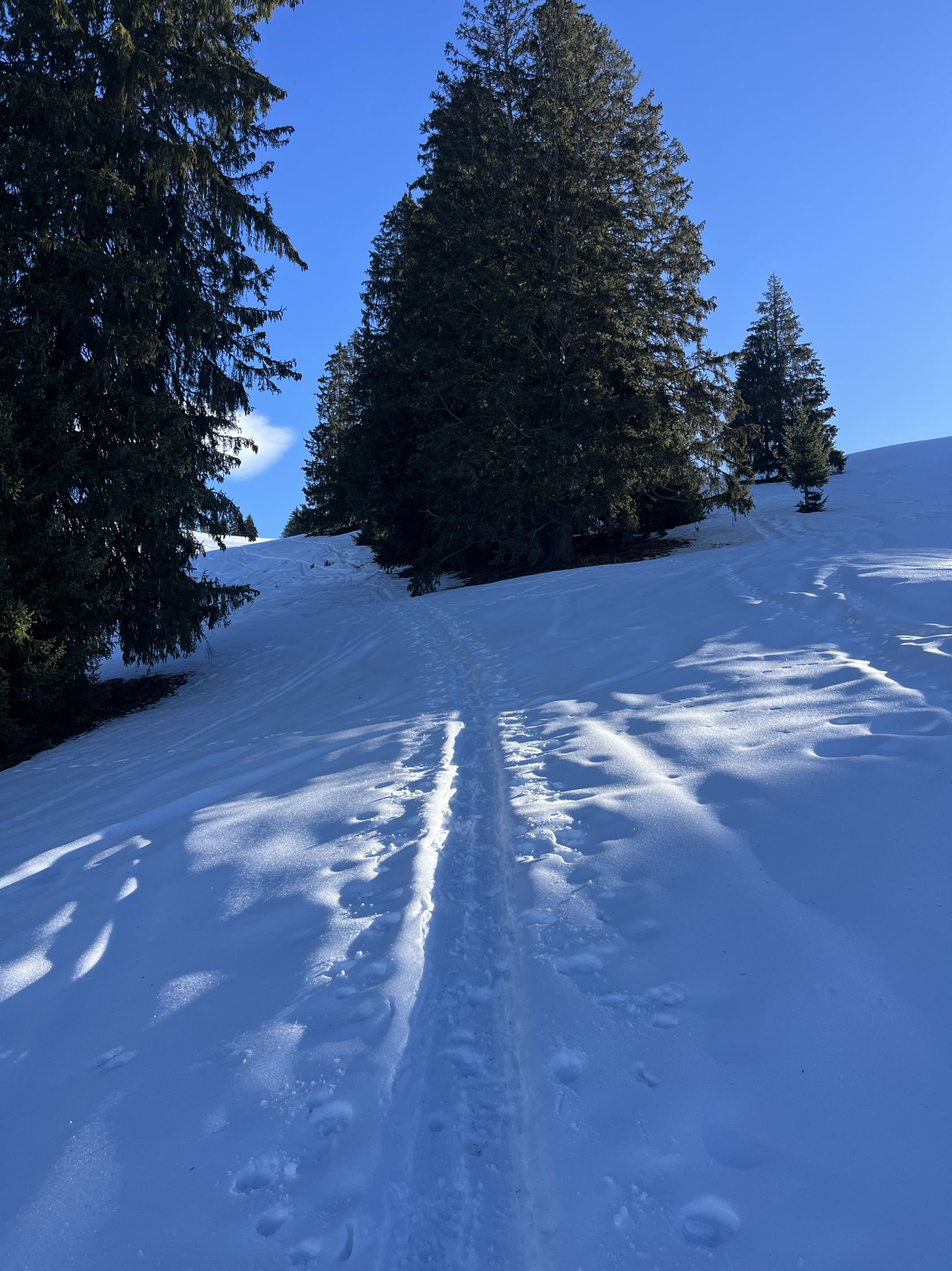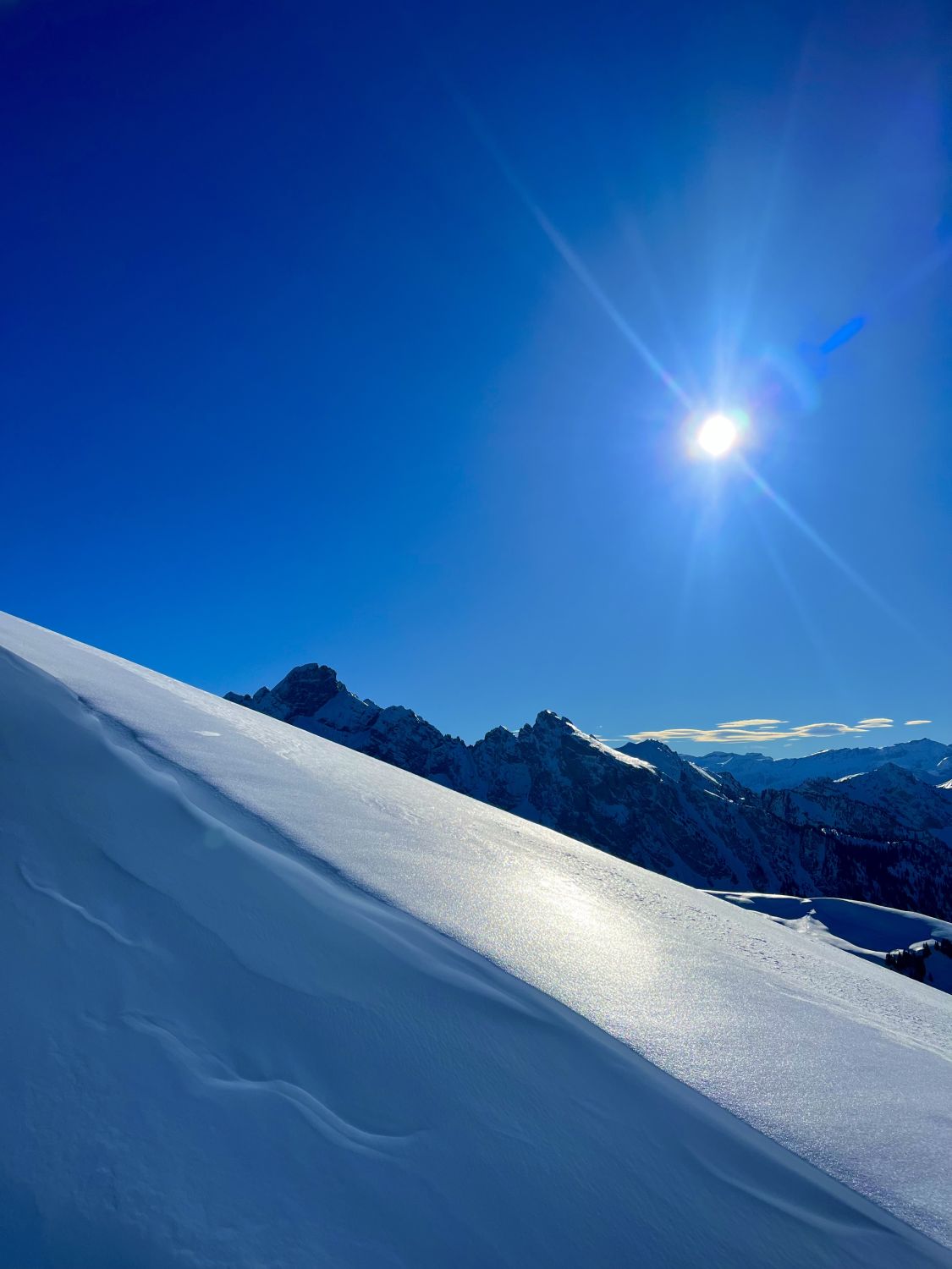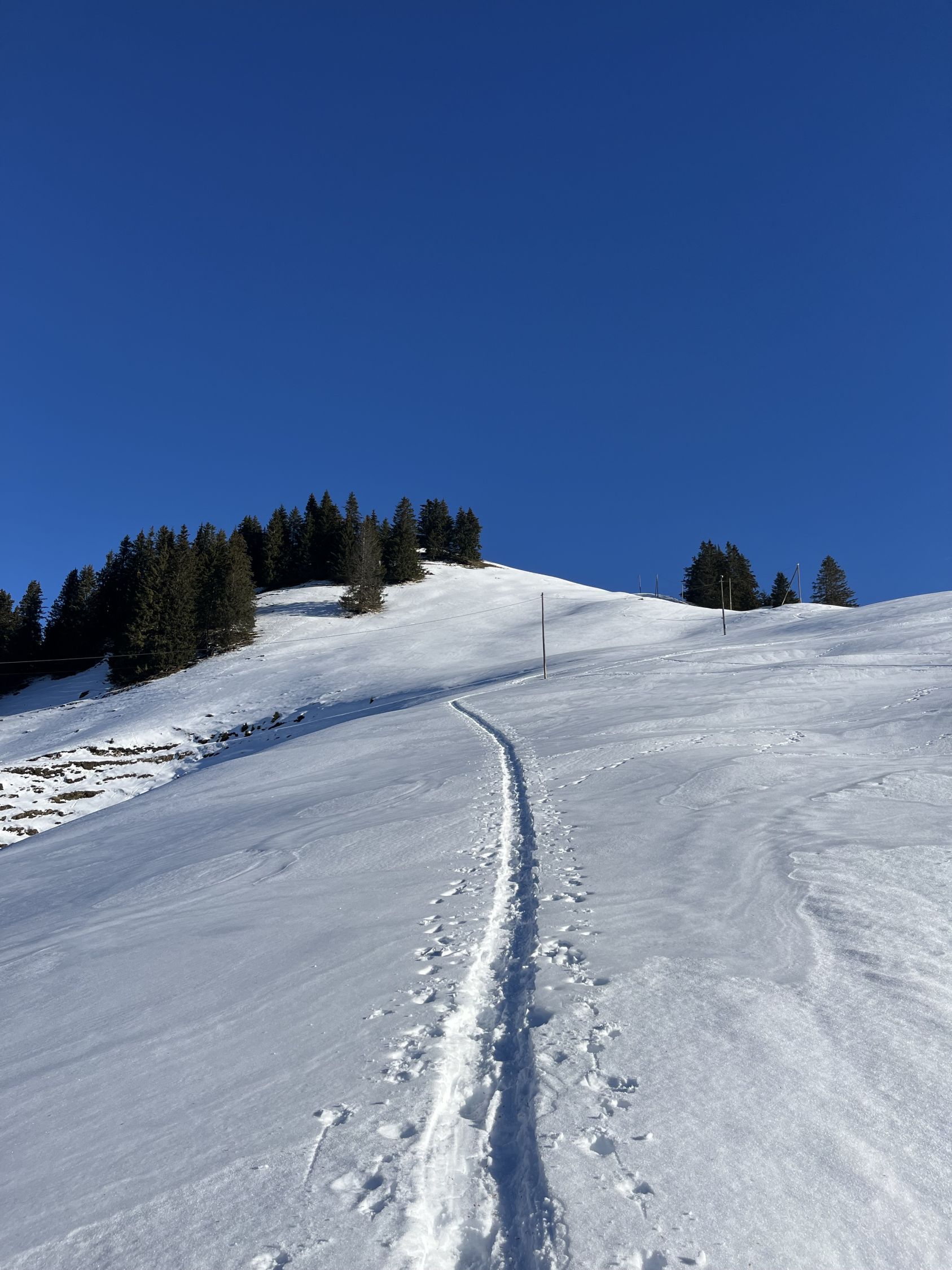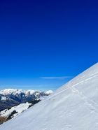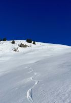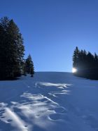 Traumhaft schönes Wetter, wenig Wind und angenehme Temperaturen. Bin mit dem Auto bis auf 1420m zur Kurve vom Gärsterewald gefahren. Ab dort hat es genügend Schnee. Ab 1600m hat es recht viel Schnee. Im unteren Teil hat es ein wenig Deckel, aber dann kommt schöner Pulverschnee. Habe das Timing recht gut erwischt und bin um 12.30 Uhr vom Gipfel abgefahren. An Sonnenhänge schon ein leichtes Sülzli auf guter Unterlage. Sehr schön zum fahren. Auch wenn das Türli etwas kürzer ausfällt, hat es sich gelohnt. Es war sonst niemand auf dem Gipfel. Ausser Spuren von Hasen, Füchse, Gemsen und Rehe, war ich allein.