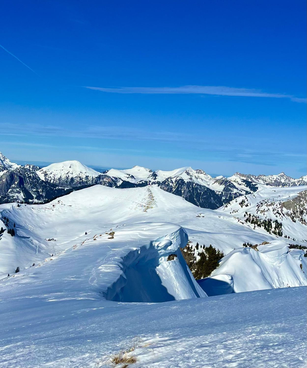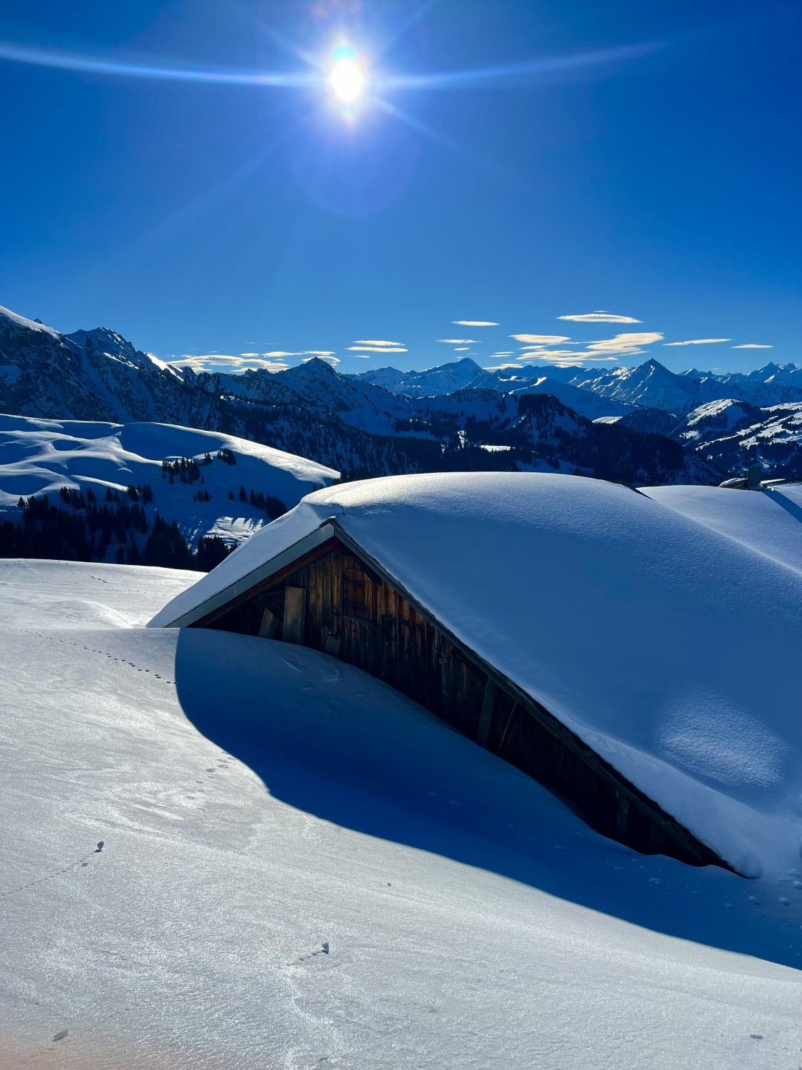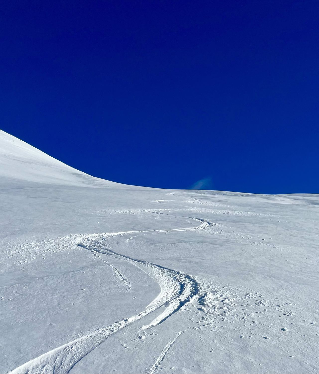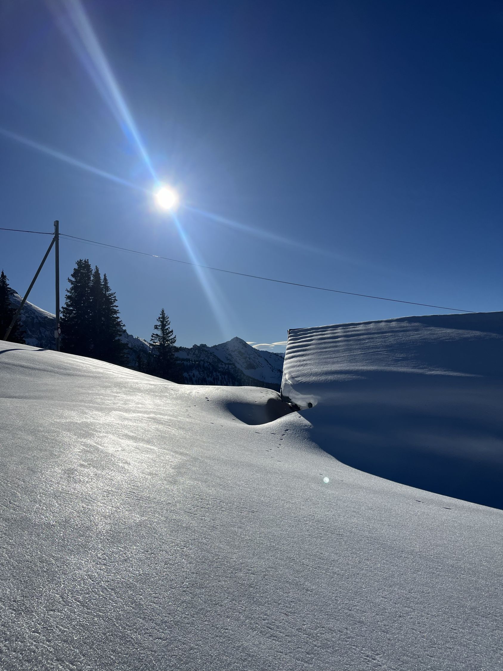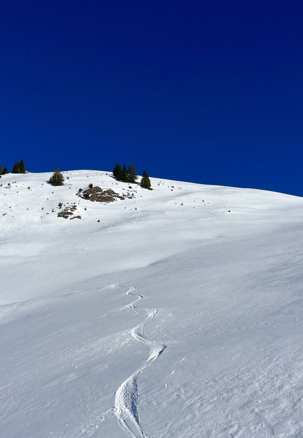 Traumhaft schönes Wetter, wenig Wind und angenehme Temperaturen. Bin mit dem Auto bis auf 1420m zur Kurve vom Gärsterewald gefahren. Ab dort hat es genügend Schnee. Ab 1600m hat es recht viel Schnee. Im unteren Teil hat es ein wenig Deckel, aber dann kommt schöner Pulverschnee. Habe das Timing recht gut erwischt und bin um 12.30 Uhr vom Gipfel abgefahren. An Sonnenhänge schon ein leichtes Sülzli auf guter Unterlage. Sehr schön zum fahren. Auch wenn das Türli etwas kürzer ausfällt, hat es sich gelohnt. Es war sonst niemand auf dem Gipfel. Ausser Spuren von Hasen, Füchse, Gemsen und Rehe, war ich allein.