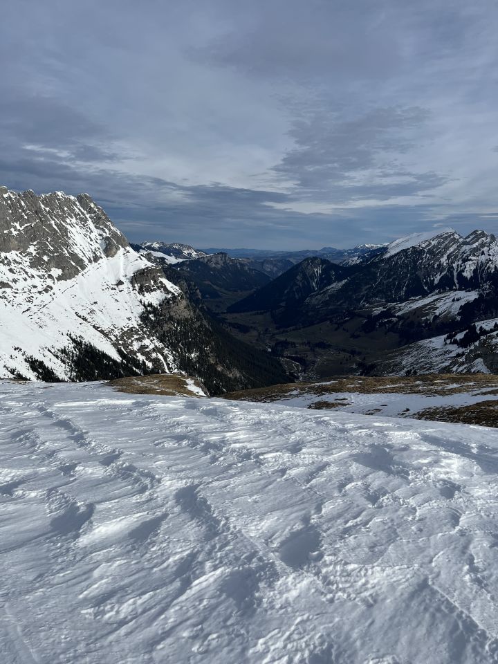 Schnee auf der ganzen Route ab Würzigrube. Vorher dünn und teilweise aper. Ab 1622 genug Schnee aber windbearbeitet, teilweise dünne Eisauflage und/oder hart. Abfahrt Chelli bruchharst.