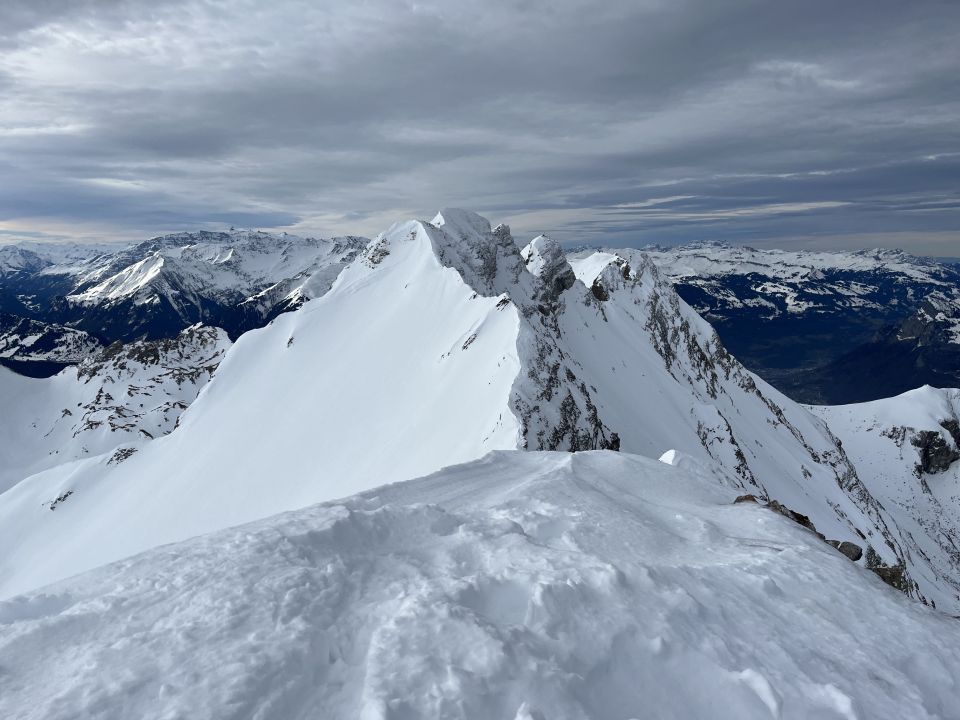 Wetter heute leider weniger sonnig als erwartet. Verhältnisse für Schneeschuhe gut (v.a. Aufstieg), für Ski eher „machbar“: Beton- Schnee von Steg bis Stürfis, danach aufgeweicht. Abstieg Alp Ijes: Tunneleingang komplett eingeschneit, Stäga von oben wenig einladend (halb aper), Engitobel ok.